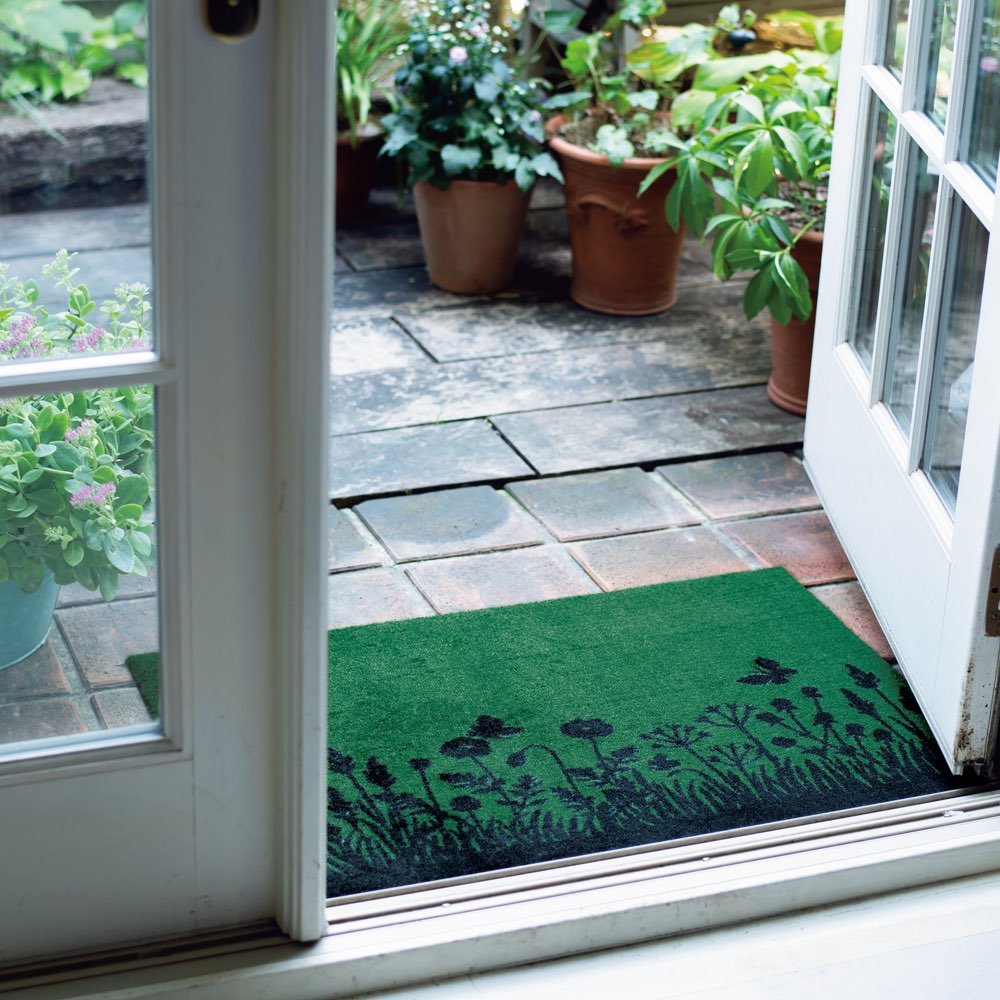 (ア)グリーン 75×120cm 玄関内側の土間で使うと、愛らしいメドウ柄が目に留まることでお出かけ時のワクワク感が一層高まります。