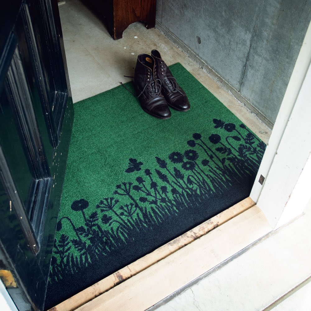 (ア)グリーン 75×120cm 玄関内側の土間で使うと、愛らしいメドウ柄が目に留まることでお出かけ時のワクワク感が一層高まります。