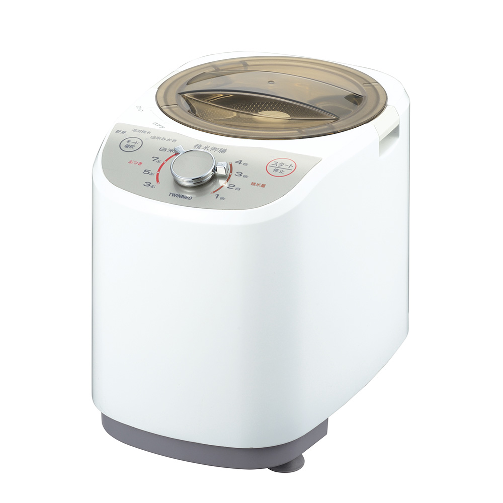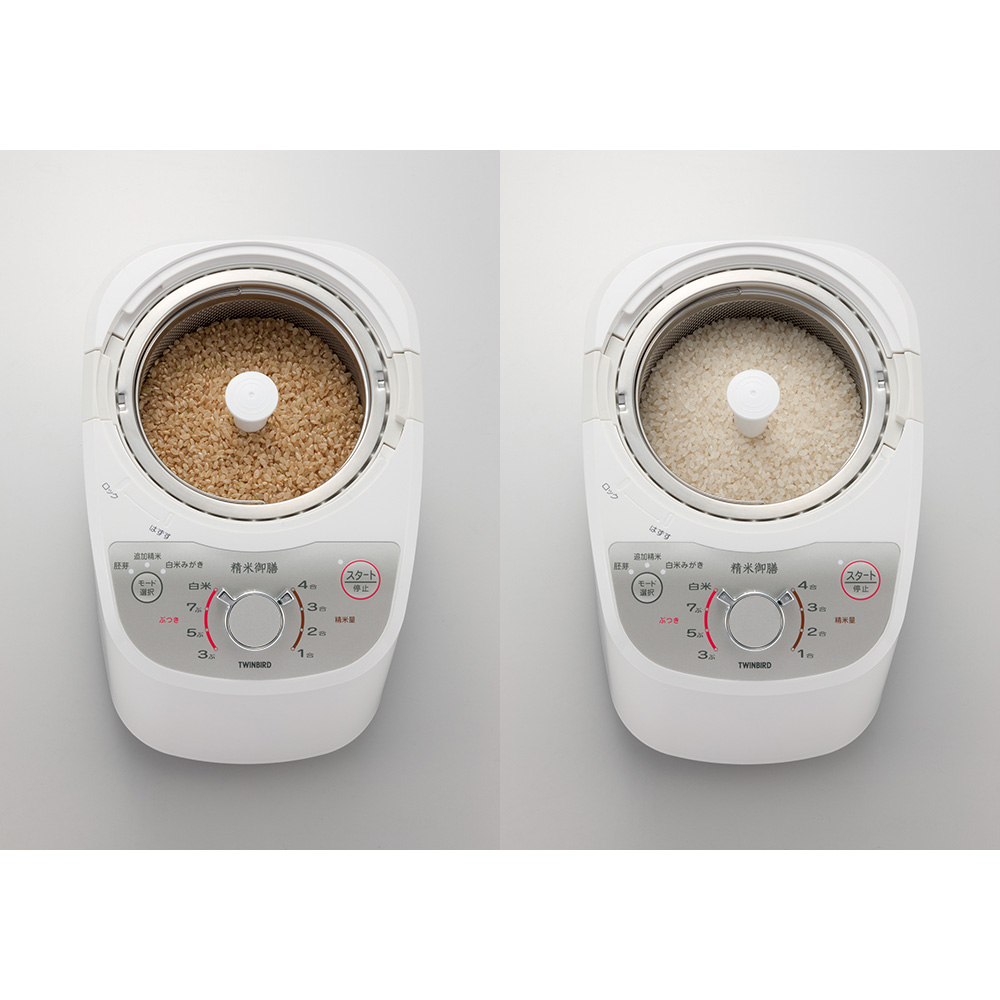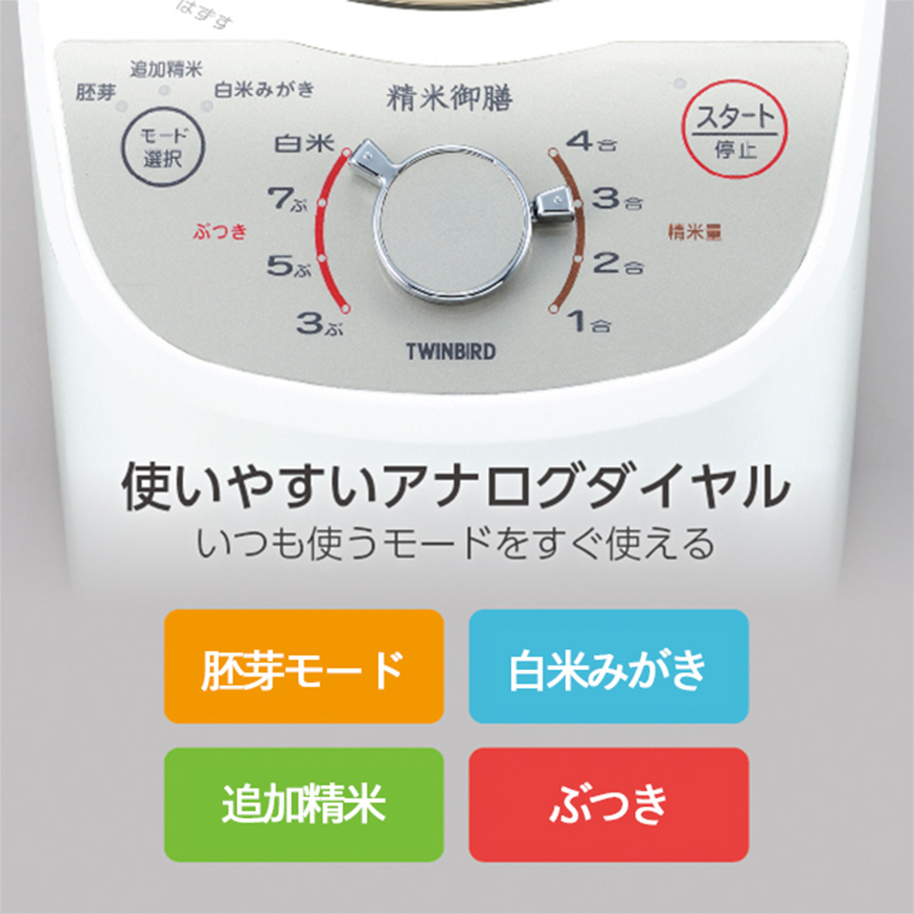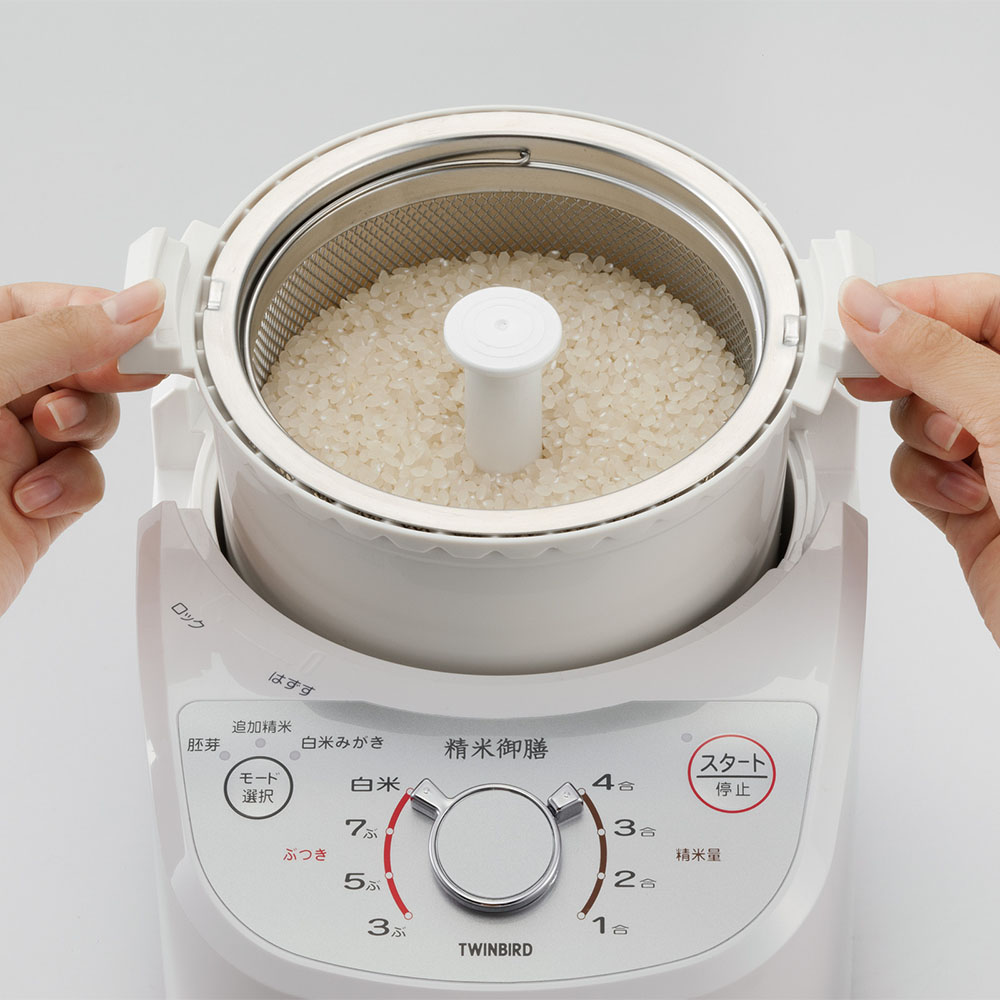 「コメどころ」新潟発の精米器。お米をおいしく食べるには玄米で保存し、毎日食べる分だけ精米するのが一番。家庭用精米器を使えば精米したてのおいしいお米を毎日手軽に味わえます。炊く直前の精米で、ごはんはもっとおいしく変わる。お米は白米の状態だと表面が日々酸化し、風味や粘り気が徐々に失われていきます。おいしく食べるには、玄米で保存し、毎日食べる分だけ精米するのが一番。家庭用精米器を使えば、精米したてのおいしいお米を毎日手軽に味わえます。おいしさに最適な、かくはん方式を採用。かくはん棒で、空気を巻き込みながらお米をやさしくかくはん。お米の温度上昇を防いで、精米したての風味を損ないません。4つの精米モードでおいしさいろいろ。使いやすいアナログダイヤルで設定もかんたんです。【ぶつきモード】栄養価が高くて玄米よりも食べやすいぶつき米ができます。お好みで3ぶ( ぬか層 30%除去 )・5ぶ( ぬか層 50%除去 )・7ぶ( ぬか層 70%除去 )の3段階から選択可能。【胚芽モード】白米に比べてお米の胚芽部分をできるだけ多く残した胚芽モードのお米ができます。胚芽モードのお米は、玄米やぶつき米よりも食べやすく、白米よりも栄養が豊富で健康的。【追加精米モード】お好みに合わせて追加精米することで、精米度の調節ができます。【白米みがきモード】古く酸化した白米の表面をみがいて、お米の美味しさをよみがえらせます。ぬかこぼれの心配がない精米かご・ぬかボックス同時取り出し構造糠ボックスは内容器一体で取り出せるので、お手入れ時の糠こぼれを防ぎます。精米かごは丸洗い可能お手入れのしやすい構造でいつでも清潔に保つことができます。安心の誤使用防止機能ぬかボックス付け忘れ防止構造や、ふたを外すと自動停止する機能で安心してお使いいただけます。米ぬかを活用して無駄なく。ぬか床に、肥料に、お掃除に。米ぬかを生活に役立つ活用ができるのも精米器ならではの楽しみ方です。