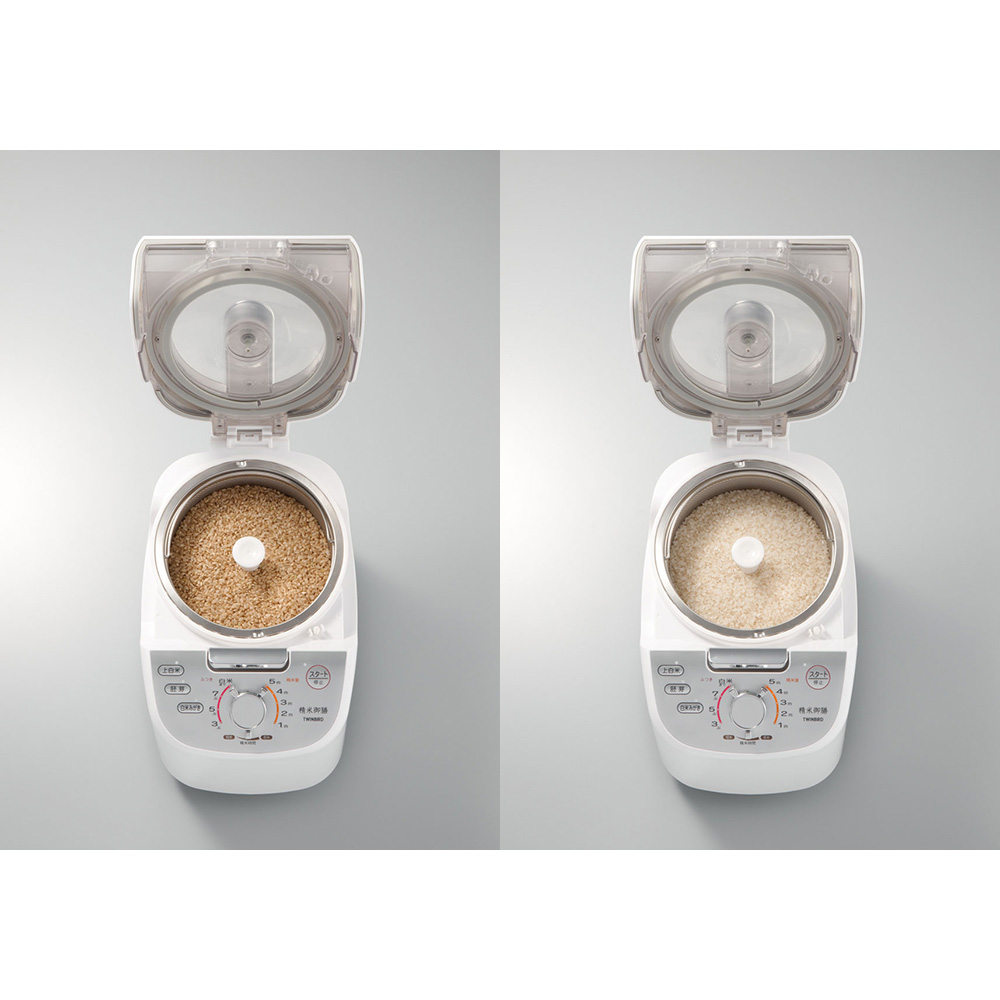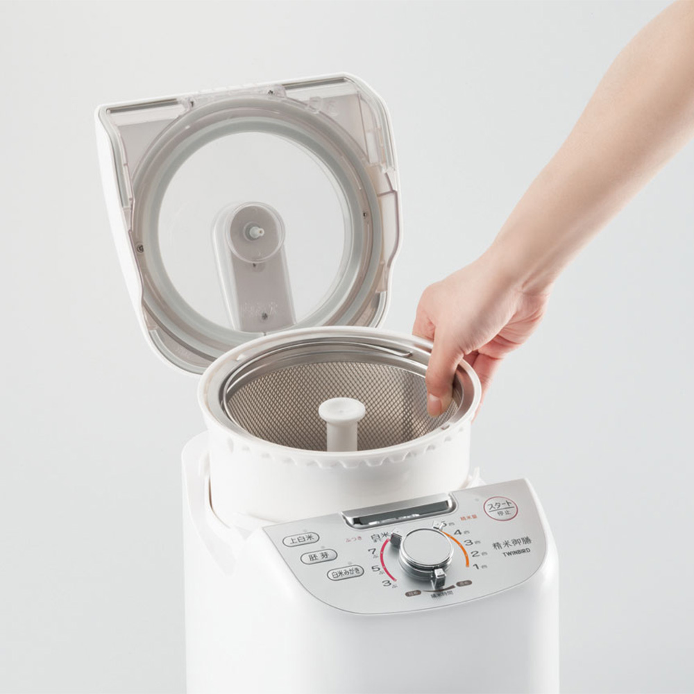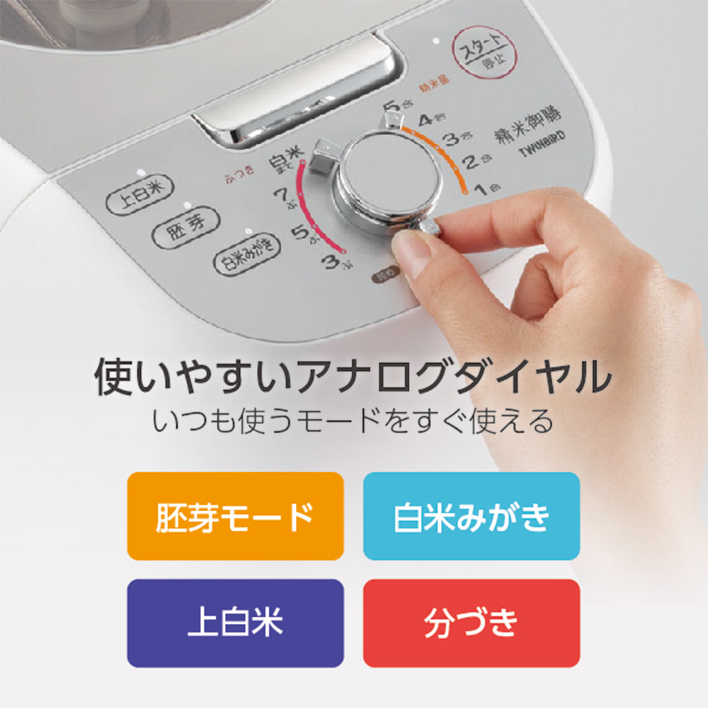 「コメどころ」新潟発の精米器。お米をおいしく食べるには玄米で保存し、毎日食べる分だけ精米するのが一番。家庭用精米器を使えば精米したてのおいしいお米を毎日手軽に味わえます。おいしさと静かさにこだわりました。炊く直前の精米で、ごはんはもっとおいしく変わる。お米は白米の状態だと表面が日々酸化し、風味や粘り気が徐々に失われていきます。おいしく食べるには、玄米で保存し、毎日食べる分だけ精米するのが一番。家庭用精米器を使えば、精米したてのおいしいお米を毎日手軽に味わえます。集合住宅や夜間でも気軽に使える静音設計「マンションなので音が気になって」「夜でも使えるような静かな精米器があったら」そんな声にお応えしようと粘りに粘りました。音の原因は精米音とモーターの駆動音。その二つの改善に挑むことで、従来品と比較して5dBも音量を抑えることに成功しました。おいしさに最適な、かくはん方式を採用。かくはん棒で、空気を巻き込みながらお米をやさしくかくはん。お米の温度上昇を防いで、精米したての風味を損ないません。4つの精米モードでおいしさいろいろ。使いやすいアナログダイヤルで設定もかんたんです。【ぶつきモード】栄養価が高くて玄米よりも食べやすいぶつき米ができます。お好みで3ぶ( ぬか層 30%除去 )・5ぶ( ぬか層 50%除去 )・7ぶ( ぬか層 70%除去 )の3段階から選択可能。【上白米モード】精米モードの白米よりもさらに多く精米します。ぬか層をしっかり落として精米しますので、炊き上がりの真っ白なお米に精米できます。【胚芽モード】白米に比べてお米の胚芽部分をできるだけ多く残した胚芽モードのお米ができます。胚芽モードのお米は、玄米やぶつき米よりも食べやすく、白米よりも栄養が豊富で健康的。【白米みがきモード】古く酸化した白米の表面をみがいて、お米の美味しさをよみがえらせます。ぬかこぼれの心配がない精米かご・ぬかボックス同時取り出し構造糠ボックスは内容器一体で取り出せるので、お手入れ時の糠こぼれを防ぎます。精米かごは丸洗い可能お手入れのしやすい構造でいつでも清潔に保つことができます。安心の誤使用防止機能ぬかボックス付け忘れ防止構造や、ふたを外すと自動停止する機能で安心してお使いいただけます。米ぬかを活用して無駄なく。ぬか床に、肥料に、お掃除に。米ぬかを生活に役立つ活用ができるのも精米器ならではの楽しみ方です。