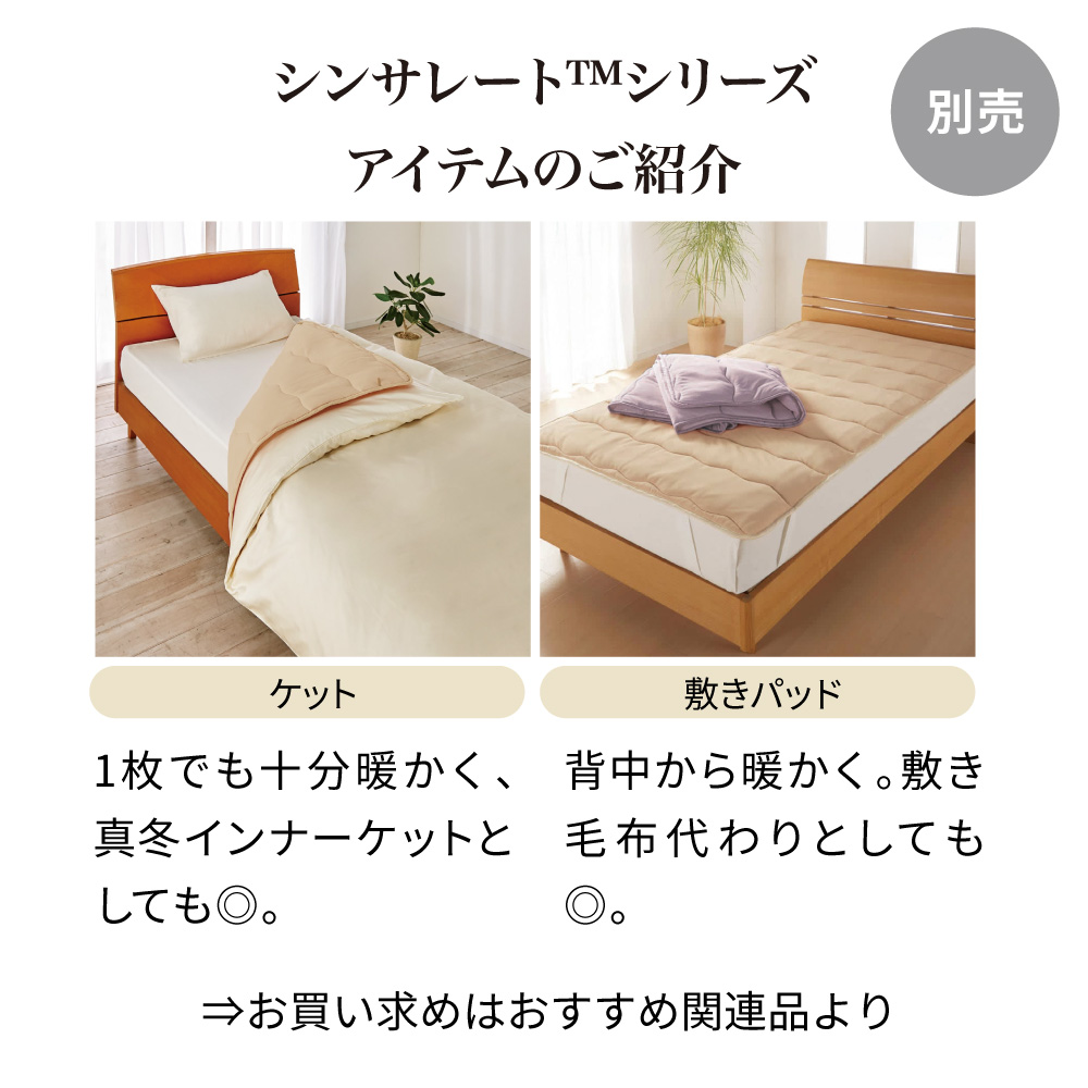 薄くて軽いのに、中わたの断熱効果による驚きの暖かさ!羽毛布団のニオイやお手入れの手間が気になるという方にもおすすめのシンサレート(TM)は、丈夫で毛羽やホコリが少ないのも特長。さらにディノスのシンサレート(TM)布団シリーズは花粉によるアレル物質・ハウスダストまで対策できる清潔仕様です。気候に合わせて1年中お使いいただけます。寒がりさんにも、デリケートさんにも、安心の眠りを羽毛布団の軽さと暖かさは魅力だけれど、独特のニオイやお手入れのしづらさが気になりませんか?そんなジレンマを打破するディノスのシンサレート(TM)布団シリーズは、軽くて暖かいことに加え花粉などのアレル物質・ハウスダストが気になる方にも安心してお使いいただける清潔仕様になっています。15年以上愛される続けるロングセラーディノスのシンサレート(TM)布団シリーズ。羽毛布団や毛布が苦手なあなたに、是非おすすめです。さらに2枚合わせタイプは、組み合わせで年中使えてコスパ◎季節に応じて暖かさを自由に調整!合い掛けと肌掛けのセットだから、それぞれ1枚でも、2枚重ねても使えてオールシーズン活躍します。オールシーズンちょうどいい暖かさ寒暖差のある春先や秋口は、合い掛け1枚で心地よく。夏はふんわり軽やかな肌掛け1枚で、エアコンによる冷え対策を。冬は2枚合わせで、冷え込む夜もぬくぬくの暖かさ。高機能中わたシンサレート(TM)が暖かい空気をキャッチ!3M社が研究・開発した薄型断熱素材。細く長い繊維が優れた断熱性を発揮することで、薄さ・軽さ・暖かさを叶えたテクノロジーです。複雑に絡み合った中わたの繊維が暖かい空気をたっぷり溜め込みます。この保温力の高さで冬の寒がりの方にも自信を持っておススメします。羽毛に匹敵する暖かさ!シンサレート(TM)わたは、薄くて軽いのに、羽毛に匹敵する暖かさと保温力。ヒマラヤ登山のウェアにも採用されている注目の素材です。保温性データではダウン率85%の冬用羽毛掛け布団を上回っていたという結果も。※JIS-L-1096A法(恒温法)にて、150×210cm・厚さ1cmのサンプル試料で保温性を比較。比較品はホワイトダック85%の羽毛布団。ボーケン品質機構調べ。お子様やアレル物質に敏感な方にもうれしい清潔仕様ディノスのシンサレート(TM)布団シリーズは東洋紡アルゲンブロック(R)加工を追加し、スギ花粉などのアレル物質を吸着除去※。※「除去」とは吸着したものを洗濯し、取り除いたことを指します。東洋紡調べわた切れによるホコリが出にくい繊維が丈夫だからホコリが出にくく、洗濯してもへたりにくく、風合いが長持ちします。計8ヶ所のループが付いているから、2枚の布団のズレを防いでくれます。まるごと洗濯・乾燥ができるので日々のお手入れが簡単です。いつでも気持ちよくお使いいただけます。