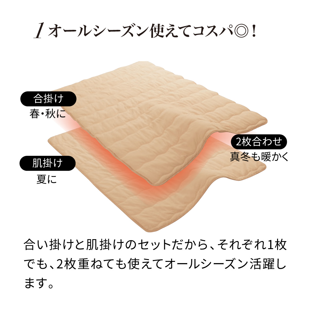 季節に応じて暖かさを自由に調整!合い掛けと肌掛けのセットだから、それぞれ1枚でも、2枚重ねても使えてオールシーズン活躍します。