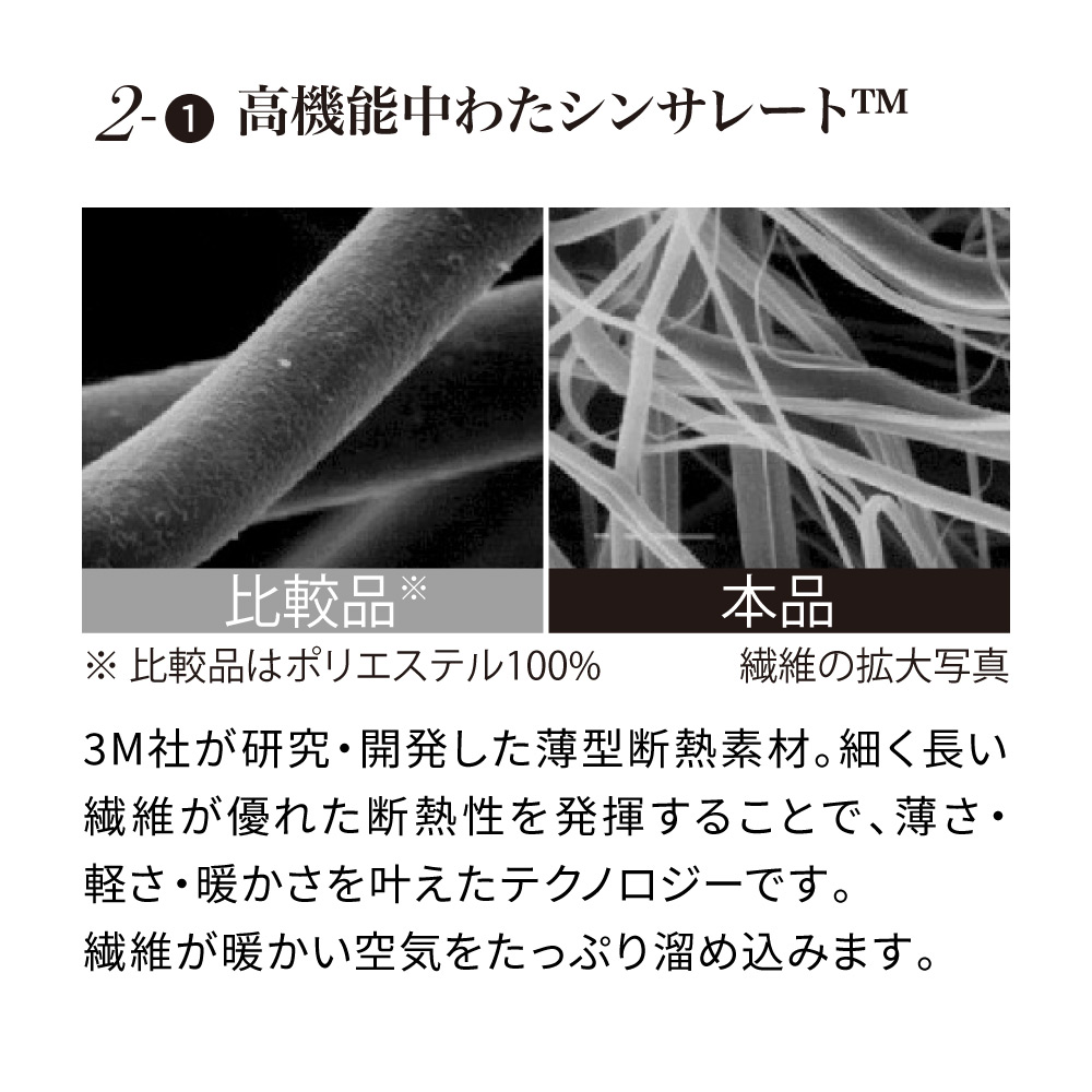 高機能中わたシンサレート(TM)が暖かい空気をキャッチ!3M社が研究・開発した薄型断熱素材。細く長い繊維が優れた断熱性を発揮することで、薄さ・軽さ・暖かさを叶えたテクノロジーです。複雑に絡み合った中わたの繊維が暖かい空気をたっぷり溜め込みます。この保温力の高さで冬の寒がりの方にも自信を持っておススメします。