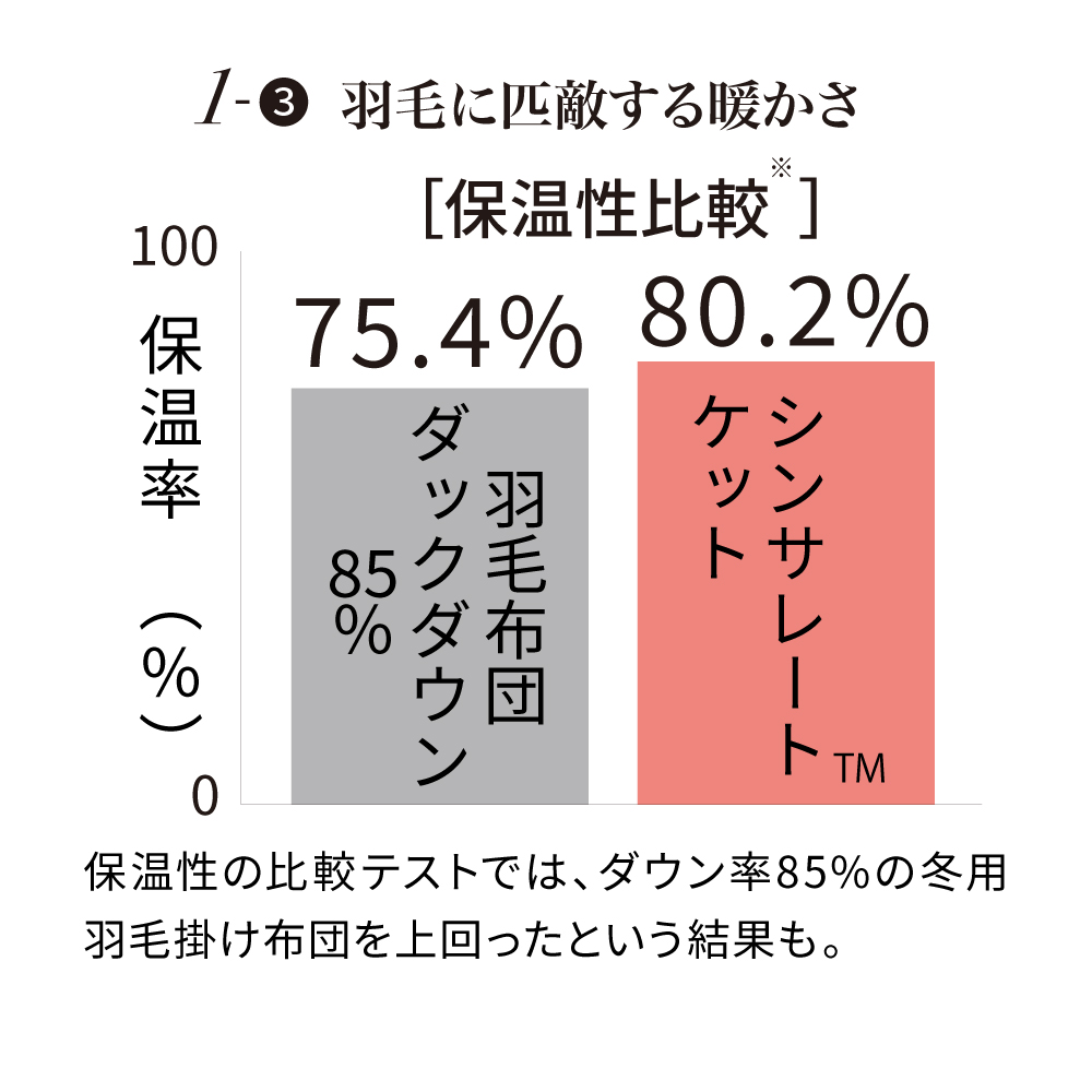 ※JIS-L-1096A法(恒温法)にて、150×210cm・厚さ1cmのサンプル試料で保温性を比較。比較品はホワイトダック85%の羽毛布団。ボーケン品質機構調べ。