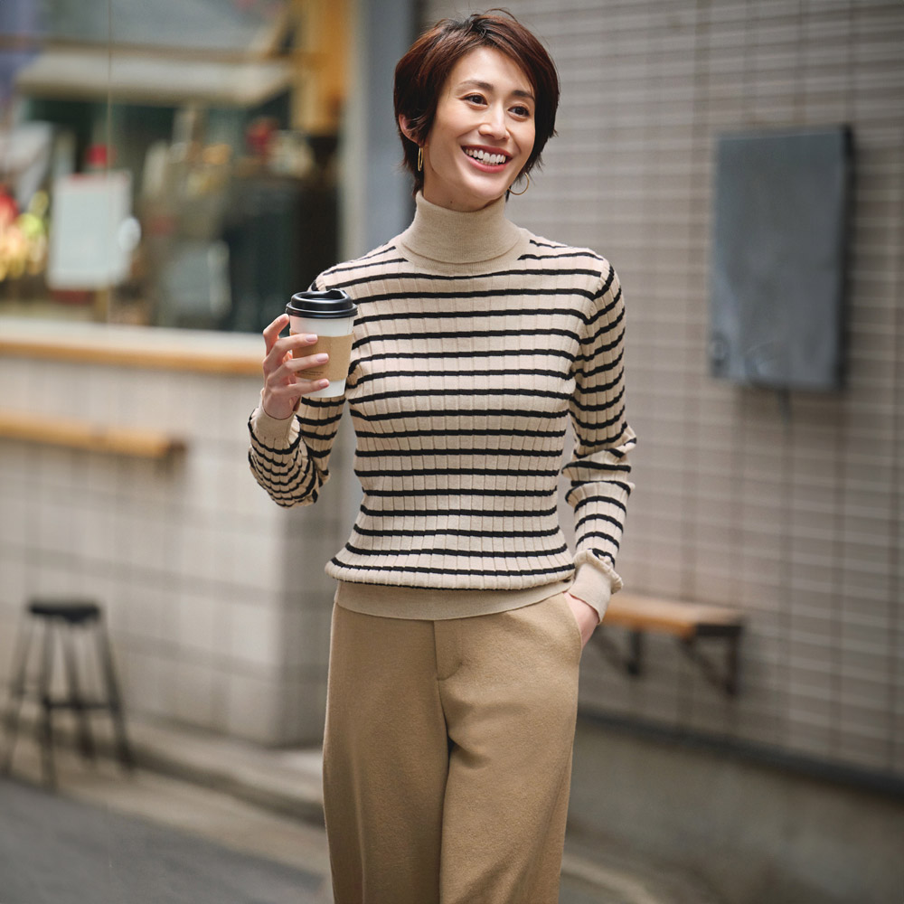 日常のお洒落に今どきのテイストをON街で着るのが似合う大人のヘルシーカジュアル毎日のスタイリングに欠かせない、程よくカジュアルで、どこかスポーティな旬の服。着映えはもちろん、親近感や好感度も手に入る、冬のマストハブをご用意しました。愛される理由は身体に張り付きすぎない絶妙リブにあり!「And」で約5年間にわたり人気を集め続けている、ワイドリブのタートルネックプルオーバーです。イタリア「Tollegno」社の繊細なエクストラファインメリノウール糸を使った編み地は、上品な光沢があって毛羽立ちが少なく、肌触りはごく滑らか。身体の線が出にくい立体的な太めのリブをベースに、首と袖口と裾は細いリブでメリハリを付けているため、一枚でも安心して着こなすことができます。新色のフューシャピンクを加えた全7色展開。