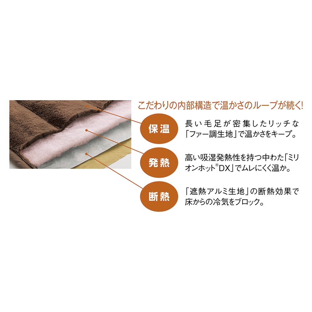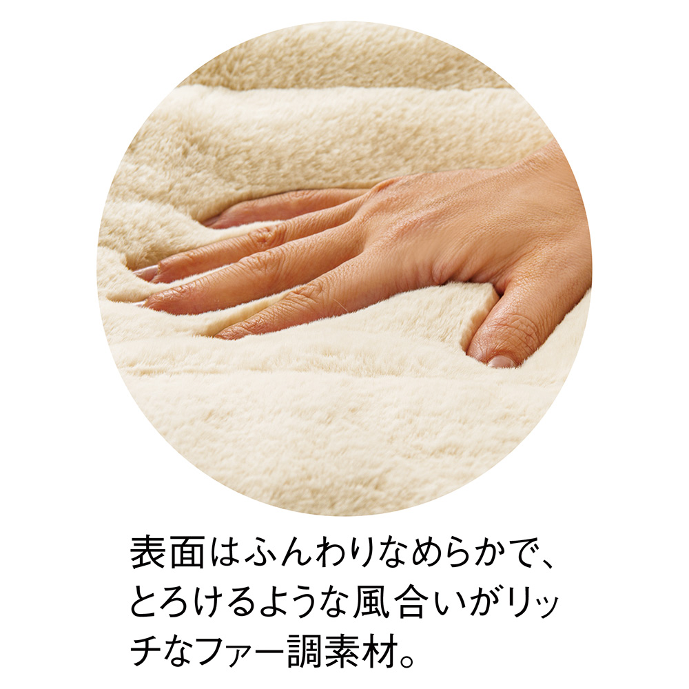 全国の寒がりさんから絶大な信頼を集める大人気寝具「ヒートループ(R)」が、ソファカバーになって登場!ヒートループ(R)が誇る驚きの温かさはそのままに、ファー調の素材で見た目も肌ざわりもとびきりリッチなファブリックに仕上げました。dinosだけで手に入る大注目のアイテムです!dinos大ヒット寝具「ヒートループ(R)」の温かさが冬インテリアに!快適なぬくぬく感が続く秘密は、ヒートループ(R)ならではの発熱→断熱→保温のトリプルあったか構造。寝具シリーズで大好評の温かさを、この冬のインテリアでもぜひ体感してください。風合いや色味もラグジュアリーなぬくもり感たっぷりで、お部屋が一気に幸せな冬仕様に。【ポイント】(1)温かさが連鎖する!こだわりの「ヒートループ(R)」構造(2)ファー調のリッチな肌ざわり(3)簡単着脱でアームまで温かなソファカバー【ポイント1】温かさが連鎖する!こだわりの「ヒートループ(R)」構造「発熱→断熱→保温」をループのように繰り返す、独自採用の「ヒートループ(R)構造」で快適な温かさをキープ。ファー調素材と組み合わせ、温かさも見た目もとびきりリッチなファブリックに仕立てました。<発熱>高い吸湿発熱性を持つ中わた「ミリオンホット(R)DX」でムレにくく温か。<断熱>「遮熱アルミ生地」の断熱効果により、床からの冷気をブロック。<保温>長い毛足が密集したリッチな「ファー調生地」が作り出す空気の保温層で温かさをキープ。【ポイント2】ファー調のリッチな肌ざわり表面はふんわりなめらかで、とろけるような風合いがリッチなファー調素材。ずっと撫でていたくなるような魅惑のふわふわ感です。大人インテリアに馴染む落ち着いたトーンの4色展開で、見た目も肌ざわりもほっこり温か。【ポイント3】簡単着脱でアームまで温かなソファカバー掛けるだけの簡単着脱で、様々なタイプのソファに使いやすいソファカバー。足元までふっくら温かで、アームもカバーできるのでゴロ寝も気持ちいい。お手持ちのソファに1枚掛けるだけで、お部屋が一気に冬仕様に!