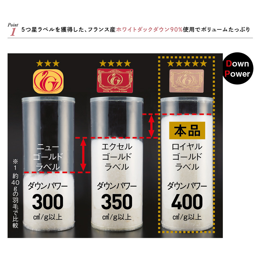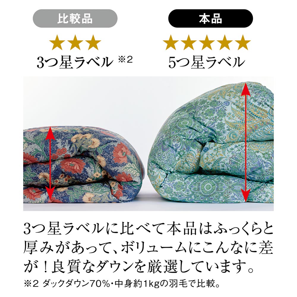素材にも仕立てにもとことんこだわり、国内工場で一枚ずつ丁寧に仕立てた渾身作をお届けし、毎年大好評をいただいている「フランス産5ツ星羽毛掛け布団」のお得な2枚組です。クオリティには一切妥協せずコストをギリギリまでセーブ!羽毛工場が閑散期となる春〜夏に製造することで、クオリティには一切妥協せずコストをギリギリまでセーブしました。素材にも仕立てにもこだわり抜き、国内工場で丁寧に仕立てています。5つ星ラベルを獲得した「フランス産高級羽毛」を厳選同じ重量でも、ダウンボールが大きく上質な羽毛ほどボリュームがあります。本品は世界的に有名な羽毛の産地・フランス産の上質なホワイトダックダウン厳選しました。あたたかな空気をたっぷり溜め込む、ふわふわで大きい羽毛(ダウンボール)で、保温性、吸湿・発散性に優れる上質ダウンです。その上質ダウンをたっぷり90%も使用しました。「羽毛布団」と呼ばれるのはダウン50%以上ですので、比べてもその贅沢さが分かります。本品は高品質を約束する5つ星・ロイヤルゴールドラベルを取得しており、その品質はお墨付き。ボリューミーであたたかな空気をたっぷり含むので、とても温かいのに軽やかな寝心地です。※ダウンパワーは400cm3/g以上(かさ高165〜175mm相当)となります。羽毛がつぶれずふっくら!暖気が逃げにくい立体キルト羽毛をつぶすことなく、キルト部分から暖気を逃しにくい立体キルトを採用。ふっくらとした羽毛の良さを引き立てます。衿元ふっくらの特殊構造衿元は特殊製法で縫い目をなくし、襟元をふっくら丸く仕上げることでボリュームアップ。首から肩口まで隙間なく、いつもぬくぬくです。50万枚以上の製造実績を持つ国内工場で丁寧に仕立てた、信頼の日本製これまで50万枚以上の羽毛布団を手がけてきた技と実績、さらに良質な羽毛に蒸気を当ててさらにふわふわにする「パワーアップ加工」を行うことができる、国内でも稀少な工場を厳選。一流の品物を作っている職人の技を用い、一枚一枚丁寧に作られています。■準備数について今回準備数:シングル…各色500枚 ダブル…各色50枚短い期間で大量に生産できないため、ご注文が準備数を超えた場合はお待ちいただくことがございます。※準備数は単品販売との合算数になります。