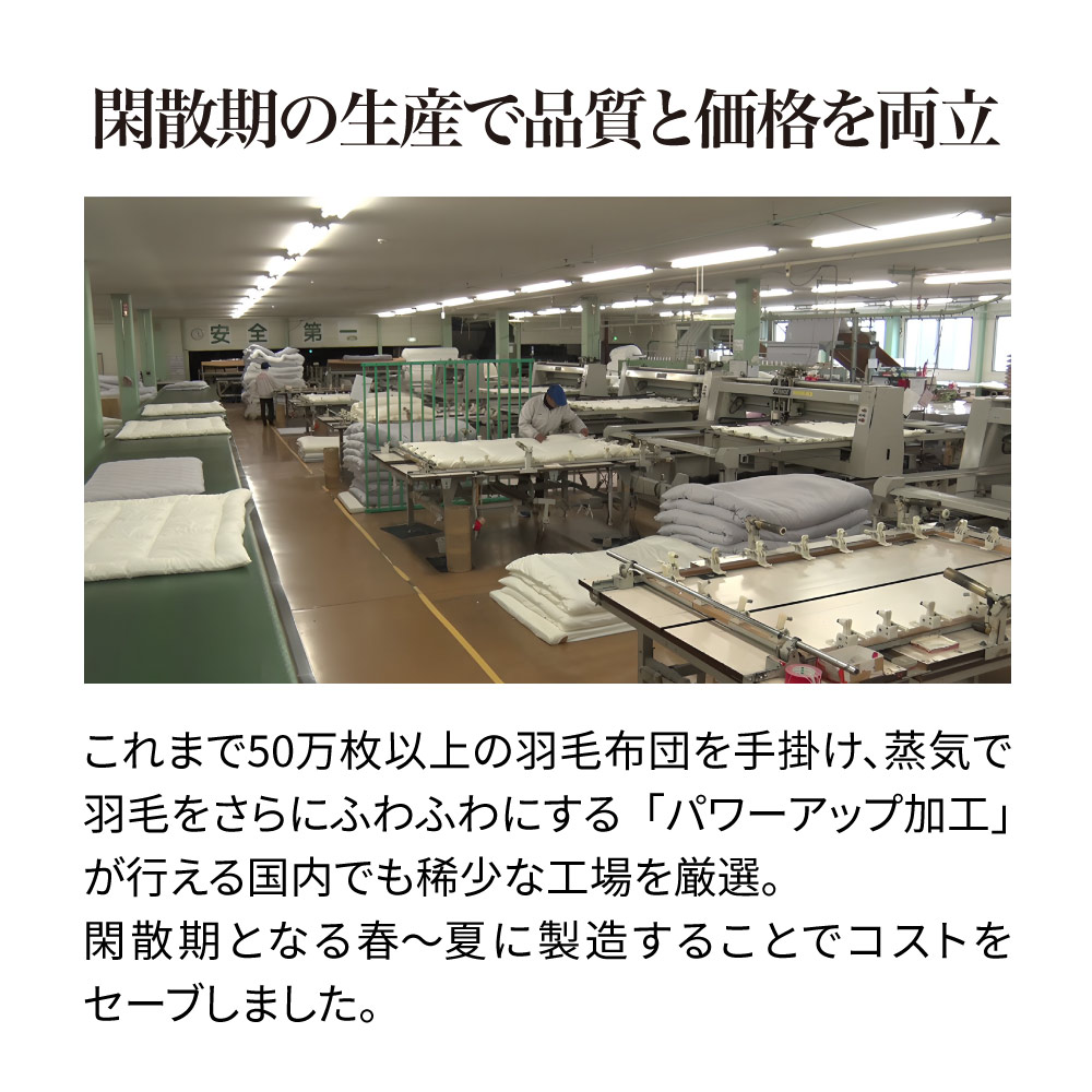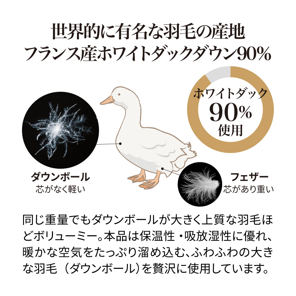 素材にも仕立てにもとことんこだわり、国内工場で一枚ずつ丁寧に仕立てた渾身作をお届けし、毎年大好評をいただいている「フランス産5ツ星羽毛掛け布団」。羽毛の市場価格高騰が続く中、本当によい品を少しでもお求めやすく。