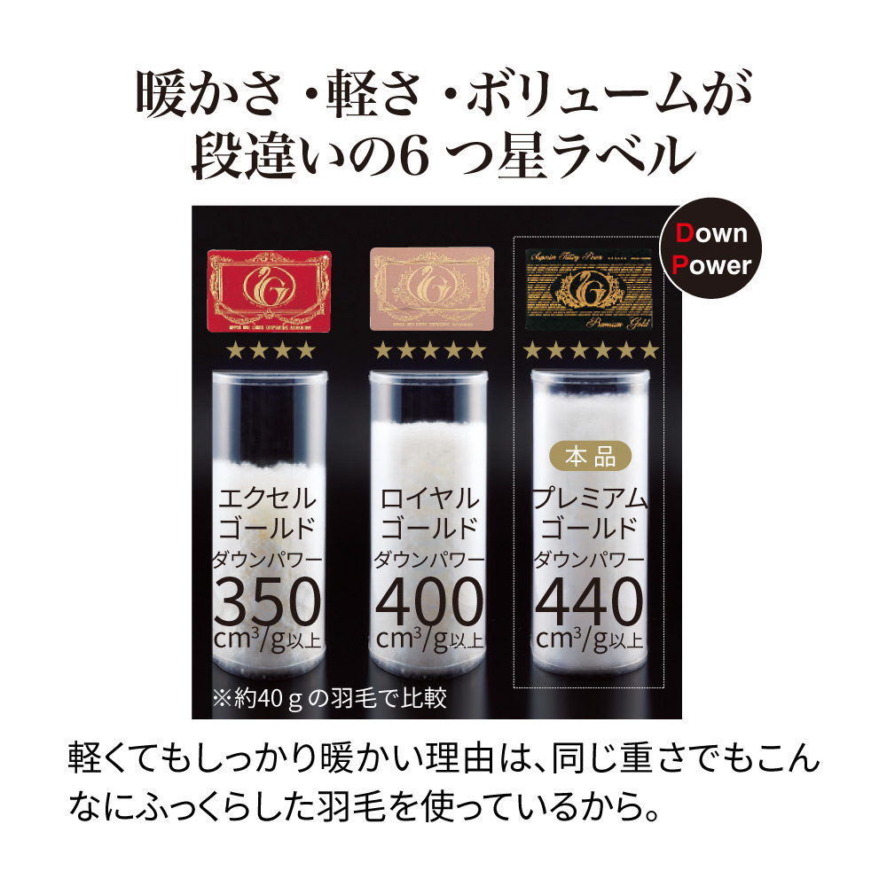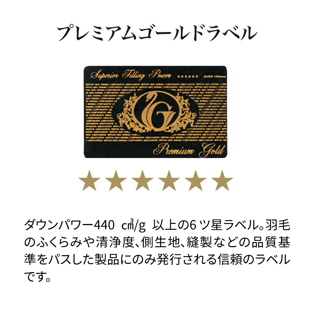 羽毛の中でも最高品質を誇る貴重なポーランド産マザーグースを惜しみなく使い、国内で丁寧に仕立て。とっておきの軽さと暖かさを持つプレミアムな羽毛布団をこの破格でご提供できるのは、羽毛の急激な値上がり前にこの希少な原料を確保できたから。この特別な機会を、ぜひお見逃しなく。最上位ラベル6つ星の羽毛布団が、特別なお値段であなたの元へこの冬、自信を持ってご紹介したいのが、こちらのプレミアムな羽毛布団。世界でも指折りの羽毛の産地ポーランドで大切に育まれたマザーグースダウンを贅沢に使い、日本の熟練の職人が心を込めて仕立てました。羽毛の価格が高騰する前に原料を確保できたからこそ実現したこの特別な機会を、どうぞお見逃しなく。羽毛の名産地ポーランド産マザーグースダウンの秘密恵まれた大自然が育む、とびきり上質な羽毛。冬には厳しく冷え込み、夏には暑くなる、寒暖差の激しいポーランドの地。そんな厳しい自然の中で、のびのびと、そして時間をかけて大切に育てられたマザーグースは、自らの体を守るために、あたたかなダウンを蓄えるのだそうです。この地で生まれた羽毛は、一つ一つがしっかりとしていて、驚くほどの品質と丈夫さを備えています。ゆっくりと成熟したダウンが叶える、とびきりの暖かさこの羽毛布団に使われているのは「契約農場で2年以上もの歳月をかけて、じっくりと育てられた成熟したマザーグース」のダウン。一般的なグースよりも飼育期間が長く、ポーランド国内でも、その生産量はわずか5%にも満たないと言われるほど、本当に稀少なもの。時間をかけてゆっくりと成長するからこそ、ダウンボールは大きく、まるで綿毛のようにふっくらと育つのです。その成熟した、大きなダウンボールを、なんと93%も贅沢に使いました。大きさも暖かさも段違いのダウンボールダウンボールが大きいほど、その細やかな羽枝が複雑に絡み合い、たくさんの暖かい空気をぎゅっと閉じ込めてくれます。一般的なダックダウンの、およそ2倍もの大きさを誇るマザーグースダウンの保温力は、まさに別格。ふんわり、そして、もっちり。まるで雲のような心地よさ大きく成長したダウンボールは、長くしなやかな羽枝を広げ、それが複雑に絡み合うことで、弾力性と豊かなボリュームを生み出します。またあたたかさを溜めこみ、ふんわりもっちりとしたまるで雲のような掛け心地を生み出します。最高位ランク「プレミアムゴールドラベル」が語る、確かな品質この羽毛布団は、厳格な品質基準をクリアした製品だけに与えられる「プレミアムゴールドラベル」を取得しています。中でも、ダウンパワー440?/gという最高評価の「6ツ星」ラベルは、羽毛のふくらみ、清らかさなど、細部にわたる徹底した品質管理の証です。どこまでも暖かく、そして快適に同じ重さの他のラベルの羽毛と比べても、このマザーグースダウンは驚くほどふっくらと膨らみます。だから軽やかな掛け心地なのに、じんわりと暖まるのです。さらに、羽毛がもともと持っている、天然の吸放湿性によって、布団の中はいつもサラリと快適。心地よい眠りを邪魔しない、ストレスフリーな掛け心地をぜひ体験してください。暖かさをずっと閉じ込める「立体2層構造」の工夫布団の中央に、もう一枚生地を挟んだ「二重キルト」という特別な構造を採用しました。これによって、中の羽毛が片寄ることなく、布団全体が均一にふっくらと保たれます。また、布団と体の間にすき間ができにくくなるので、肩口や足元から暖かな空気が逃げてしまうのを防いでくれるのです。