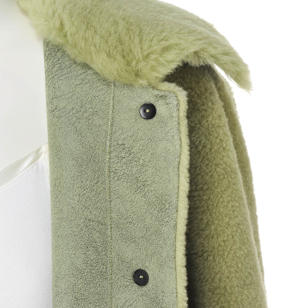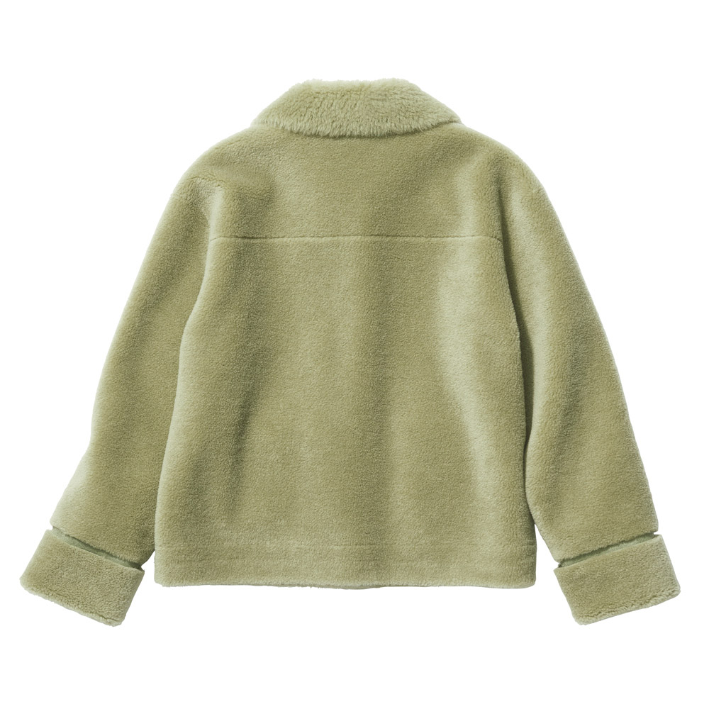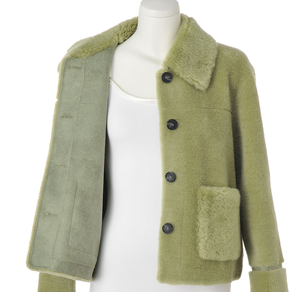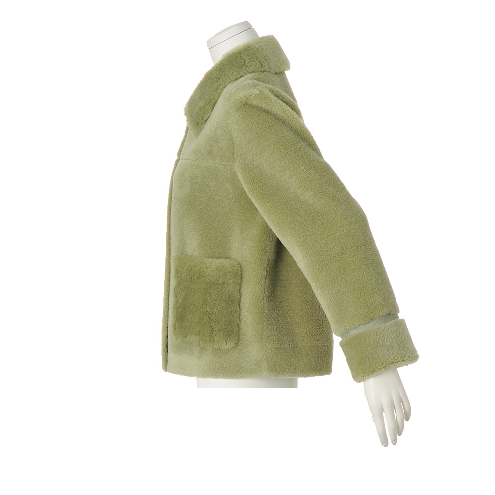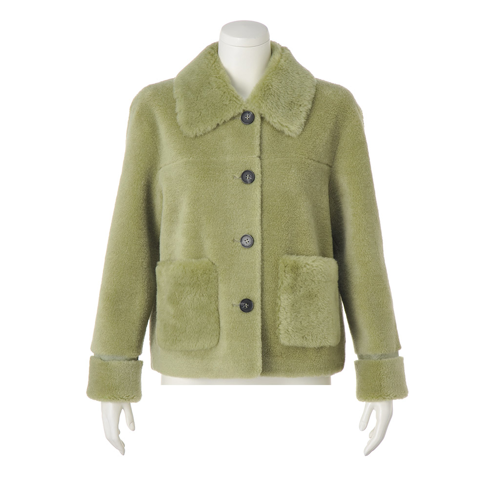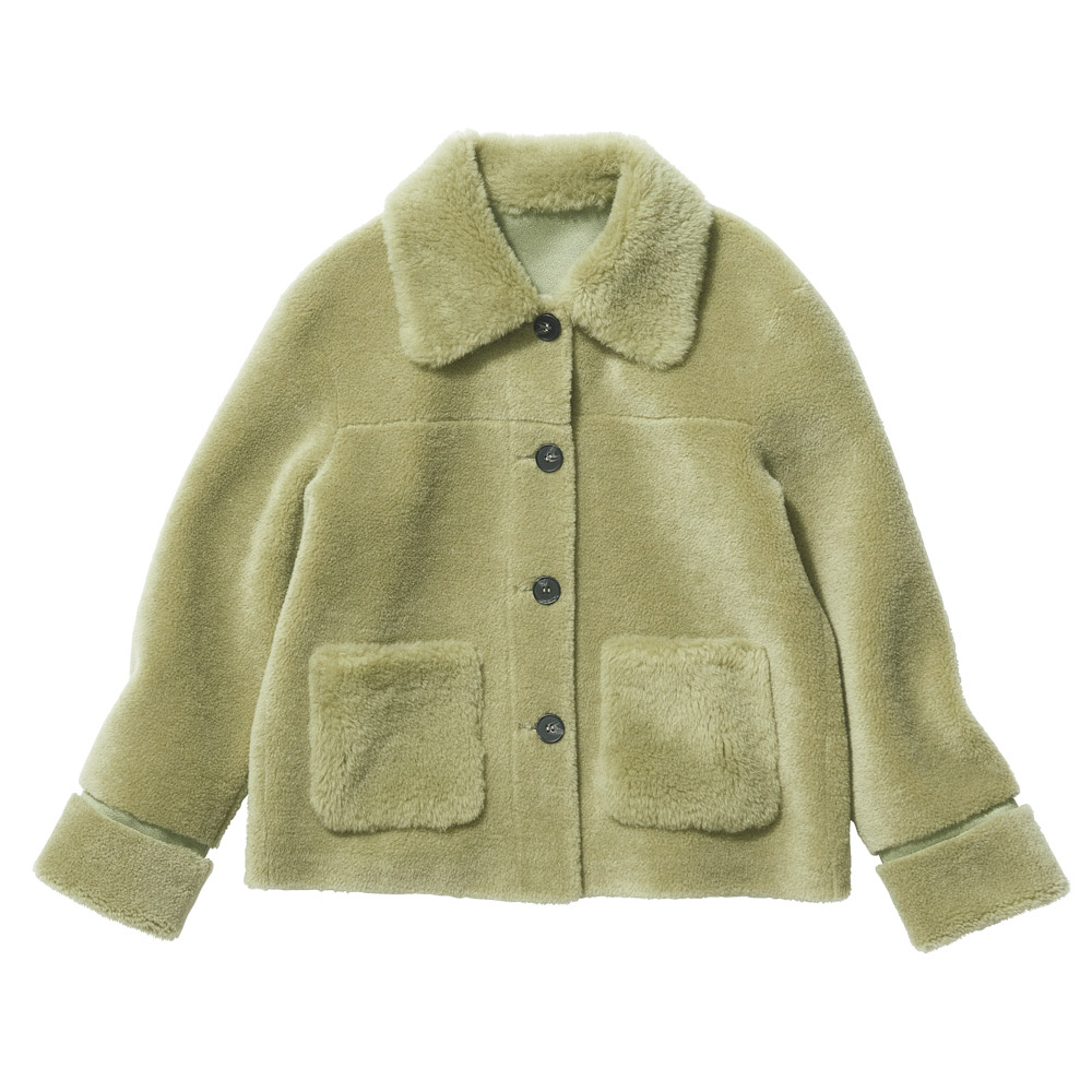 Winter RELAX STYLE冬の日がときめく、プレシャスな温もり外出が億劫な冬も、素敵な一着があればアクティブに過ごせる――。身に纏えば気分も印象もアップする、温もり仕立てのデイリースタイルをご紹介します。香ばしくスイートなピスタチオを薫らせてファー面はウール、裏側に人工スエードを使った本物そっくりのフェイクムートン。身頃は短毛、ポケットと襟は毛足のあるファーで暖かなコントラストを描きました。ムートン専門工場で作っているから、仕立ての美しさはお墨付き。水牛調ボタンやロールアップカフス、瑞々しいピスタチオカラーも好印象。