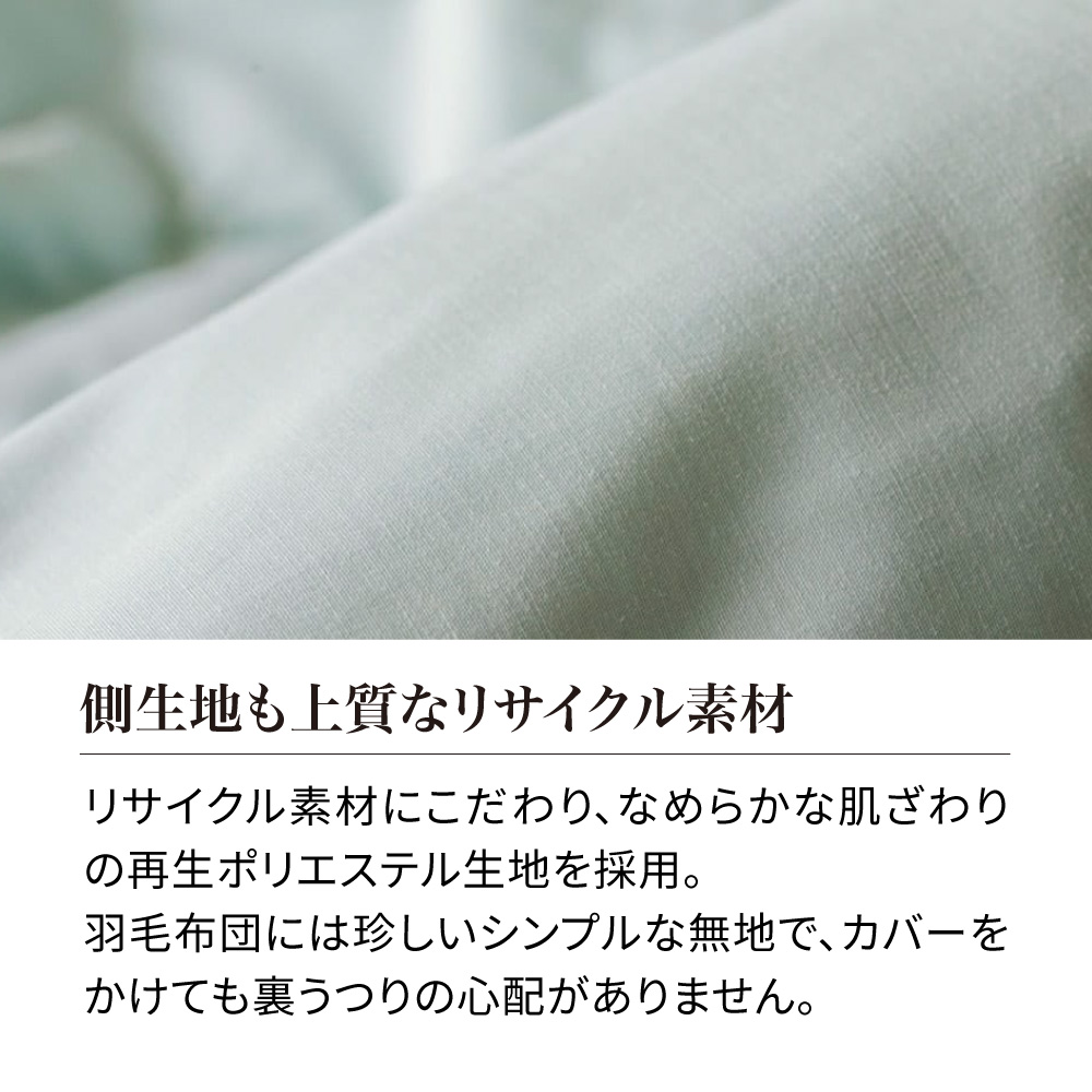 羽毛布団には珍しいシンプルな無地の側生地で、カバーをかけても裏うつりの心配がありません。