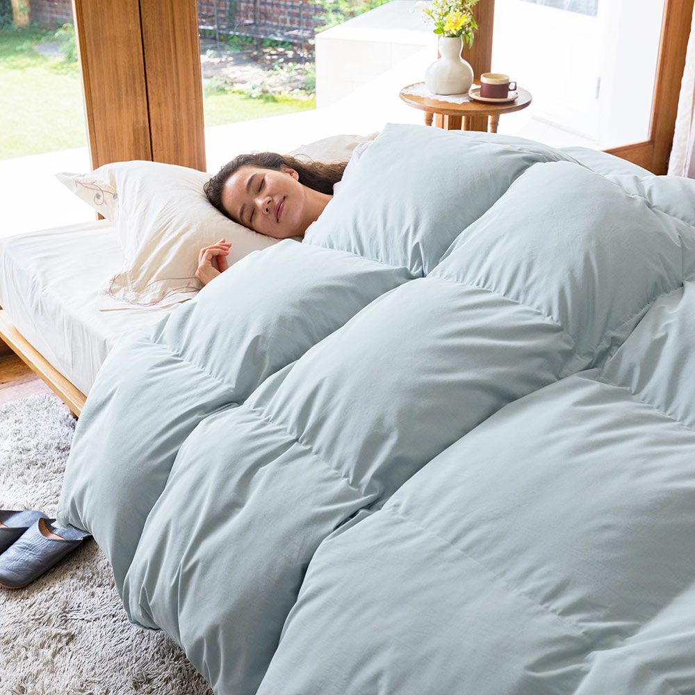 羽毛布団には珍しいシンプルな無地の側生地で、カバーをかけても裏うつりの心配がありません。