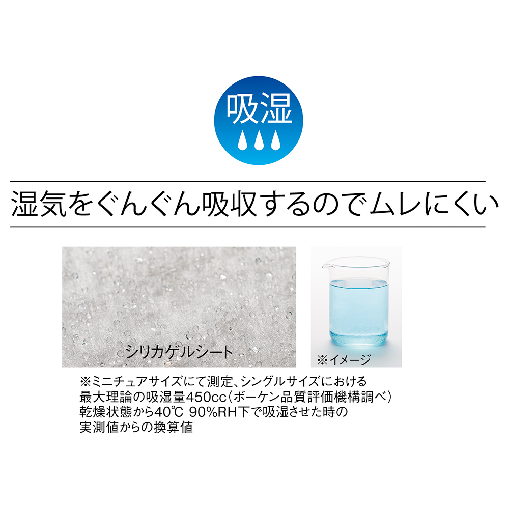 夏の寝具は「湿度」もポイント。シリカゲルシートがコップ約1杯分の湿気をぐんぐん吸収するのでムレにくい。