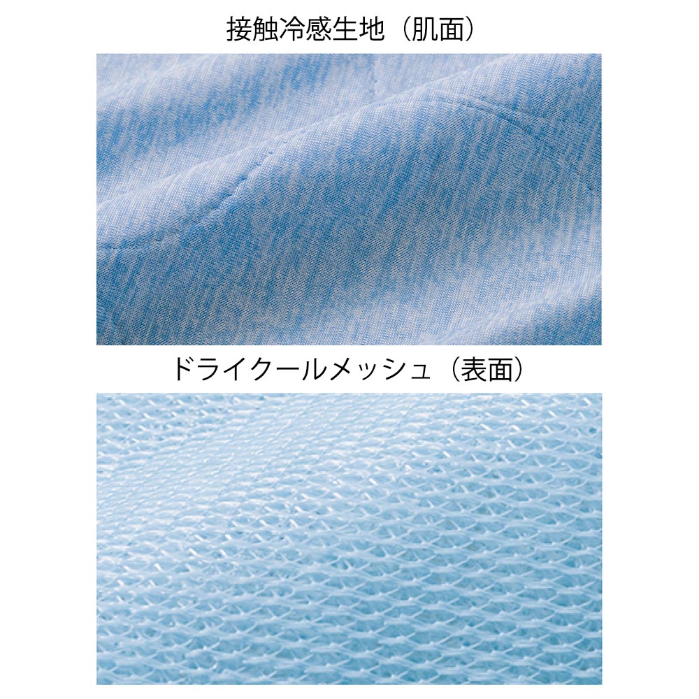 ケットの生地拡大。肌に当たる面は冷感素材でひんやり。表面は熱を逃がしやすく、とても柔らかなメッシュ素材。