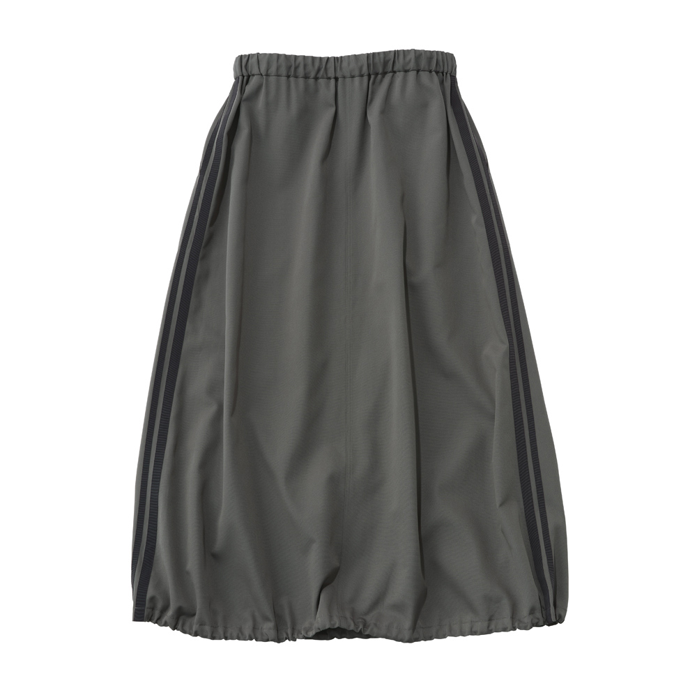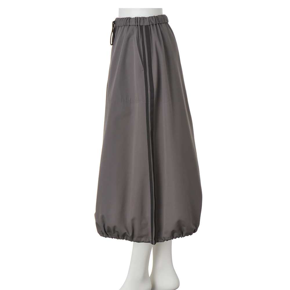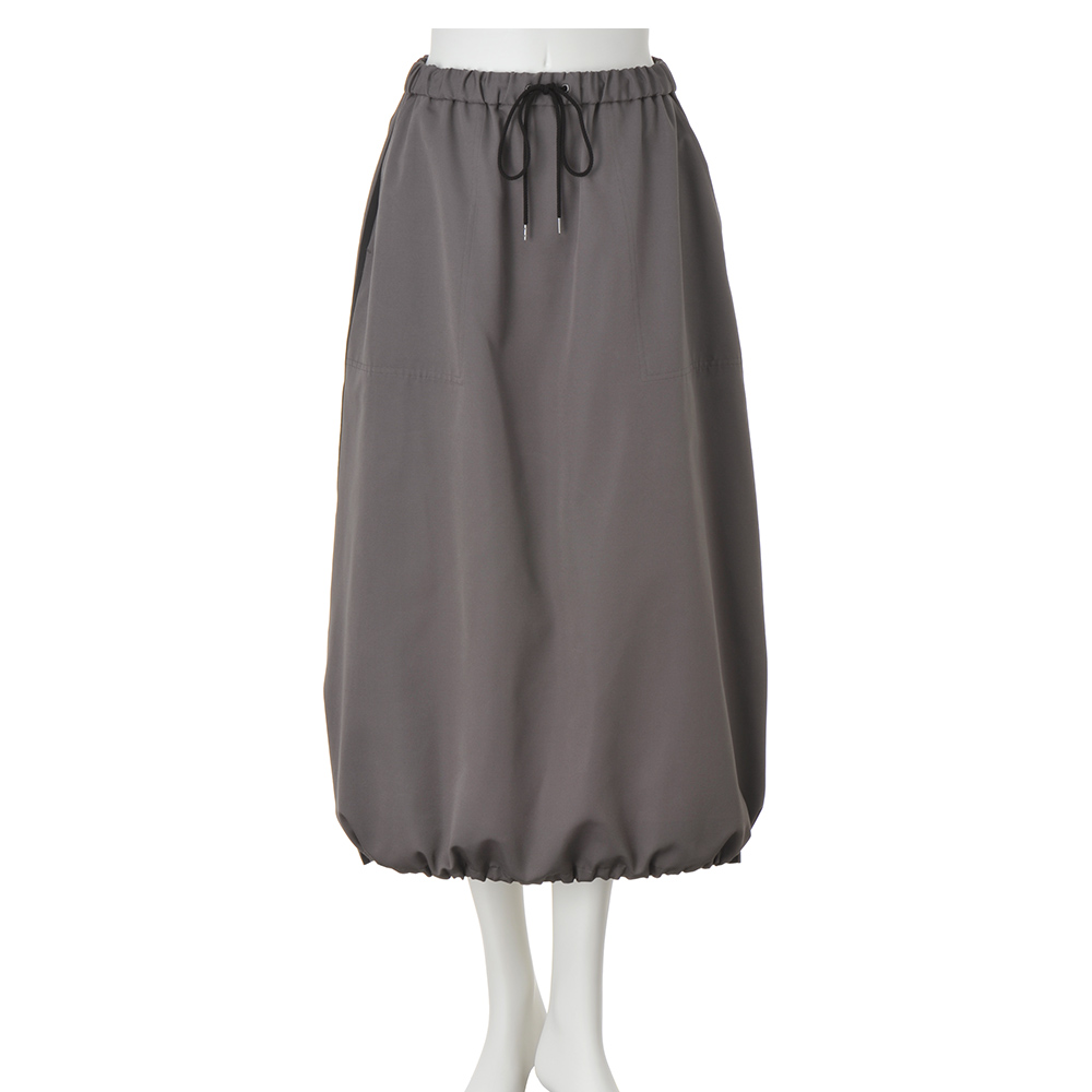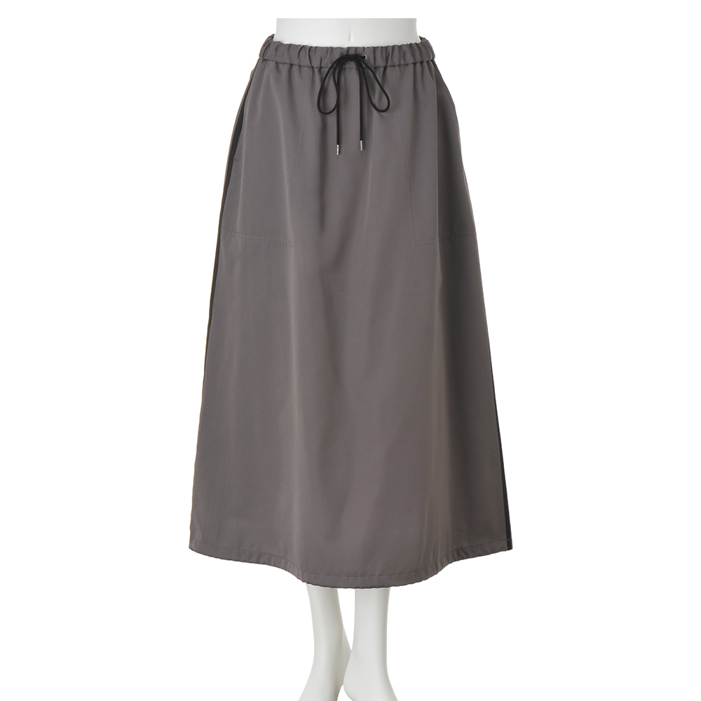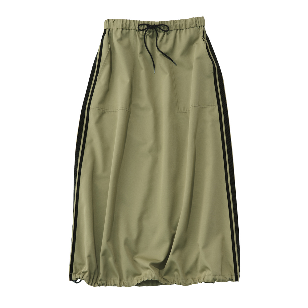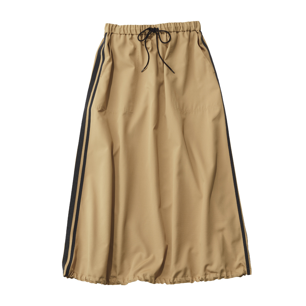 ACTIVE CHIC in Summerスポーティムードで足取りまで軽やかに!街にすっかり定着したスポーティなアイテムは、今や大人のデイリーシーンに欠かせない存在。軽くて快適な素材やライン使いなど、今季も今すぐ着たくなる服が続々!「スポーティ×華やか」の絶妙なミックス感が決め手。光沢とハリがある生地を用いた、軽い一枚仕立てのスカートも人気継続アイテム。両脇に幅違いのグログランラインを入れ、裾はゴムコードでバルーンシルエットに調節できる作りです。≫POINTウエストはゴム+ヒモ仕様。裾のゴムで形をアレンジでき、内側に絞ったゴムを留めるストラップつき。モカグレー、ライトカーキ、キャメルベージュの全3色。