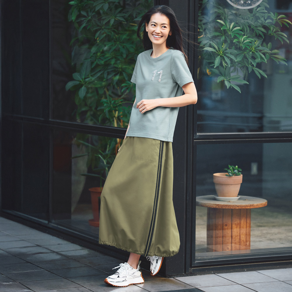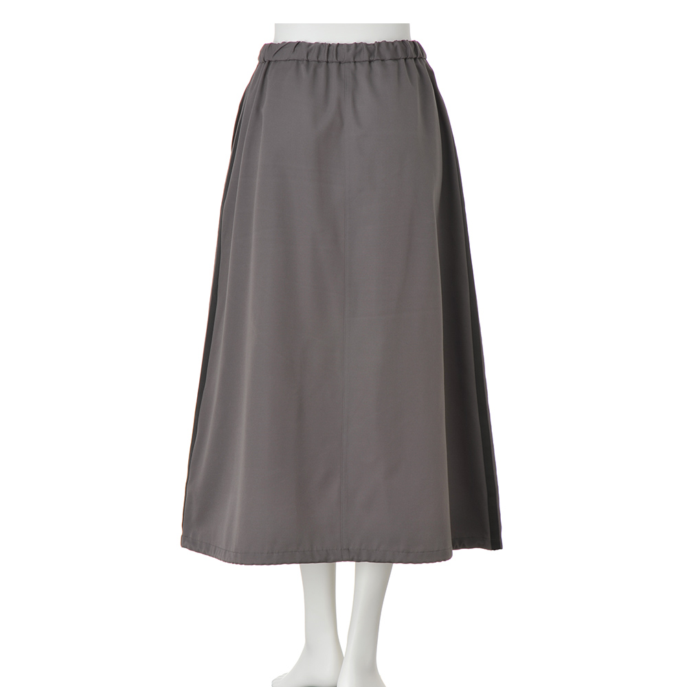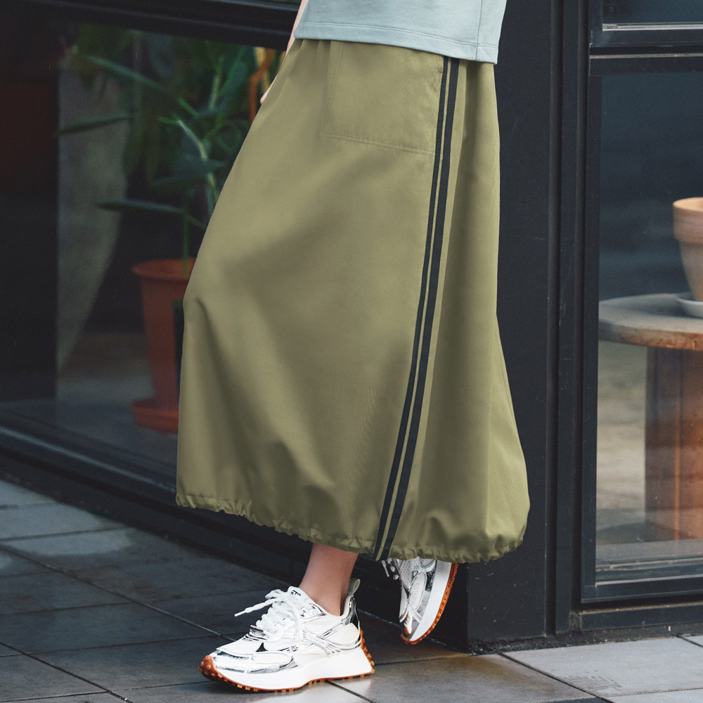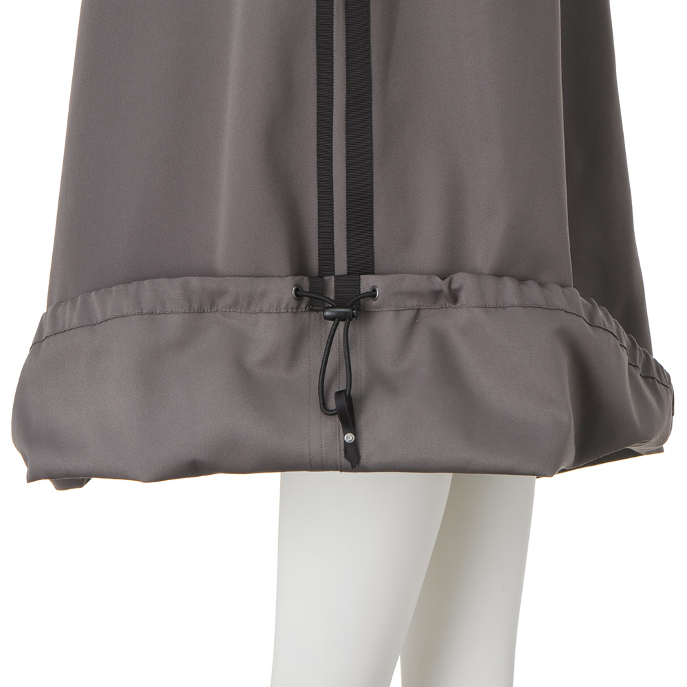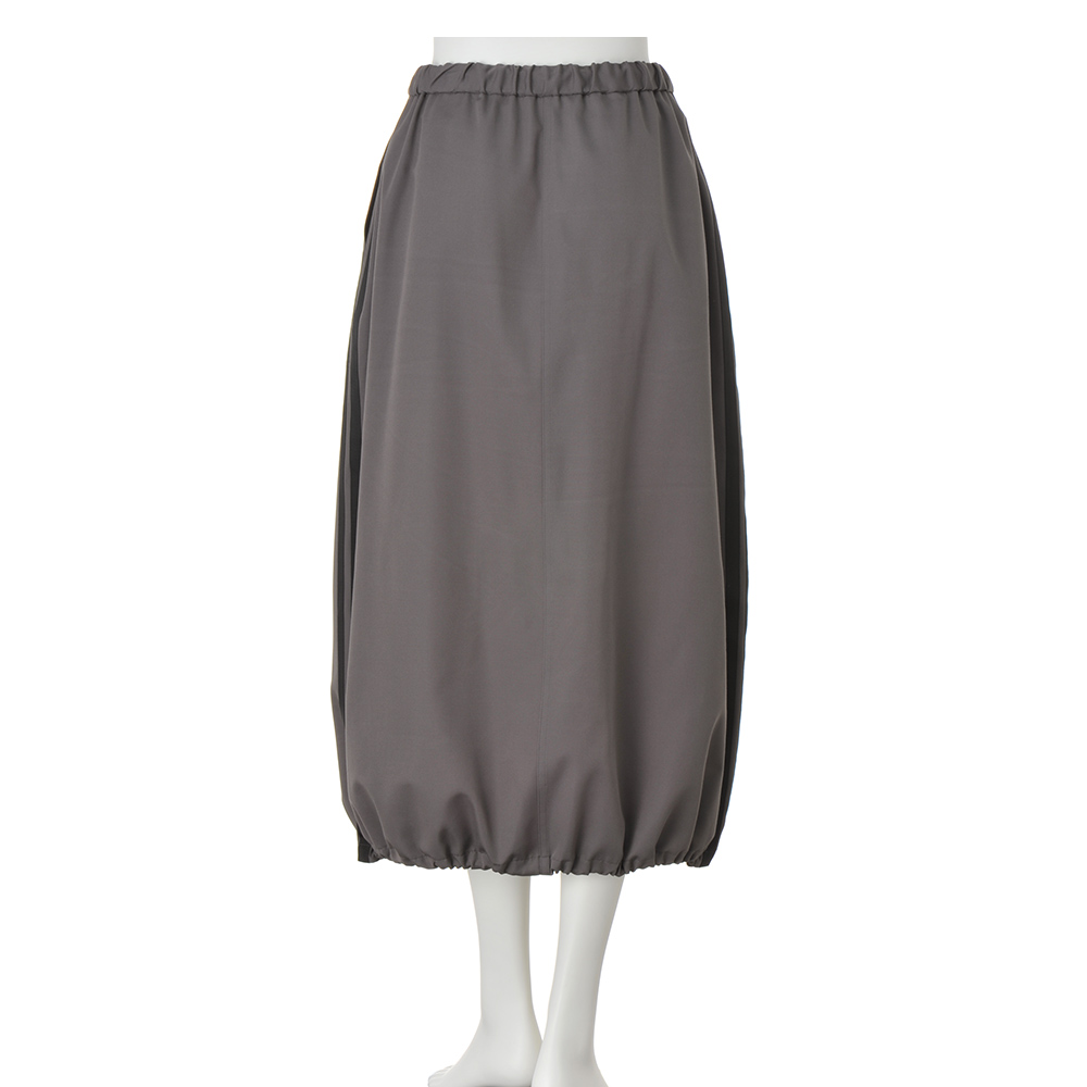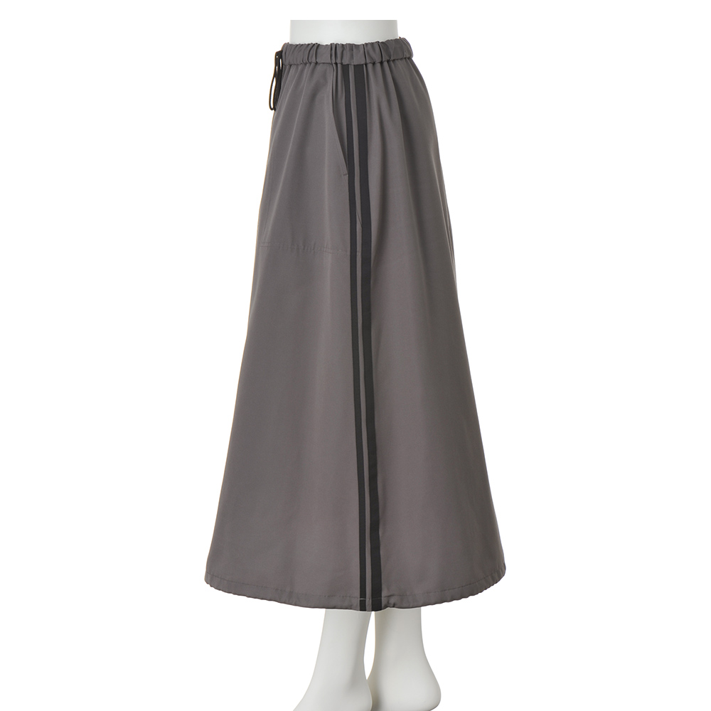 ACTIVE CHIC in Summerスポーティムードで足取りまで軽やかに!街にすっかり定着したスポーティなアイテムは、今や大人のデイリーシーンに欠かせない存在。軽くて快適な素材やライン使いなど、今季も今すぐ着たくなる服が続々!「スポーティ×華やか」の絶妙なミックス感が決め手。光沢とハリがある生地を用いた、軽い一枚仕立てのスカートも人気継続アイテム。両脇に幅違いのグログランラインを入れ、裾はゴムコードでバルーンシルエットに調節できる作りです。≫POINTウエストはゴム+ヒモ仕様。裾のゴムで形をアレンジでき、内側に絞ったゴムを留めるストラップつき。モカグレー、ライトカーキ、キャメルベージュの全3色。