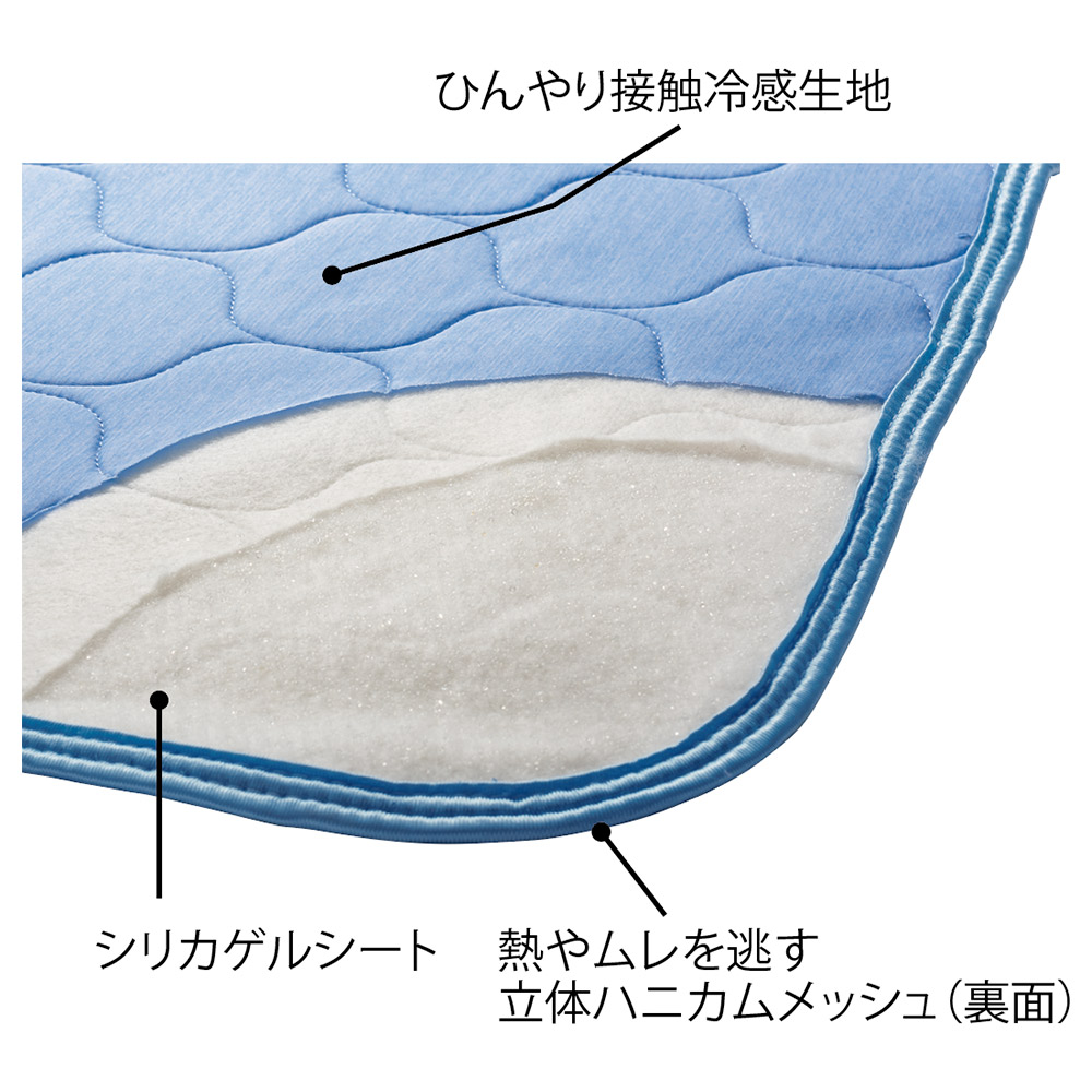 キリッと冷たく、サラッと爽やか。真夏の眠りのクールな相棒。冷感・除湿力・通気性を持つ3層構造の敷きパッドです。キリッと冷たく、サラッと爽やか。真夏の眠りのクールな相棒。さらなるひんやり感と寝心地の良さを求めてディノスが素材を厳選した夏にイチオシの敷きパッドです。同シリーズのケットと合わせれば涼しさますますUP!エアコンの設定温度温度を下げずに済むから節電にもお役立ち。涼しさを生む多層構造。冷感・除湿力・通気性を持つ機能素材の3層構造。お使いの寝具に1枚プラスするだけで、夏の眠りがぐんと涼しく快適に!ひんやり接触冷感生地。表面はひんやり気持ちい冷感素材。極細糸を高密度に織り上げた生地なので、頬ずりしたくなるようなサラサラの肌ざわり。ふれた瞬間から素早く涼しく。熱が湿気がこもりがちな背中をひんやりクールダウン!たった5分で表面温度が下がっているのがわかります。夏の寝具は「湿度」もポイント。湿気をぐんぐん吸収するのでムレにくい。人は一晩にコップ1杯ほどの汗をかくといわれ、湿気でジメジメしがちです。コールドメッシュならシリカゲルシートがシングルサイズでコップ約1杯分の水分※をしっかり吸収し、ジメッと蒸し暑い時期もサラっと爽やか。吸湿だけでなく放湿もするので、洗って干せば繰り返し使えます。 ※ミニチュアサイズにて測定。シングルサイズにおける最大理論の吸湿量450cc(ボーケン品質評価機構調べ)乾燥状態から40℃ 90%RHで吸湿させた時の実測値からの換算値気になる汗のニオイも吸収。キルトに使用した消臭糸が、汗のニオイを消臭。爽やかな寝心地が続きます。爽やかなブルーとお部屋になじみやすいライトグレーの2色展開。