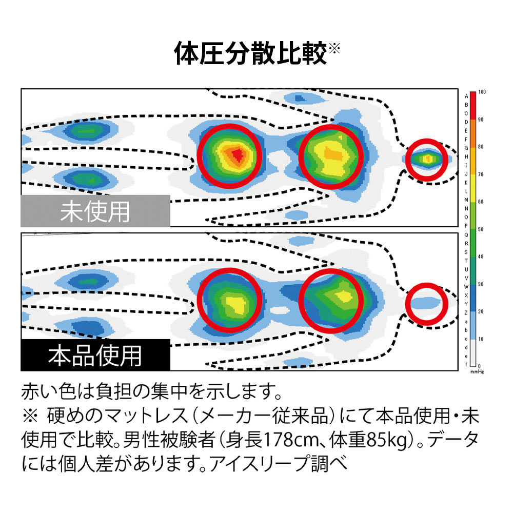 硬めのマットレスに本品を敷いて比較。圧力の集中が改善していることが分かります。
