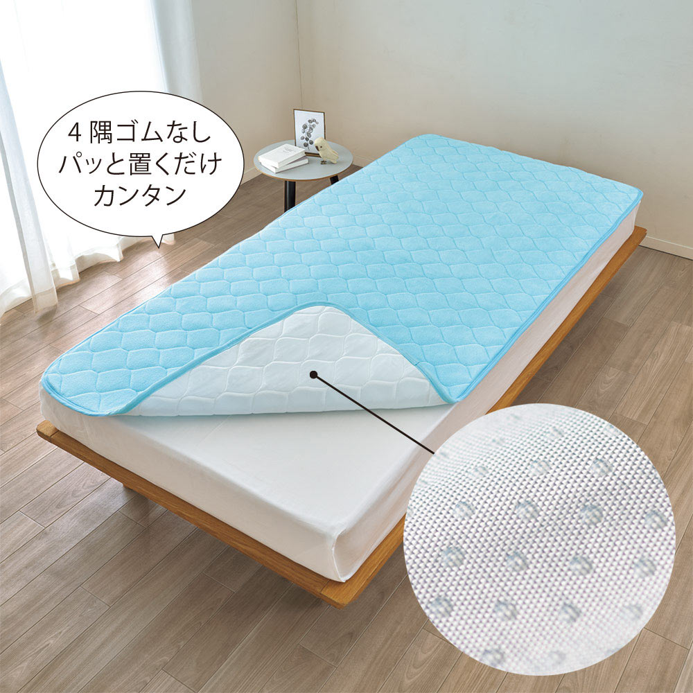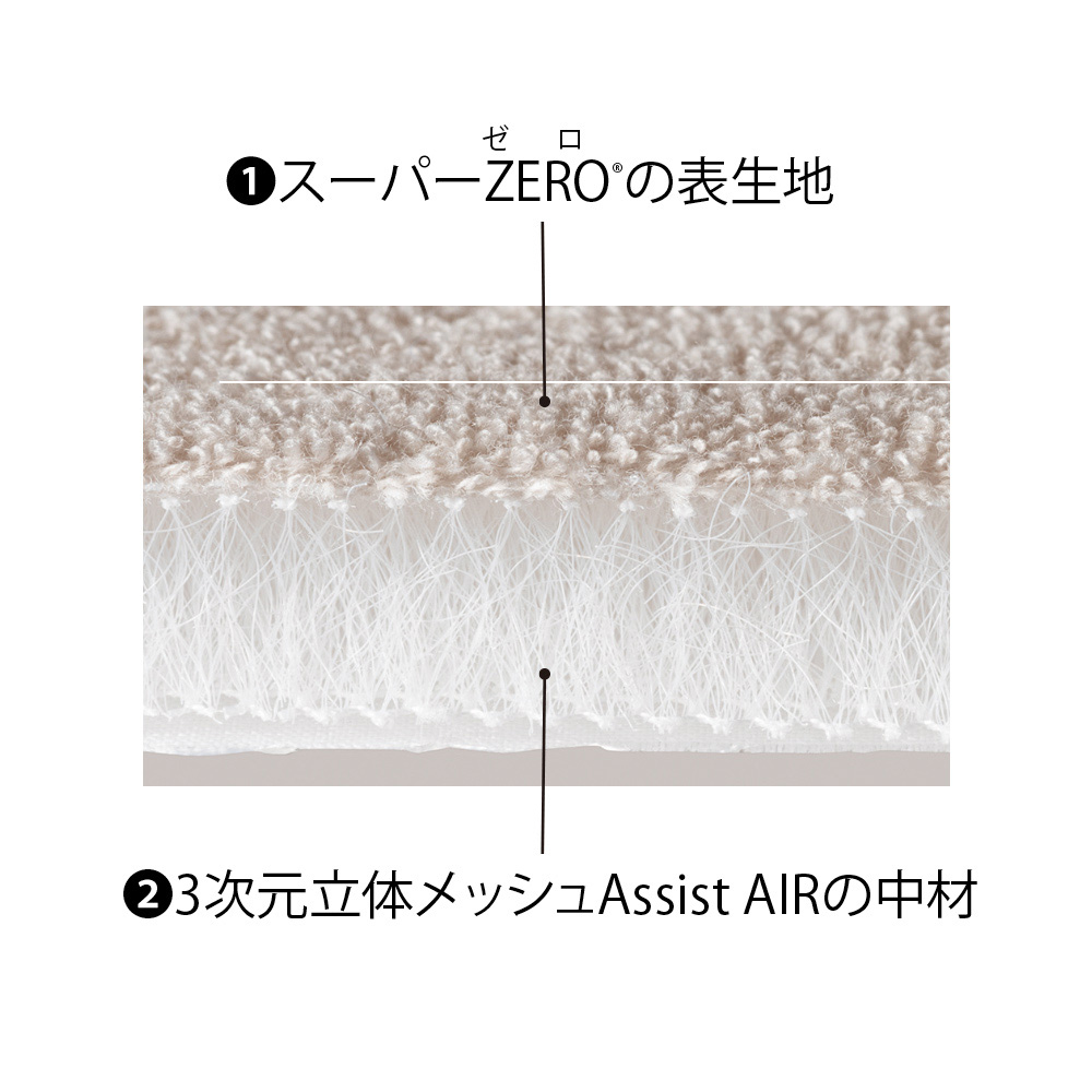 汗を素早く吸って発散!全身をしっかりサポート!繊維業界注目の特殊繊維スーパーZERO(R)×3次元立体メッシュ構造が生むミラクルな寝心地!お手持ちの敷布団やマットレスに1枚敷くだけで驚くほど寝心地を改善してくれる敷きマットです。一枚敷くだけでサラッと快適&身体をサポートお手持ちの敷布団やマットレスに一枚プラスするだけで、驚くほど寝心地をアップ!寝汗を素早く吸って発散し、サラサラ感が続き快適。弾力性のある中材が体圧をバランスよく分散して、身体をしっかりサポート。一年中気持ちよくお使いいただけます。SUPER ZERO(R)×3次元立体メッシュ構造が生むミラクルな寝心地表生地には繊維業界も注目の浅野撚糸の特殊糸SUPER ZERO(R)、中材には3次元立体メッシュAssist AIRを採用。汗や湿気を素早く吸い取ってサラリとした肌ざわりが続き、さらに優れた体圧分散性で全身を心地よくサポート。薄く軽いのに、驚くほど快適な寝心地を生み出します。やわらかな毛足が空気を含み、ふわふわの気持ちよさ吸水力の高さだけでなく、ふわふわの風合いもやみつきになる気持ちよさ。その秘密はシリーズ累計1750万枚突破のメガヒットタオル※でも使われている特殊糸「SUPER ZERO(R)」にあります。※「エアーかおる」の2007年6月〜2024年3月メーカー累計出荷数(浅野撚糸調べ)特殊工法で生まれた国内製造の特殊糸SUPER ZERO(R)は日本の工場で作られている注目の特殊糸。お湯に溶ける水溶性の糸を利用した特殊撚糸工法によって、繊維の隙間にたっぷりと空気を含む構造を実現。とびきりやわらかく、ふわふわの肌ざわりが特長です。優れた吸水性で寝汗も素早く吸い取り、サラふわの肌ざわりSUPER ZERO(R)が持つふわふわのボリューム感は、吸水力の高さにもつながります。繊維の隙間にたっぷりと水分が入っていくため、睡眠中の汗をしっかり吸水。寝汗をかいてもサラッと快適な肌ざわりが続きます。お手持ちの寝具に一枚プラスするだけで寝心地をUP本品はお使いの敷布団やマットレスに一枚プラスするだけで、沈み込みにくく、なおかつふんわりやさしい快適な寝心地へと導きます。心地よいクッション性の秘密は2層目の3次元立体メッシュ構造マット2層目の3次元立体メッシュAssist AIRは、1枚に約980万本もの繊維を使用した立体構造。薄くて軽いのに、優れたクッション性で体圧をしっかり分散。睡眠中の身体にかかる負担を軽減してくれます。沈み込みを防ぎ、全身を心地よくサポート優れたクッション性は、沈み込みやすい腰や肩もしっかり支え、身体への負担を軽減してくれます。比較実験では、マットレスのみだと沈み込みますが、本品を敷くだけで沈み込みが改善されているのが分かります。硬めのマットレスでも、圧力をバランスよく分散し、身体の負担を軽減硬めのマットレスを使って比較したところ、マットレスのみだと腰や背中に圧力が集中していますのが、本品を敷くことで体圧がバランスよく分散され、身体への負担が軽減されていることが分かります。四隅ゴム無しでズレにくく、敷くだけの簡単着脱裏面に滑り止め加工を施すことで、ゴム無しでもズレにくい仕様に。ポンと乗せるだけででラクにつけ外しができ、お手入れも簡単。自宅で洗えて気持ちよくお使いいただけます。