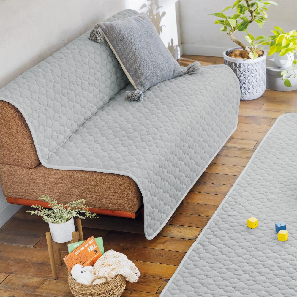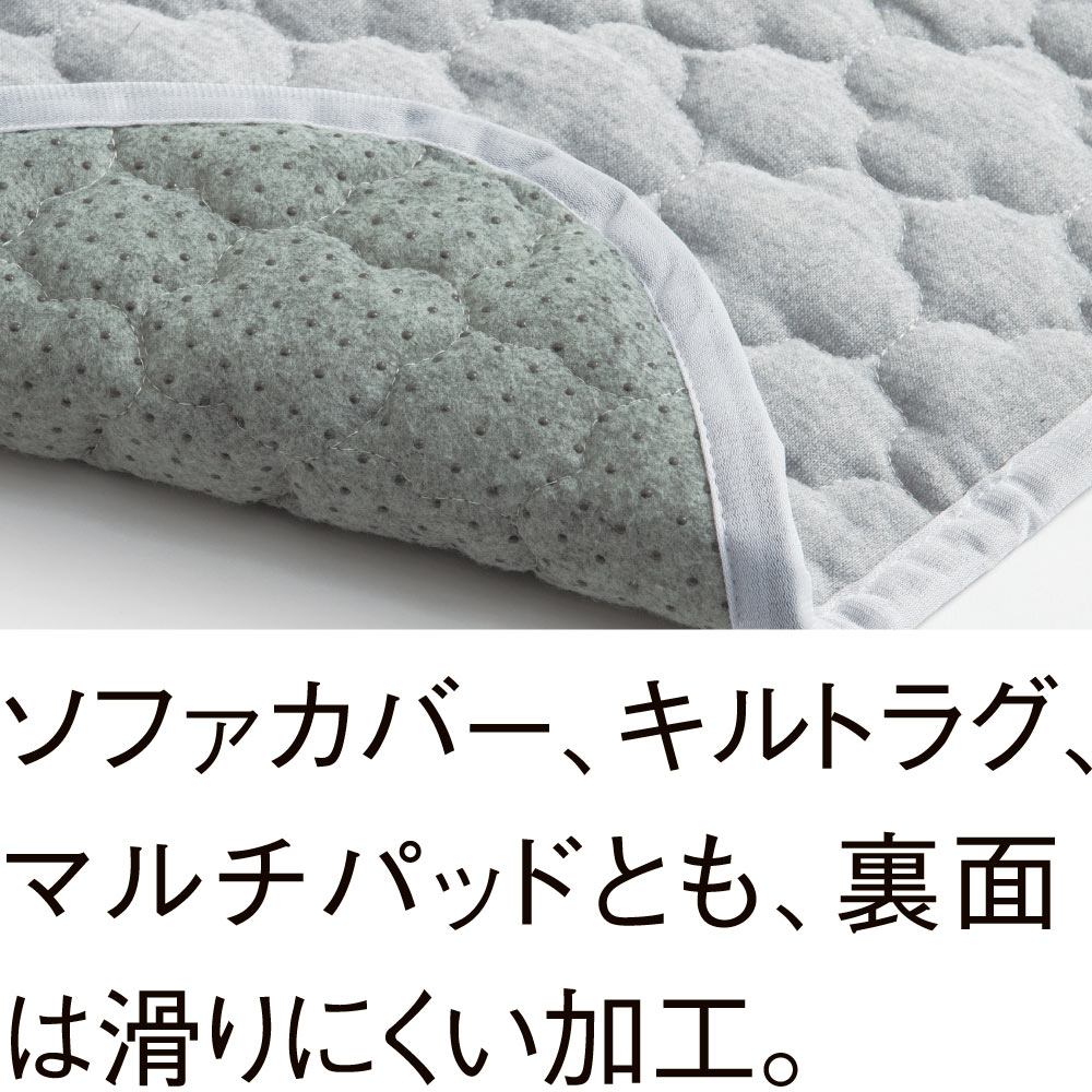 ふんわり心地よい肌ざわりの洗えるキルトソファカバー アームなしタイプ。メランジスウェット生地を使用しミックス感のある色味と優しい風合いに仕上げました。ふんわりさらっと心地よいさわり心地でソファがリラックス空間に。ご家庭で気軽に洗えるのもうれしいポイントですカジュアル&リラックスが持ち味のメランジスウェット生地に、キルトステッチを施してフワサラの風合いに仕上げました。ニュアンスカラーと曲線使いのステッチで、ソファをお気に入りのリラックス空間に。抗菌防臭・防ダニ、丸洗いの清潔機能はそのままに、杢調の生地デザインと裏地の色を新しくしました。中わたは、優れた抗菌防臭効果と防ダニ機能を持つ、帝人「マイティトップ(R)II」入り。【ポイント1】清潔機能を持つ中わた帝人「マイティトップ(R)II」入りで、細菌の増殖を抑制し、抗菌防臭効果を発揮します。一般の中わたと比較してダニ忌避効果があり、お子さまがいるご家庭も安心です。【ポイント2】安心のSEKマーク取得SEKマークとは繊維製品新機能評価評議会の「抗菌防臭加工製品認証基準」をクリアした商品に表示されるマークです。【ポイント3】裏面は滑りにくい加工裏面に滑りにくい加工を施しているので、使用するたびにズレる不快感が少なく快適です。【ポイント4】丸洗い可能汚れたら洗濯機で丸洗いできるので、いつも清潔に使えます。小さいお子さまやペットがいるご家庭にもおすすめです。※洗濯機でお洗濯する場合は必ずネットをご使用ください。※乾燥機・ドラム式洗濯機は使用できません。※洗濯機に入らない場合は手洗いしてください。※色落ちする場合がありますので他の物とは一緒に洗わないでください。