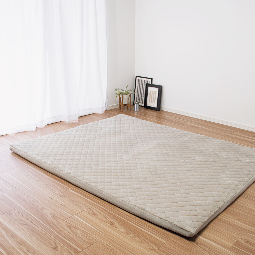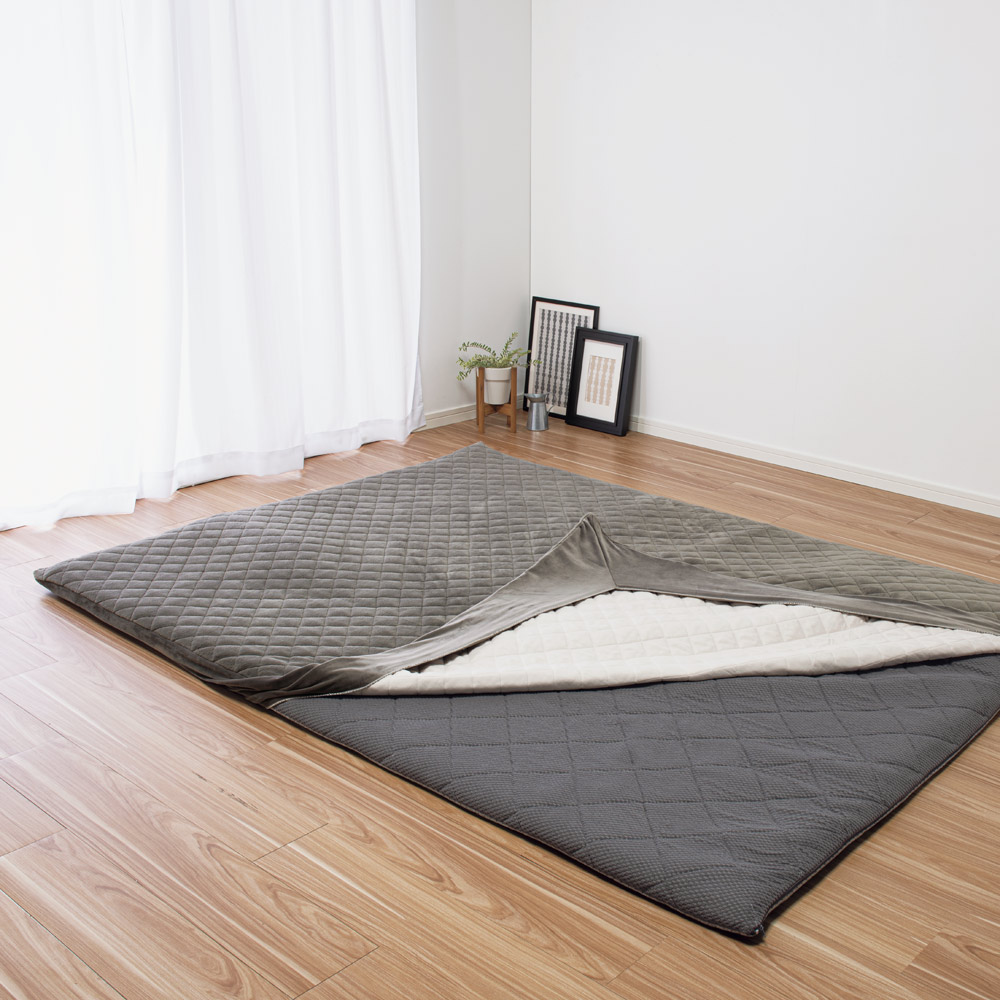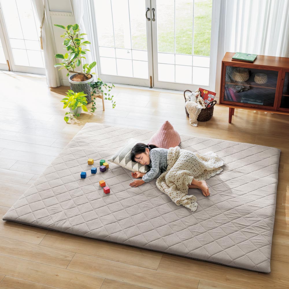 寝具で人気のブレスエアー(R)がリビングに!優れたクッション性と体圧分散性で、床暮らしを変えるリラックスラグ。専用のあったかカバーが付いたお得なセットで、寒い季節もより快適に。【ポイント1】独自の3層構造が快適な座り心地をキープ特殊な三次元構造のブレスエアー(R)は、下層にかけて硬さが増してゆく「硬さのグラデーション」。上層で身体をソフトに受け止め、中層で体圧分散。下層でしっかり支えます。(※座り心地には個人差があります)■ブレスエアー(R)とは…ブレスエアー(R)とは、大手化学繊維メーカー「東洋紡」が1990年に開発した素材。繊維が絡み合ったような特殊な「三次元網状繊維構造体」により、 圧縮にも強い耐久性、スプリングのようなクッション性、優れた通気性など、様々な機能を発揮します。耐久性の高さや清潔性、長時間座っても疲れにくいことから 病院や介護の分野、新幹線N700系のグリーン車のシートにも採用されています。【ポイント2】通気性がありムレにくいからサラッと爽やかヘチマのような多孔構造が熱や湿気を効率的に逃がし、長時間座っていてもムレにくく爽やか、一年中快適にご使用いただけます。【ポイント3】ブレスエアー(R)は制菌加工で衛生的ブレスエアー(R)は、ホコリが出にくい上、制菌加工が施されています。SEKマーク(オレンジ)付きで、清潔に安心してご使用いただけます。■SEKマーク(制菌加工)とは…繊維上の細菌の増殖を抑制する加工のうち、性能が認証基準を満たし、(一社)繊維評価技術協議会に認証された加工を施した素材に表示しています。【ポイント4】収納にも便利なコンパクトサイズでお届け3枚の中身(ブレスエアー(R)素材)と、2種類のカバーをセットでお届けします。※セッティングはお客様自身で行っていただきます。[セット内容とセッティング方法]1:3枚の中身(ブレスエアー(R)素材)正方形は、約50×150cm×3枚、長方形は約50×200cm×3枚の3分割構造です。2:中身を固定するメッシュカバーコの字のファスナーで区切られた3ゾーンに、3枚の中身を1枚ずつ入れ1枚のラグに仕上げます。3:中わた入りのこだわりの側カバー側カバーのコの字ファスナーを開いて、中身を入れれば完成。表地は肌ざわりのよいタオル地、表面には沈み込みを防ぐ縦状繊維綿を採用。優れた通気性でムレも防ぎます。裏面はお子様にも安心の滑りにくい加工です。【ポイント5】カバーも中身も丸洗いできていつも衛生的カバーは外して洗濯機で洗えるので汚れても安心。中身のブレスエアー(R)素材は、シャワー等で洗えるので、汗が気になる季節も気持ちよく使えます。【ポイント6】あったかカバーを+して寒い季節も心地良くたっぷりした毛足の起毛素材。セットで使えば、寒い季節も心地良くご使用いただけます。【ポイント7】取り外し簡単なあったかカバーブレスエアー(R)ラグ自体の側カバーも外して洗えますが、あったかカバーは被せるタイプなので、簡単に取り外せて手軽に洗濯機で洗えます。【ポイント8】裏面にもこだわった安心仕様裏面のスカート部は、伸縮性のある生地を使用しているので、取り外しも簡単。たっぷりした生地幅の滑りにくい素材なので、使用時の本体とのズレも気にならず、フローリングでも滑りにくいので小さなお子様のいるご家庭にもおすすめです。