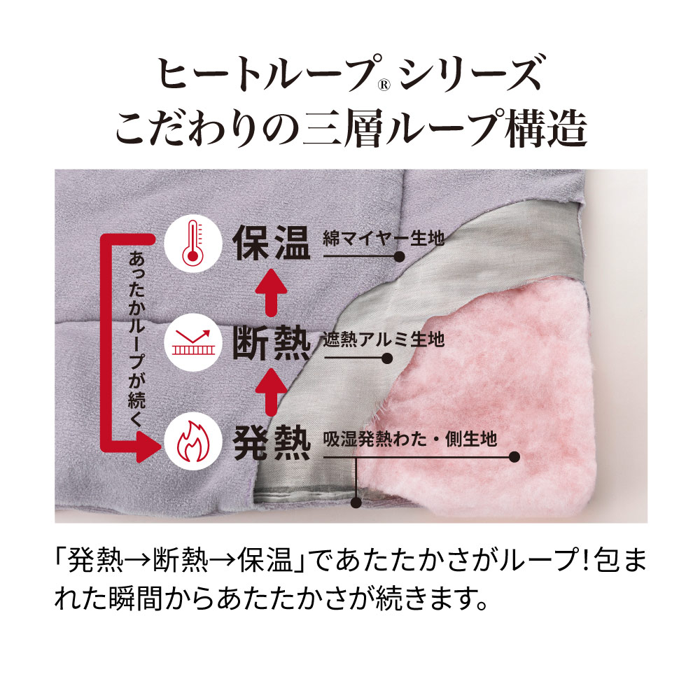 肌にふれるものはナチュラル志向、でも暖かく眠りたい!という方へ。ディノスの大人気冬寝具ヒートループ(R)のあったか効果はそのままに、側地をパイル部綿100%のマイヤー生地で仕立てました。天然素材のやさしい風合いと暖かさを両取りできるヒートループ(R)で、しあわせな冬の眠りを。コットン派のために生まれたヒートループ(R)のぬくぬく毛布肌にふれるものはナチュラル志向、でも暖かく眠りたいという方のために生まれたナチュラルプラスシリーズ。ヒートループ(R)の暖かさと、天然素材のやさしい風合いに包まれるぬくぬく毛布です。中身はヒートループ(R)、表面は綿のやさしい肌ざわり中身はヒートループ(R)ハイパーと同じ機能性で、肌に触れる面を綿100%のなめらかな起毛素材にしたことで、お布団に入った瞬間のヒヤッと感を抑えます。綿ならではのやわらかく心地よい肌ざわりで、冬の寝はじめも優しいぬくもりを感じられます。天然素材で暖かく合繊は暑すぎたりムレたりしそうで苦手。冬でも天然素材で暖かく眠りたい!という方へ。綿100%のやさしい肌ざわりとほどよいぬくもりに包まれます。暖かさのヒミツ「発熱→断熱→保温」のヒートループ(R)構造「あたたかさの源」となる「発熱わた」「アルミシート」「発熱生地」などあらゆる素材を組み合わせ、驚きのあたたかさと気持ちよさを実現。「発熱」「断熱」「保温」3つの効果が繰り返されることで、朝まであたたかく寝られます。【発熱】ミリオンホット(R)DXわたによる驚きの発熱パワー「ミリオンホット(R)DXわた」は湿気を吸って発熱するので、暖かいだけでなく布団の中がムレにくく。さらに驚きの発熱パワーにより、布団に入ってすぐポカポカに。【断熱】暖かさを閉じ込める、やわらか遮熱アルミ生地毛布上側とパッド下側に遮熱効果のある遮熱アルミ生地を使用し、厳しい冷え込みや床からの冷気をブロック。やわらかなアルミシートを採用することで肌沿いも◎。洗濯機で洗えて清潔布団をご家庭で洗濯する際は必ずお手持ちの洗濯機の説明書をご覧ください。メーカー・機種・容量により布団の洗濯ができない場合はクリーニング店、大型洗濯機のあるコインランドリー等での洗濯をおすすめします。