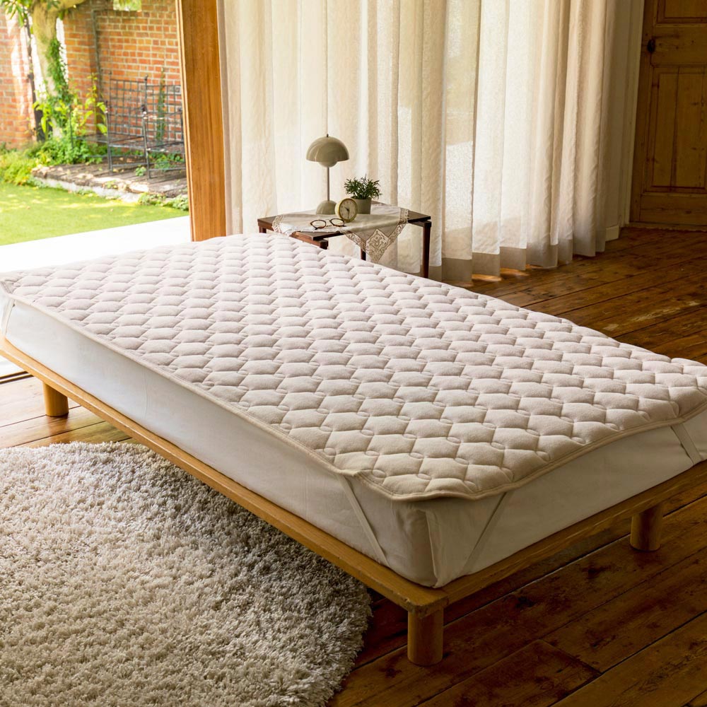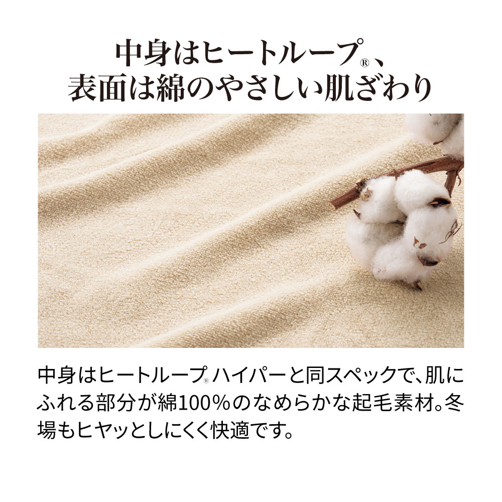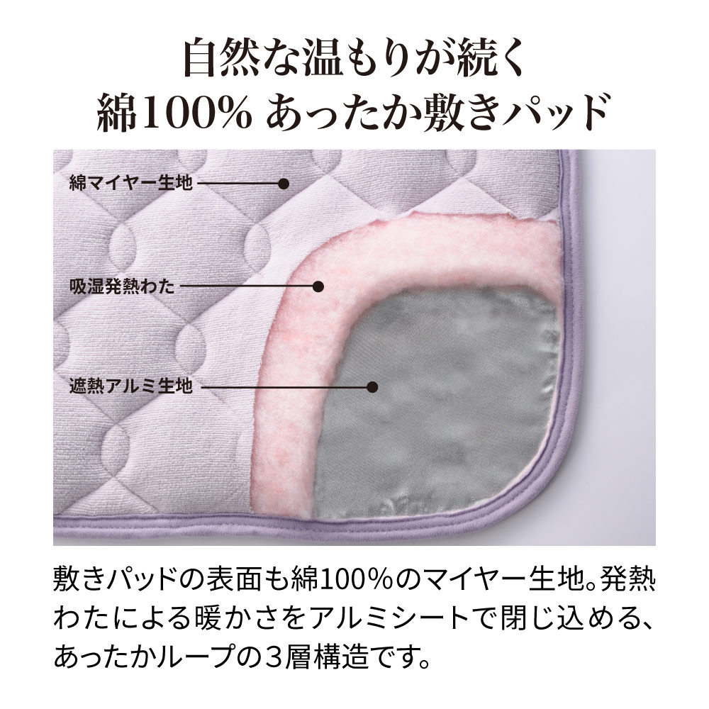 肌にふれるものはナチュラル志向、でも暖かく眠りたい!という方へ。ディノスの大人気冬寝具ヒートループ(R)のあったか効果はそのままに、側地をパイル部綿100%のマイヤー生地で仕立てました。天然素材のやさしい風合いと暖かさを両取りできるヒートループ(R)で、腰や背中までふんわりポカポカに。コットン派のために生まれたヒートループ(R)の敷きパッド肌にふれるものはナチュラル志向、でも暖かく眠りたいという方のために生まれたナチュラルプラスシリーズ。ヒートループ(R)の暖かさと、天然素材のやさしい風合いを満喫できる敷きパッドです。中身はヒートループ(R)、表面は綿のやさしい肌ざわり中身はヒートループ(R)ハイパーと同じ機能性で、肌に触れる面を綿100%のなめらかな起毛素材にしたことで、お布団に入った瞬間のヒヤッと感を抑えます。綿ならではのやわらかく心地よい肌ざわりで、冬の寝はじめも優しいぬくもりを感じられます。天然素材で暖かく合繊は暑すぎたりムレたりしそうで苦手。冬でも天然素材で暖かく眠りたい!という方へ。綿100%のやさしい肌ざわりとほどよいぬくもりに包まれます。暖かさのヒミツ「発熱→断熱→保温」のヒートループ(R)構造「あたたかさの源」となる「発熱わた」「アルミシート」「発熱生地」などあらゆる素材を組み合わせ、驚きのあたたかさと気持ちよさを実現。「発熱」「断熱」「保温」3つの効果が繰り返されることで、朝まであたたかく寝られます。※画像は掛け毛布になります。自然な温もりが続く綿100%あったか敷きパッド敷きパッドの表面も綿100%のマイヤー生地。発熱わたによる暖かさをアルミシートで閉じ込める、あったかループの3層構造です。【発熱】ミリオンホット(R)DXわたによる驚きの発熱パワー「ミリオンホット(R)DXわた」は湿気を吸って発熱するので、暖かいだけでなく布団の中がムレにくく。さらに驚きの発熱パワーにより、布団に入ってすぐポカポカに。【断熱】暖かさを閉じ込める、やわらか遮熱アルミ生地毛布上側とパッド下側に遮熱効果のある遮熱アルミ生地を使用し、厳しい冷え込みや床からの冷気をブロック。やわらかなアルミシートを採用することで肌沿いも◎。洗濯機で洗えて清潔布団をご家庭で洗濯する際は必ずお手持ちの洗濯機の説明書をご覧ください。メーカー・機種・容量により布団の洗濯ができない場合はクリーニング店、大型洗濯機のあるコインランドリー等での洗濯をおすすめします。