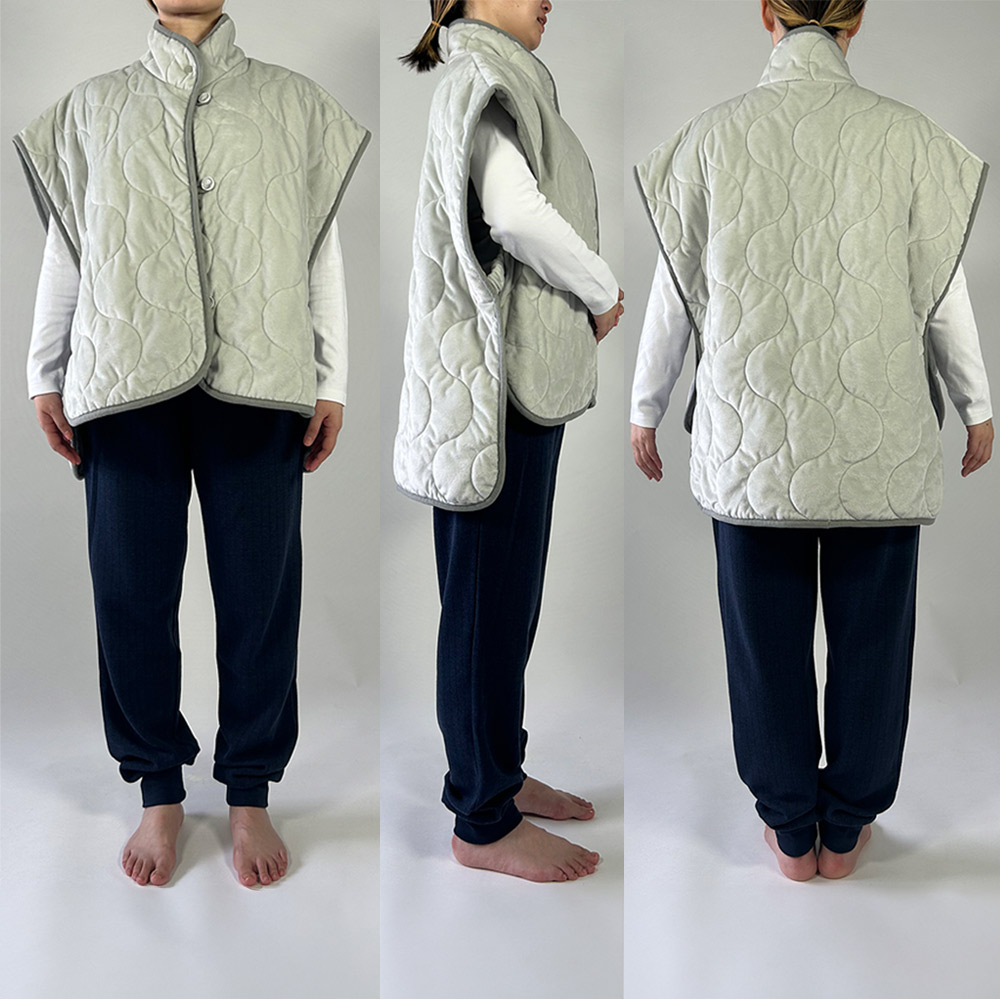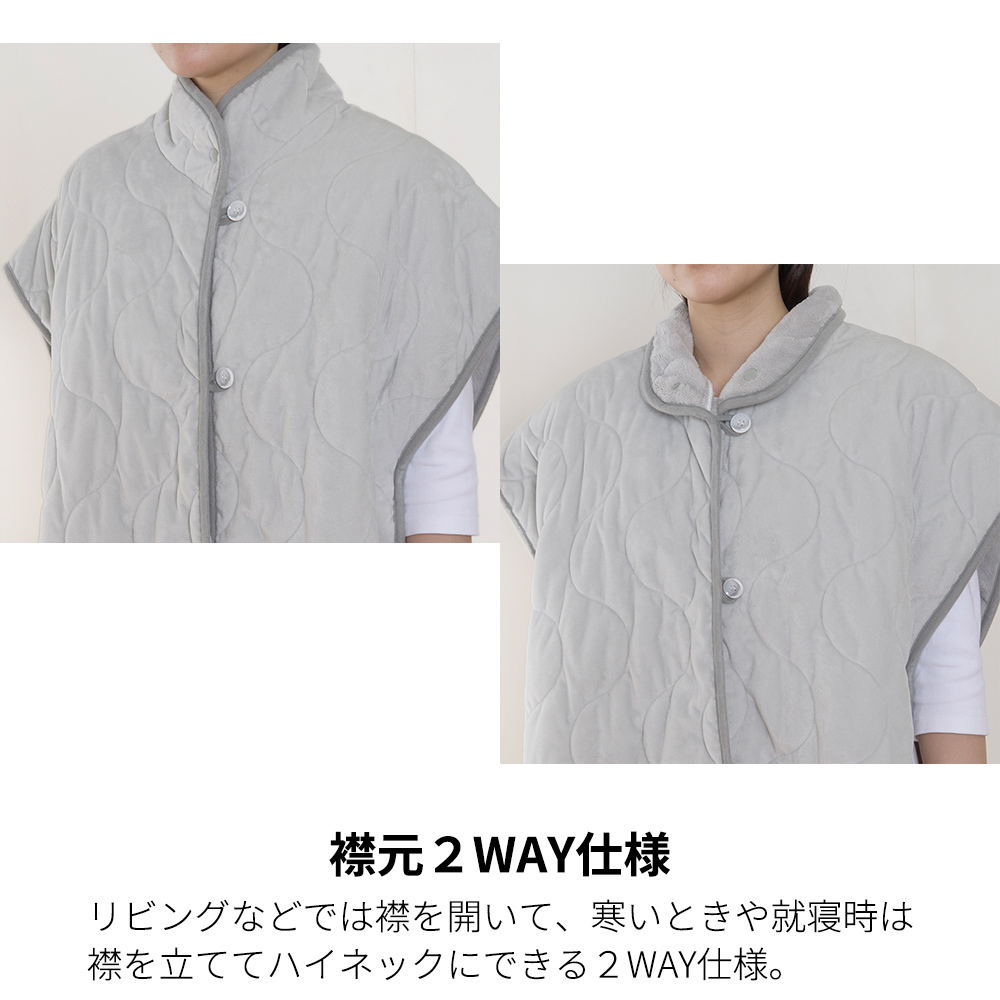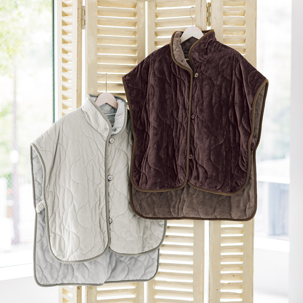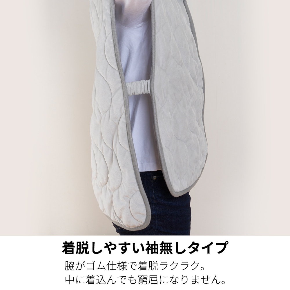 大人気のあったか寝具シリーズ、ヒートループ(R)から肩当てベストが登場。「発熱」「断熱」「保温」3つの効果が繰り返されて暖かさが止まらない!まさに「着られるお布団」です。ヒートループ(R)で作った、あったか肩あてベスト電気のいらない発熱寝具として大人気のヒートループ(R)と同じ素材で作った肩あては、まさに“着られるお布団”。冷やしたくない首・肩・腰までカバーして、なおかつ動きやすい。家事やデスクワーク時も、就寝時も、冷気をブロックしてぬくぬくに。暖かさが止まらないヒートループ(R)構造大人気のあったか寝具・ヒートループ(R)と同素材を使用。「発熱わた」「アルミシート」「発熱生地」を組み合わせることで、「発熱」「断熱」「保温」の3つのあったか効果が繰り返される独自の構造です。【発熱】ミリオンホット(R)DXわたによる驚きの発熱パワー「ミリオンホット(R)DXわた」は湿気を吸って発熱するので、暖かいだけでなく中がムレにくく。さらに驚きの発熱パワーによりすぐポカポカに。【断熱】暖かさを閉じ込める、やわらか遮熱アルミ生地内側に遮熱効果のある遮熱アルミ生地を使用し、厳しい冷え込みから冷気をブロック。やわらかなアルミシートを採用することで肌沿いも◎。襟元2WAY仕様リビングなどでは襟を開いて、寒いときや就寝時は襟を立ててハイネックにできる2WAY仕様。着脱しやすい袖無しタイプ脇がゴム仕様で着脱ラクラク。中に着込んでも窮屈になりません。後ろが長いデザインで、腰まであったか。洗濯機で洗えて清潔です。 ※イメージ