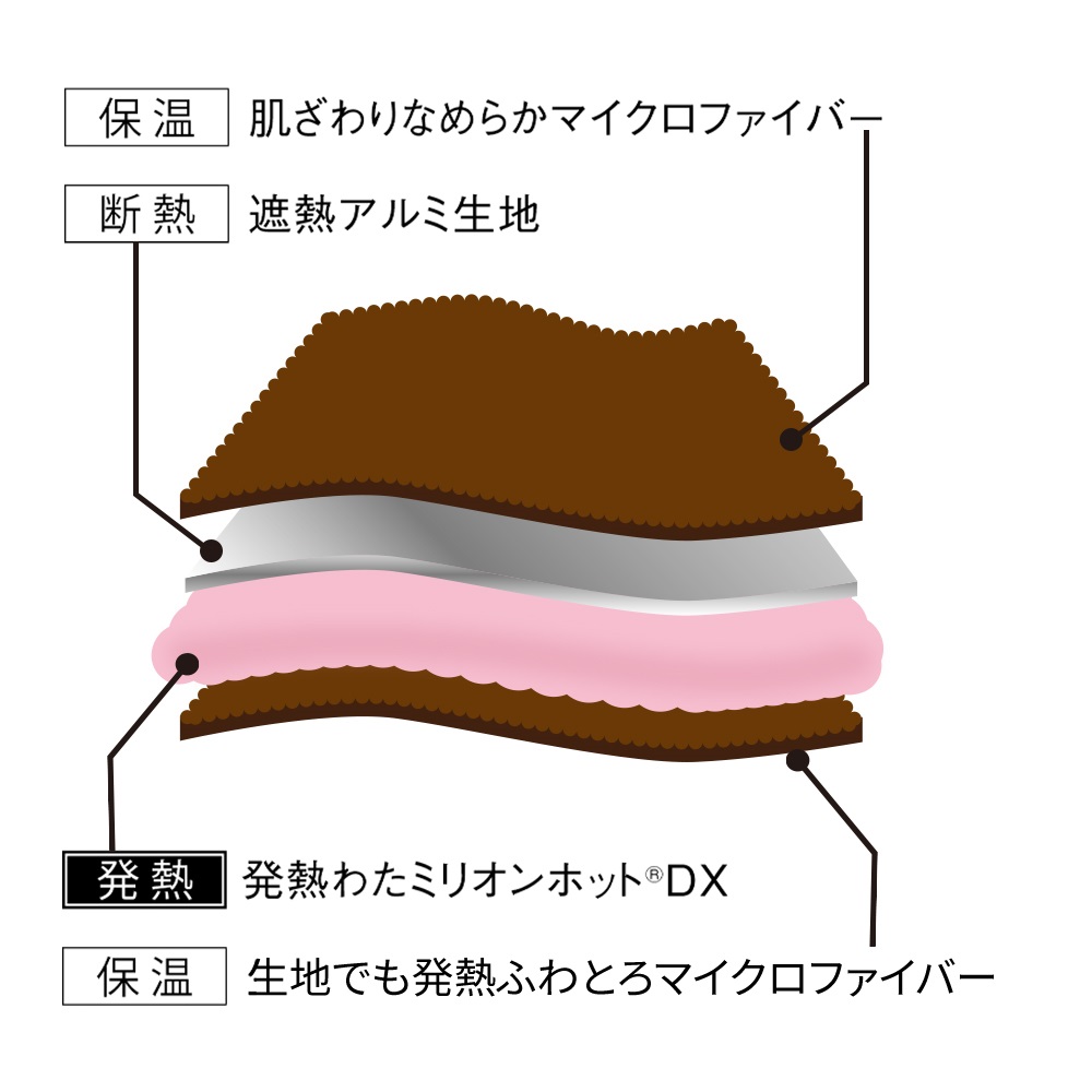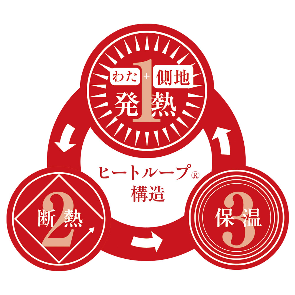 「発熱わた」「アルミシート」「発熱生地」を組み合わせ、「発熱」「断熱」「保温」の3つの効果が繰り返されるから驚きの暖かさ。