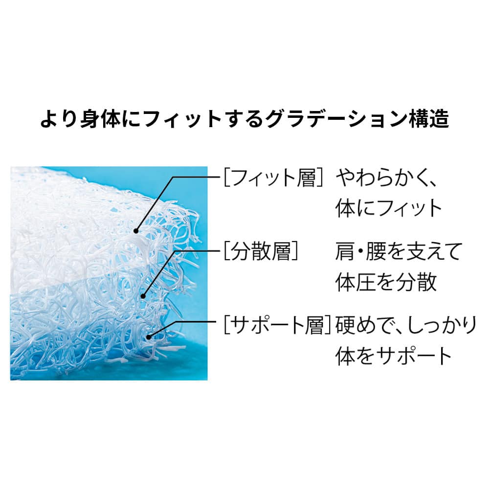 • 特殊な3次元網状態繊維により、体重がかかっても沈みこまず押し返し、重さのかかりやすい腰と肩をしっかり支えます。