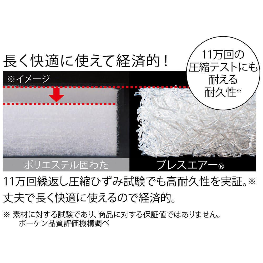 • ブレスエアー(R)は信頼のブランド「東洋紡」が開発した素材。耐久性、スプリングのような弾性、優れた通気性など様々な機能を発揮します。