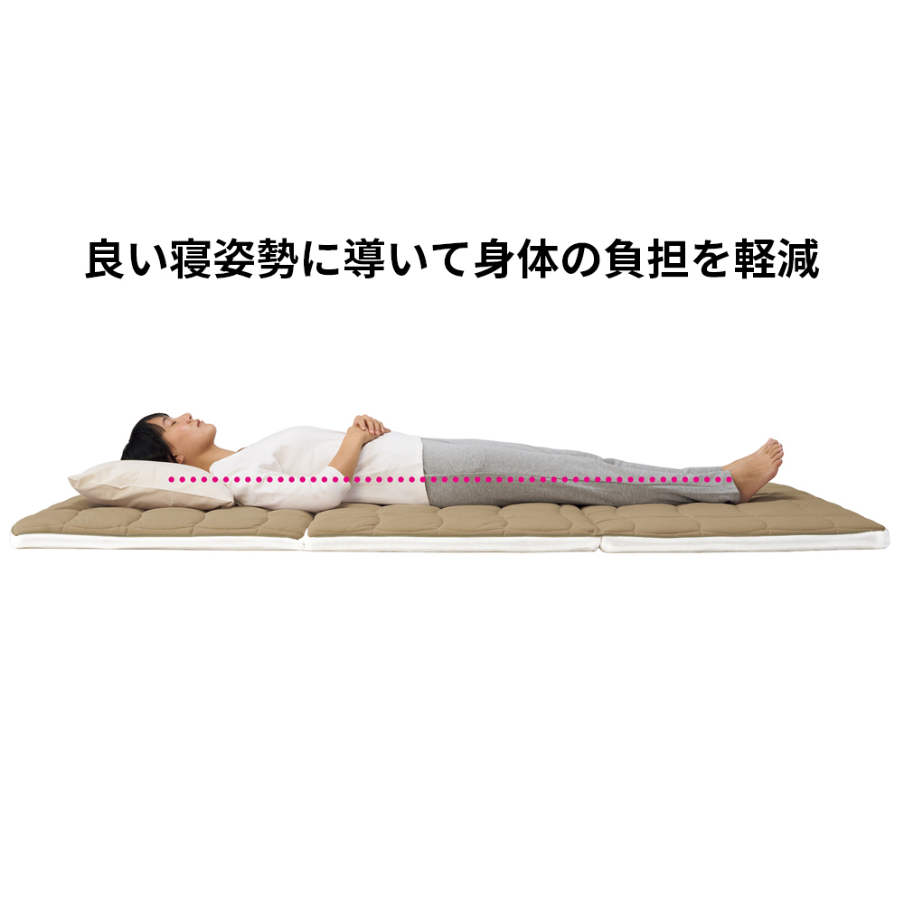 肩や腰をしっかり支え、まっすぐな良い寝姿勢に導き、睡眠中の身体の負担を軽減してくれます。