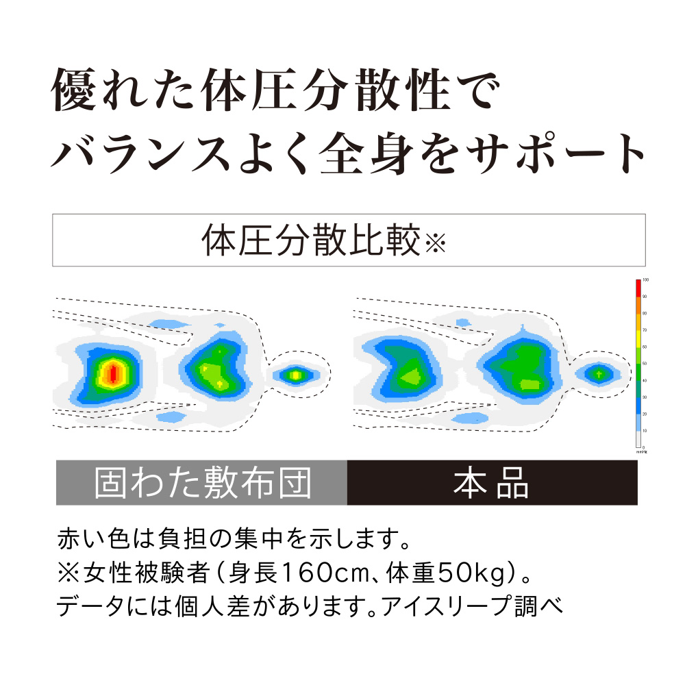 特殊な3次元網状態繊維により、体重がかかっても沈みこまず押し返し、重さのかかりやすい腰と肩をしっかり支えます。