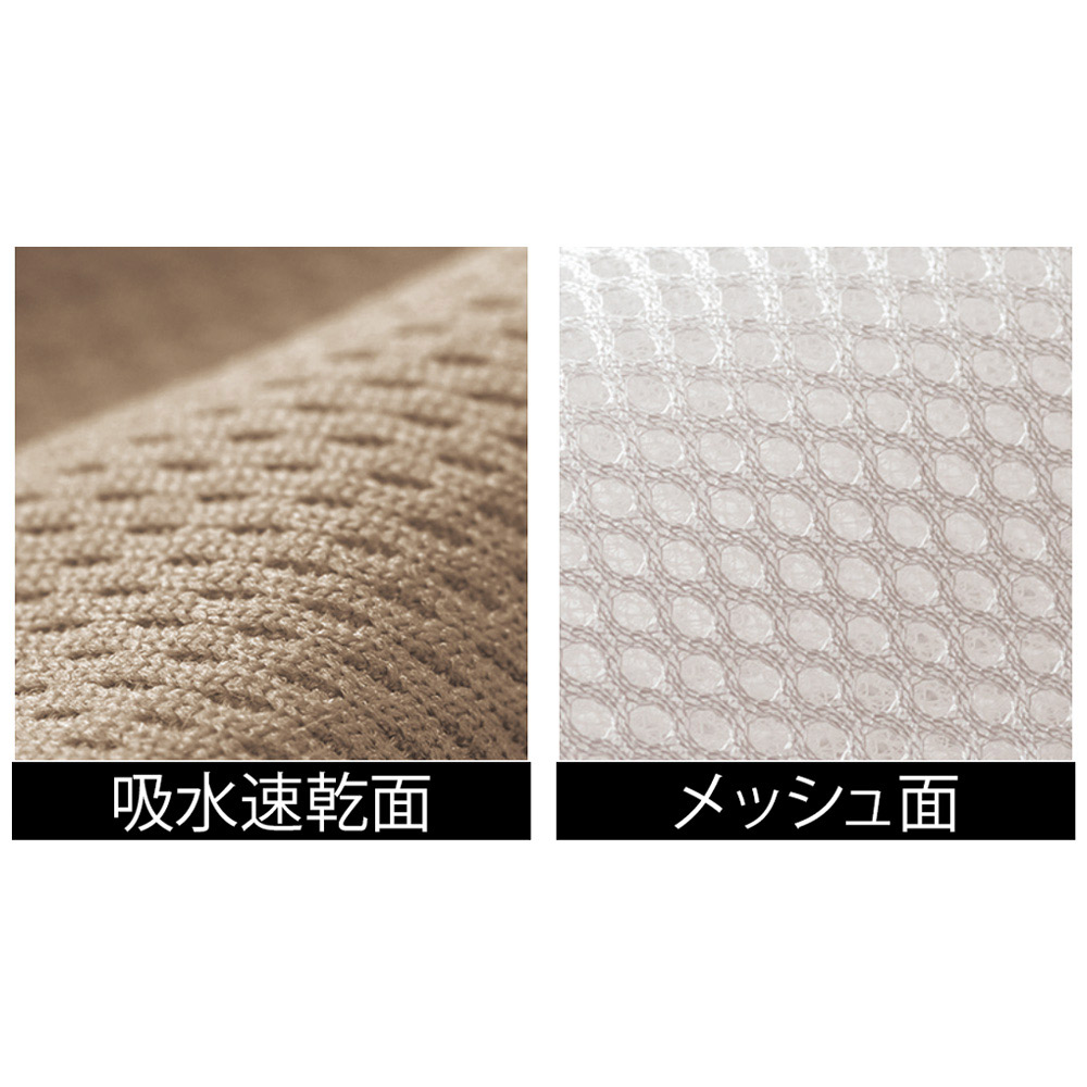 表生地は吸水速乾生地でさらっと快適。裏面はメッシュ生地で通気性に優れ、ムレ感を軽減。