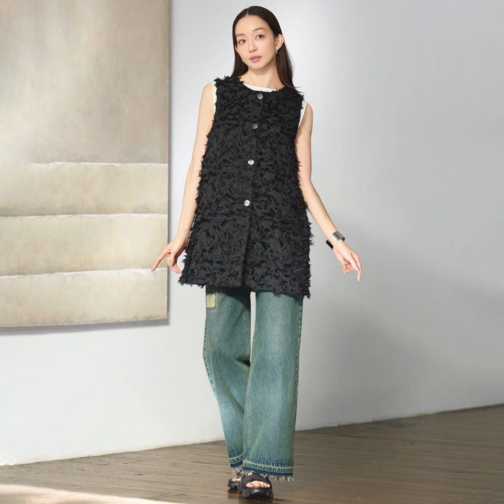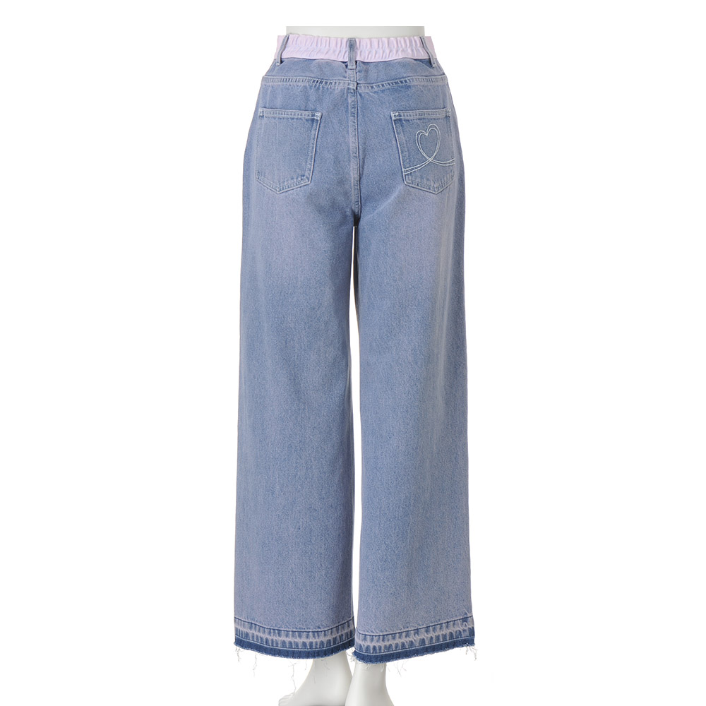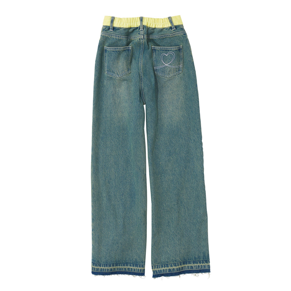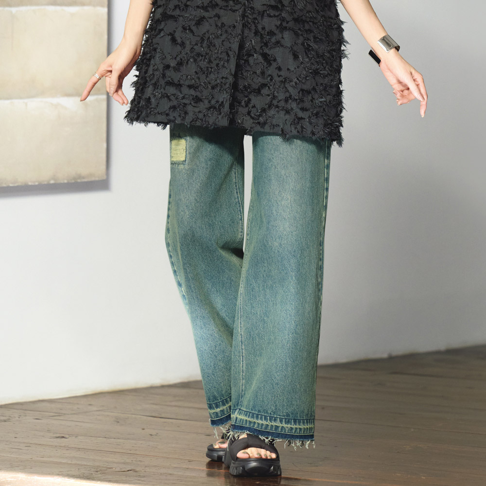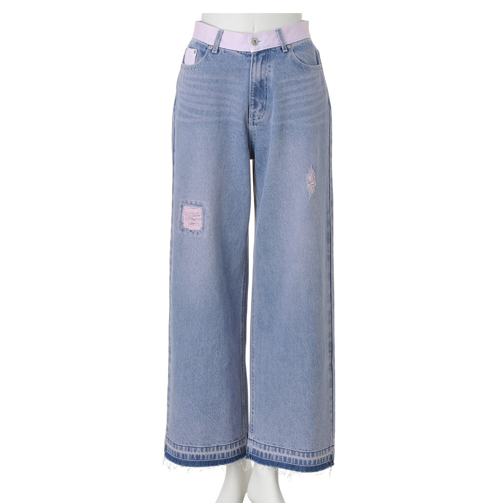 ダメージ加工が可愛い!ダメージデニムをはく大人がかっこよく見えるのは、遊び心とお洒落を楽しむスピリットを感じさせるから。ヴィンテージ風のアイテムを着る日はなんだかお洒落人間な顔でいられるのです。ワイドなデニムパンツは、先シーズンに大人気だったアイテム。後染め加工によるダメージ部分のピンク、イエローが可愛くて、シルエットが綺麗な大人のためのデニムです。ウエストは後ろがゴムでリラクシー。