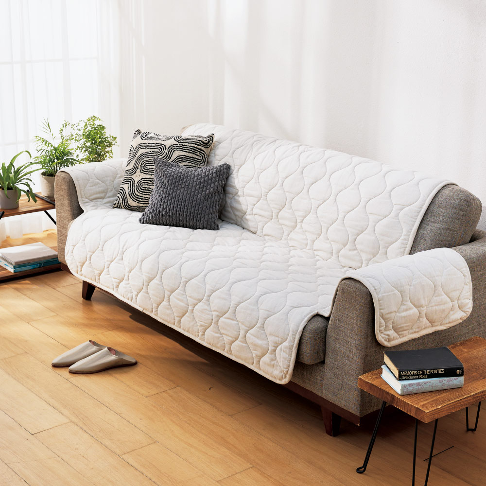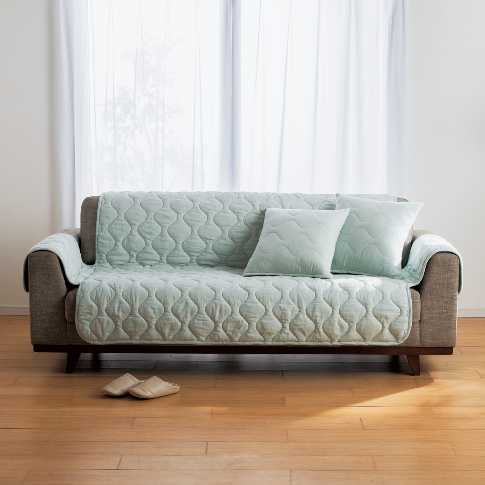 綿のやわらかさと麻の爽やかさが調和した、ナチュラルな風合い。ソファの肘までしっかりカバーするアーム付き。家族がくつろぐリビングを、夏らしい綿麻素材で爽やかに演出できるソファカバー。肌にふれる表面は綿70%・麻30%の見た目も涼やかな生地。通気性がよく、湿気を吸収しやすく、適度にシャリ感があるので暑い季節も肌ざわり快適です。デザインは、縫い目が波状になった、動きのあるウェーブキルト。抗菌防臭効果のある中わたを使用して、衛生面にもこだわりました。肘掛けの一番汚れやすい部分をカバーするアーム付きタイプ。1人掛から3人掛まで、4サイズをご用意しました。色はナチュラルでやさしいニュアンスカラーのオートミールベージュとペールグリーンの2色展開、落ち着いた空間を演出してくれます。同シリーズのラグやクッションと、夏らしい爽やかなカラーでトータルにコーディネートできます。【ポイント1】表地はウェーブキルト表地は、縫い目が波状で動きのある印象を与える、アパレルでなじみのあるウェーブキルトを採用。綿70%・麻30%の生地で、糸を部分的に染め上げたあとに織り上げることで、かすれたような涼しげな風合いを表現しました。【ポイント2】抗菌防臭・防ダニ機能中わたには、清潔な抗菌防臭・防ダニ機能を備えた帝人のマイティトップ(R)IIを50%使用しています。●SEKマーク付き繊維上の細菌の繁殖を抑制し、細菌の発生する臭いを抑制(防臭効果)することができ、「抗菌防臭加工繊維製品認定基準」をクリアした商品に表示できる、SEKマーク付きです。【ポイント3】裏面は滑りにくい加工裏面には滑りにくい加工が施されていますので、ズレにくく快適にご使用いただけます。【ポイント4】丸洗いOK洗濯機で丸洗いできますので、いつも清潔に使えます。※洗濯機でお洗濯する場合は必ずネットをご使用ください。※洗濯機に入らない場合は手洗いしてください。※乾燥機・ドラム式洗濯機は使用できません。
