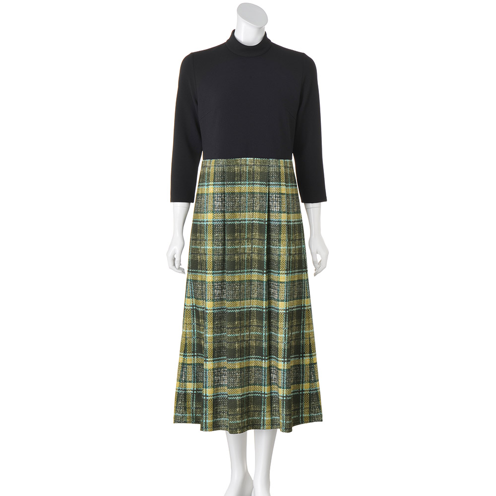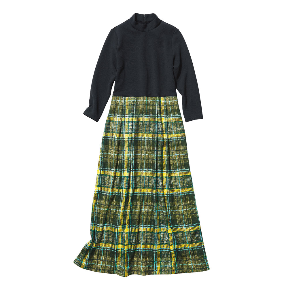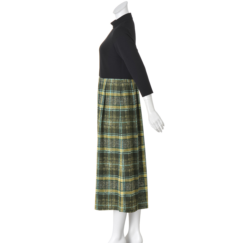 Feminine Chic“思いっきりフェミニン”が似合う秋おしゃれ心のうずく季節の到来です。枯れ葉舞う石畳の古い街を歩く気分で、毎日を過ごしましょう。大人の女性を引き立てる、シックな色味のフェミニンな装いで。ロマンティックな秋にぴったりの、なんと、これがワンピース!一見、ハイネックニット+チェック柄織りのロングスカートですが、実はストンと一枚着るだけで決まるワンピース!上身頃はシボシボ感のあるジャージー素材。スカート部分はイタリア「SILKOMO」社のジャージー生地で、織り柄に見える美しい先染めプリント。ストレスのない着心地で、少し高めのウエスト位置がスラリと見せてくれます。