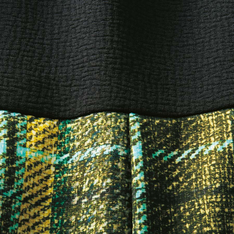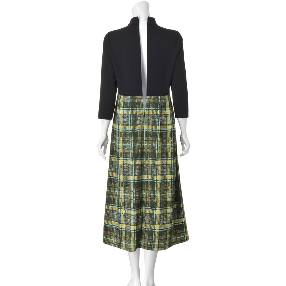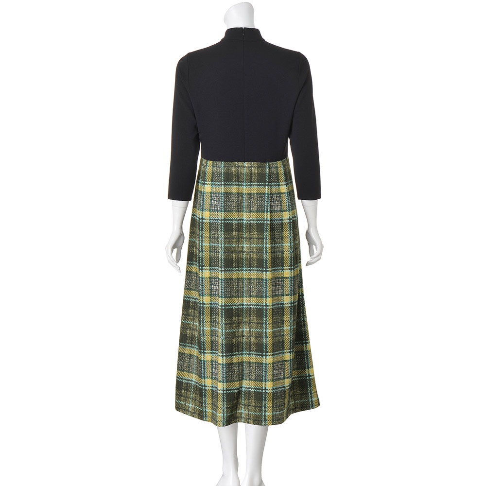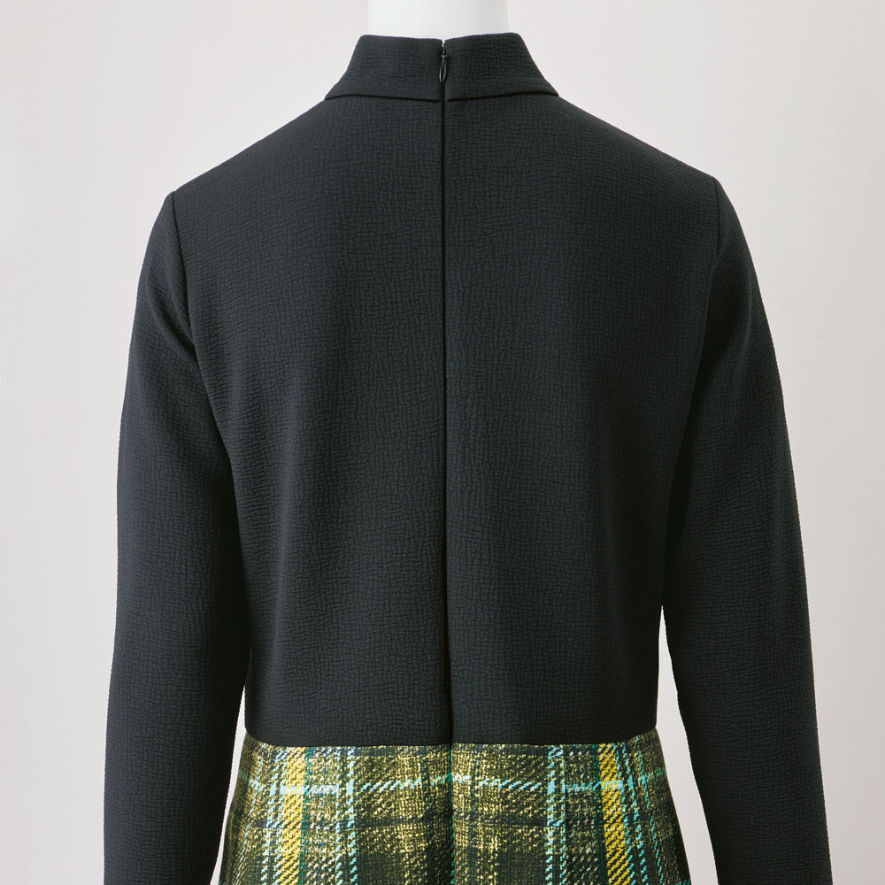 Feminine Chic“思いっきりフェミニン”が似合う秋おしゃれ心のうずく季節の到来です。枯れ葉舞う石畳の古い街を歩く気分で、毎日を過ごしましょう。大人の女性を引き立てる、シックな色味のフェミニンな装いで。ロマンティックな秋にぴったりの、なんと、これがワンピース!一見、ハイネックニット+チェック柄織りのロングスカートですが、実はストンと一枚着るだけで決まるワンピース!上身頃はシボシボ感のあるジャージー素材。スカート部分はイタリア「SILKOMO」社のジャージー生地で、織り柄に見える美しい先染めプリント。ストレスのない着心地で、少し高めのウエスト位置がスラリと見せてくれます。