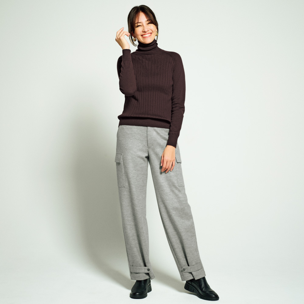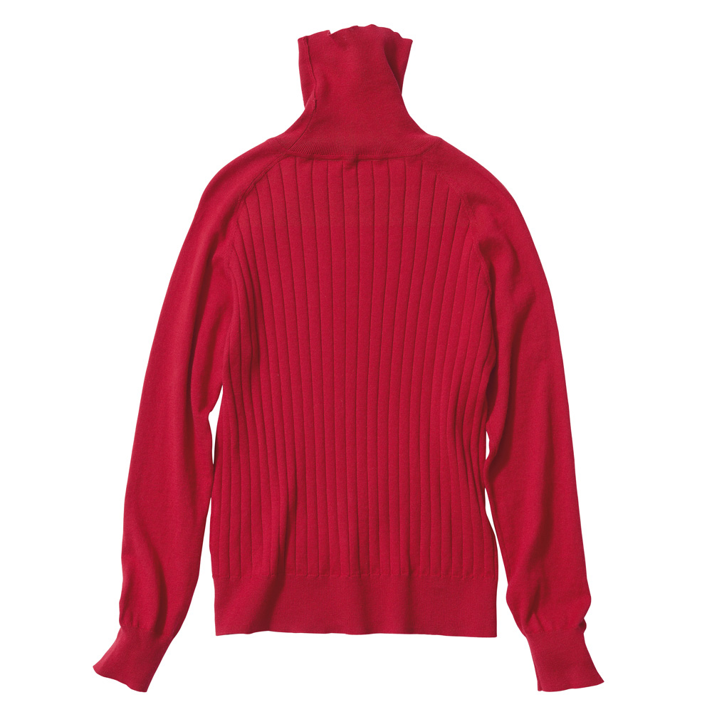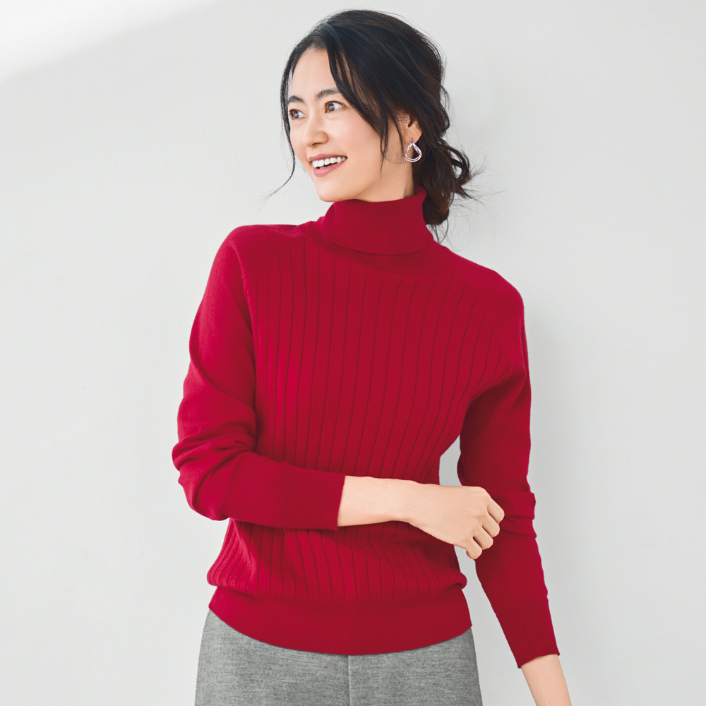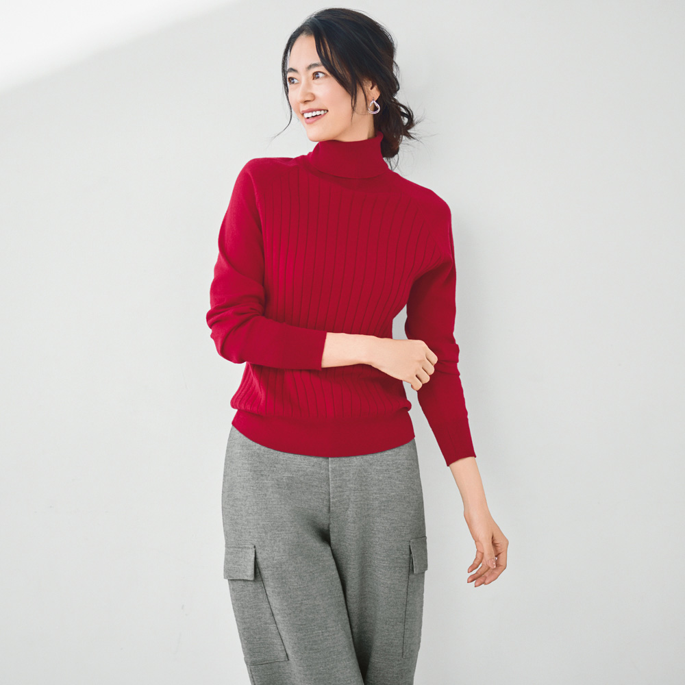 あったかくて、さらっと快適。素肌が喜ぶ、コットンの温もり。重ね着の時季も、直接肌に触れるアイテムはコットンを主役にしたい―。そんな声から誕生したシリーズは、ご紹介のたびにリピーターが続出。一度着たら手放せなくなる、上質な着心地を楽しんで。シャープな魅せ技がスマートな個性を生んでさらっとしたタッチと、ふんわりした暖かさ。綿とカシミヤの“いいとこ取り”素材で、3シーズン使えるタートルネックを作りました。身頃は縦畝が細見えに導く、ワイドリブ風の針抜き編み。畝が収縮しないので身体のラインを拾いにくいのがポイントです。ラグランの袖は天竺編みで、縦畝のシャープさを引き立てました。またネックや袖口は一段ハイゲージに編み立てて、スマートな印象をプラス。パンツでもスカートでも合わせやすい程よい着丈も、着映えの鍵です。