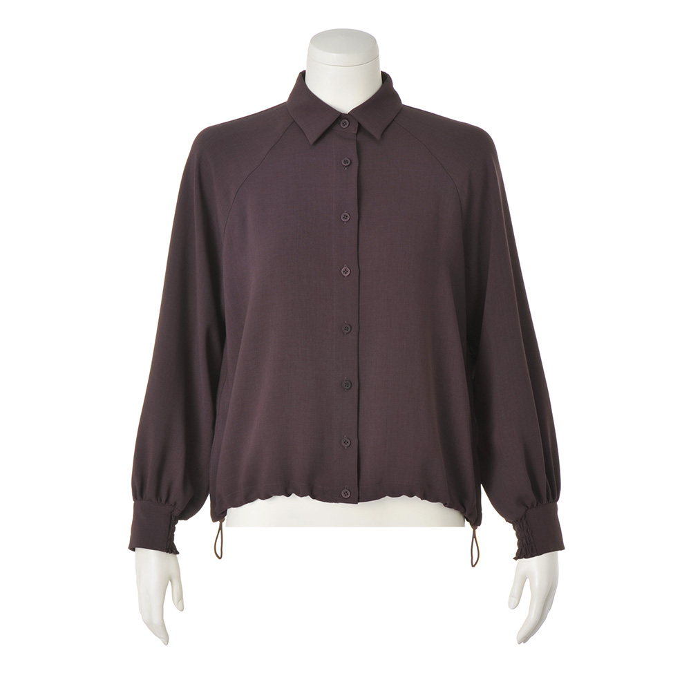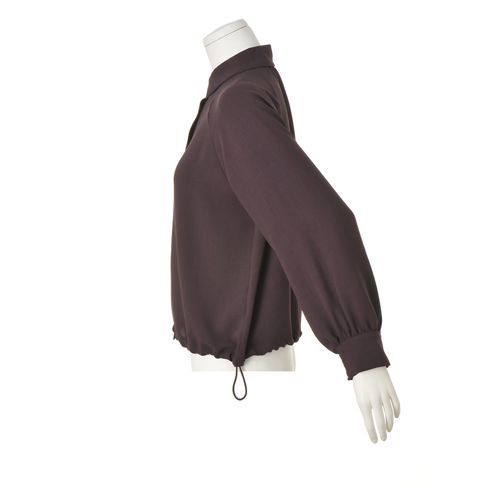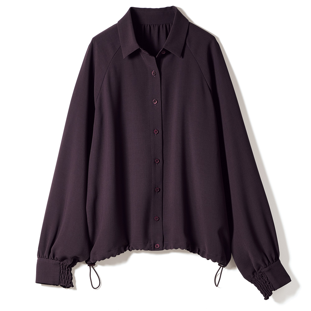 AUTUMN COLOR新しい季節の「ドラマティック」カラー。こっくりとマイルドでキレの良さもある、今シーズンのトピックカラー。日常をドラマティックに刺激する、魅惑のカラーアイテムをご紹介します。薫り高きカラーリングを装いのスパイスに。香しい赤みダークブラウンのセットアップは、とろりとしたテクスチャーのややシアーなツイル素材。しっとりと肌に馴染むパウダリータッチな表面には滑らかな光沢があって、芳醇な色味を瑞々しく際立たせています。パフスリーブのシャツは、ボトムスとバランス良く合わせられるクロップド丈にラグラン切り替え×ヘムラインのドローコードでスポーティーな捻りを加えたもの。コード調節でシルエット変化が楽しめます。≫ POINT裾コードのほか、袖口内側のゴムシャーリングや後ろ襟下にギャザーを配して、ふんわりしたフォルムに。