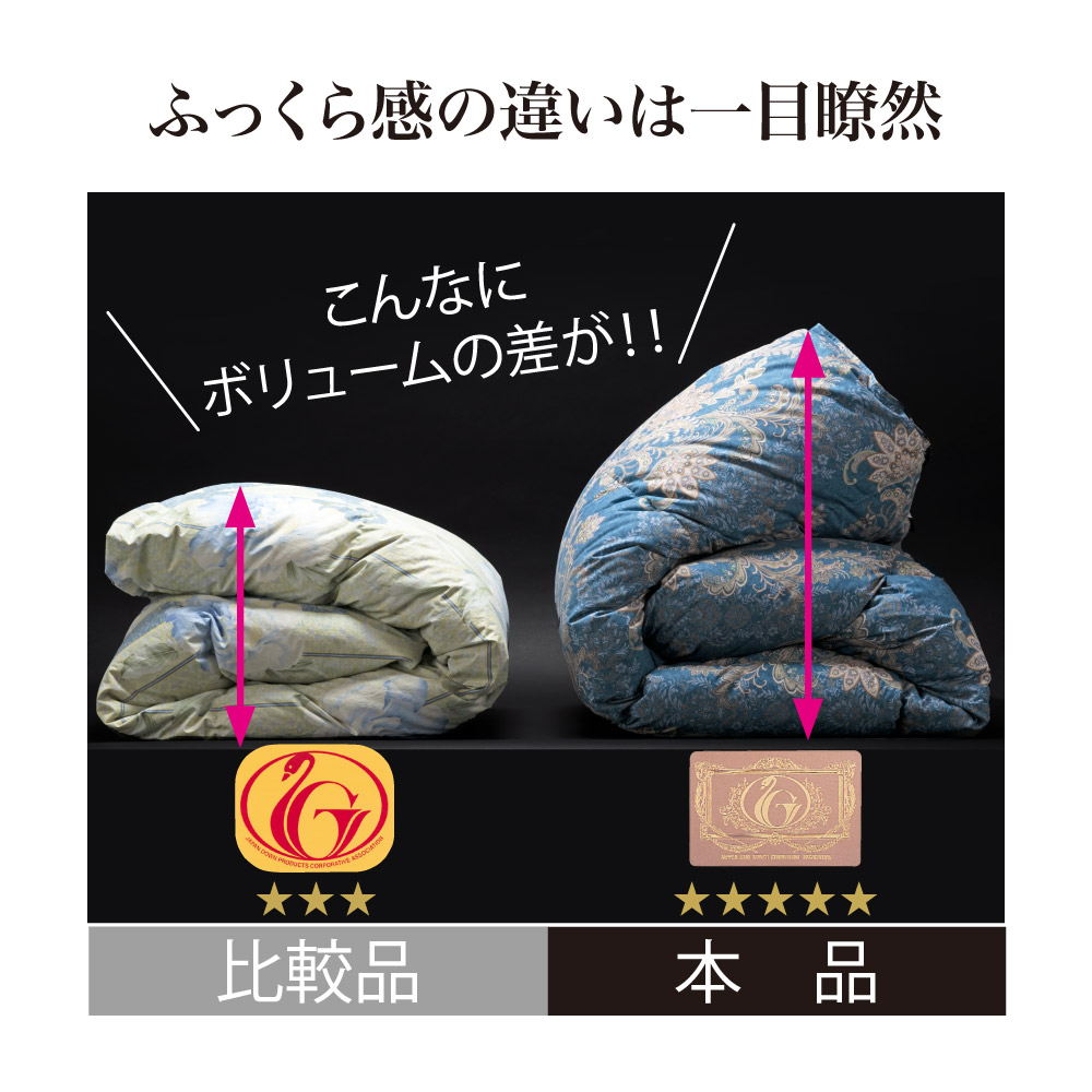 実際に布団で比べてみると、ボリューム感にこれほどの違いが。ふっくら軽く暖かな掛け心地です。