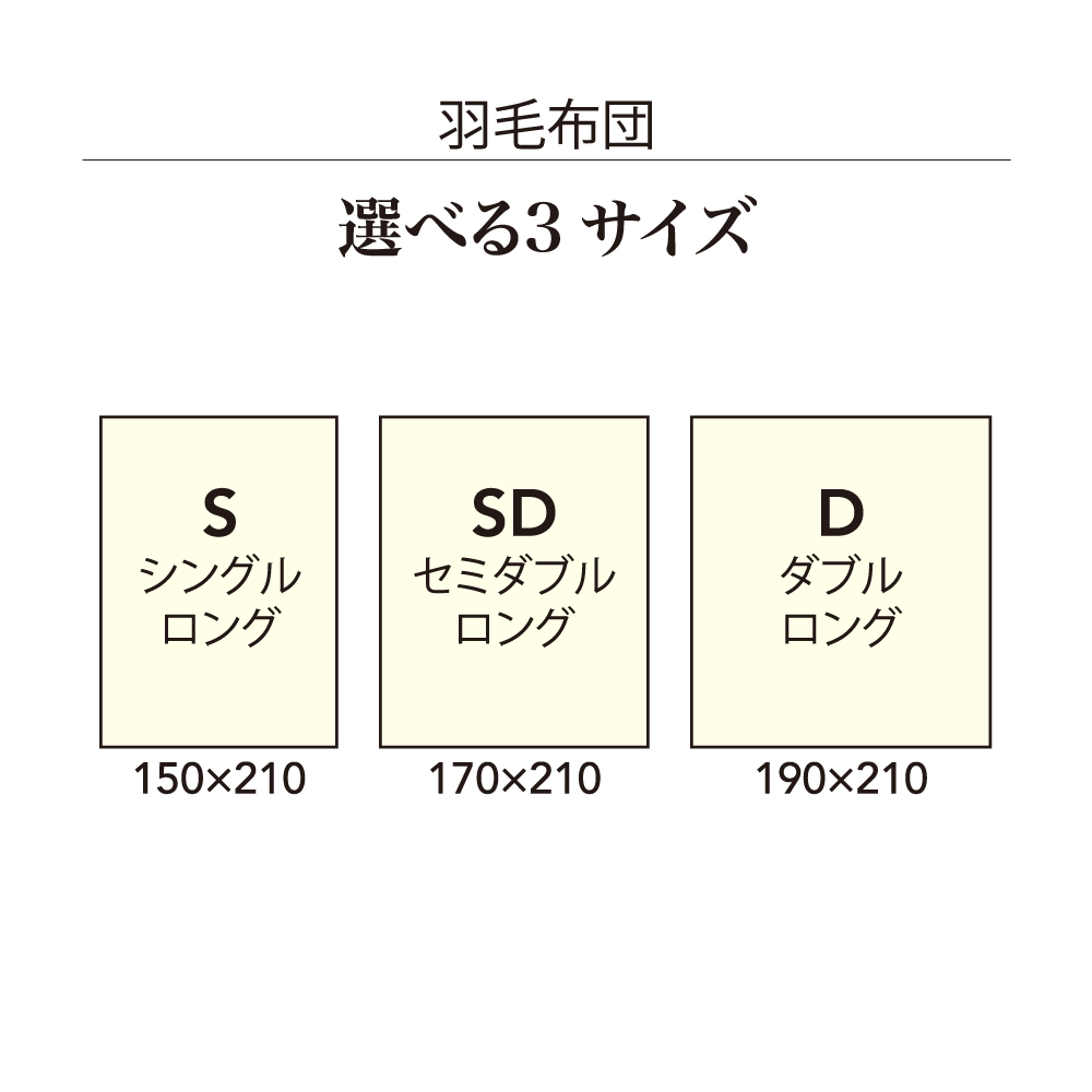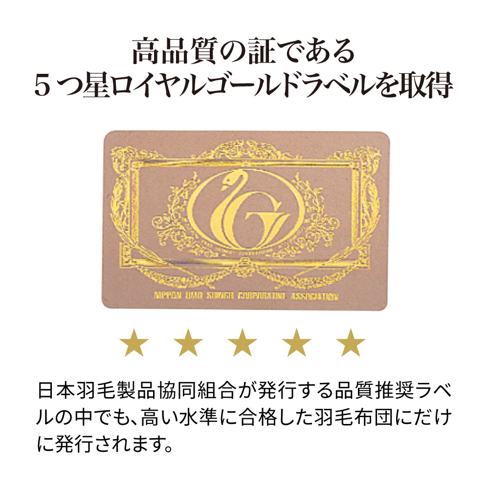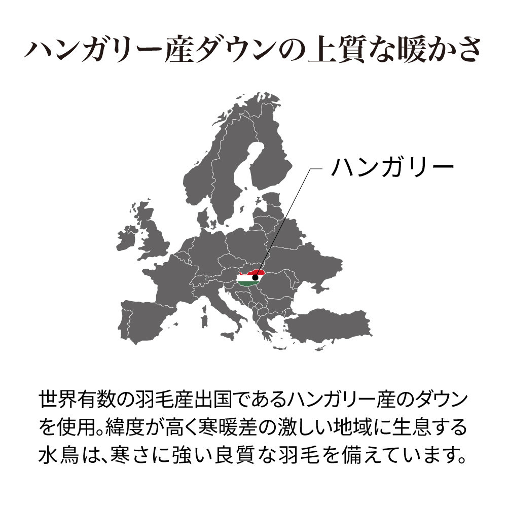 ハンガリー産高級羽毛をたっぷり使用した、コスパにも暖かさにも満たされる厳選羽毛布団。うれしい高額下取りサービスを付けたディノスだけの特別企画です。回収させていただいた羽毛布団は、貴重な資源として大切にリサイクルし、新たな製品へと生まれ変わります。手間とコストを抑えられるだけでなく、環境への貢献にもつながります。ハンガリー産ダウンの上質な暖かさ世界有数の羽毛産出国であるハンガリーは、“ダウンベルト”と呼ばれる北緯50度前後の高緯度に位置しており、寒暖差の激しいこの地域に生息する水鳥は、厳しい寒さに耐えるための良質な羽毛を備えています。ダウン率90%の上質な暖かさダウンはフェザーに比べて軽量で、繊維の隙間に暖かい空気をたっぷり含みます。通常、ダウン率50%で羽毛布団と呼べるところ、本品はダウン率90%の高品質羽毛布団なので、ふんわり軽く暖かな掛け心地になります。5つ星・ロイヤルゴールドラベル取得の贅沢なボリューム感ゴールドラベルは、日本羽毛製品協同組合が発行する品質推奨ラベルの中でも、高い水準に合格した羽毛布団にのみ発行されます。本品はその中でも5つ星・ロイヤルゴールドラベルを取得しており、同じ重量でもかさ高性に富んだ本品の羽毛は、軽くボリューミーで空気をたっぷり含むため暖かさも格別です。ふっくら感の違いは一目瞭然3つ星ラベル羽毛布団と比べると、ボリューム感にこれほどの違いが。このふっくら感により、軽く暖かな掛け心地を実現しています。かさ高性に富んだ高品質な羽毛を、シングルで約1.1kgも贅沢に使用。圧倒的なボリュームで、ずっと包まれていたいふっくら感と暖かさです。高級感のある軽量な側生地羽毛のふくらみをつぶさない、軽量でしなやかな側生地を使用。ふっくら包んで、羽毛本来の軽さと暖かさを引き立てます。