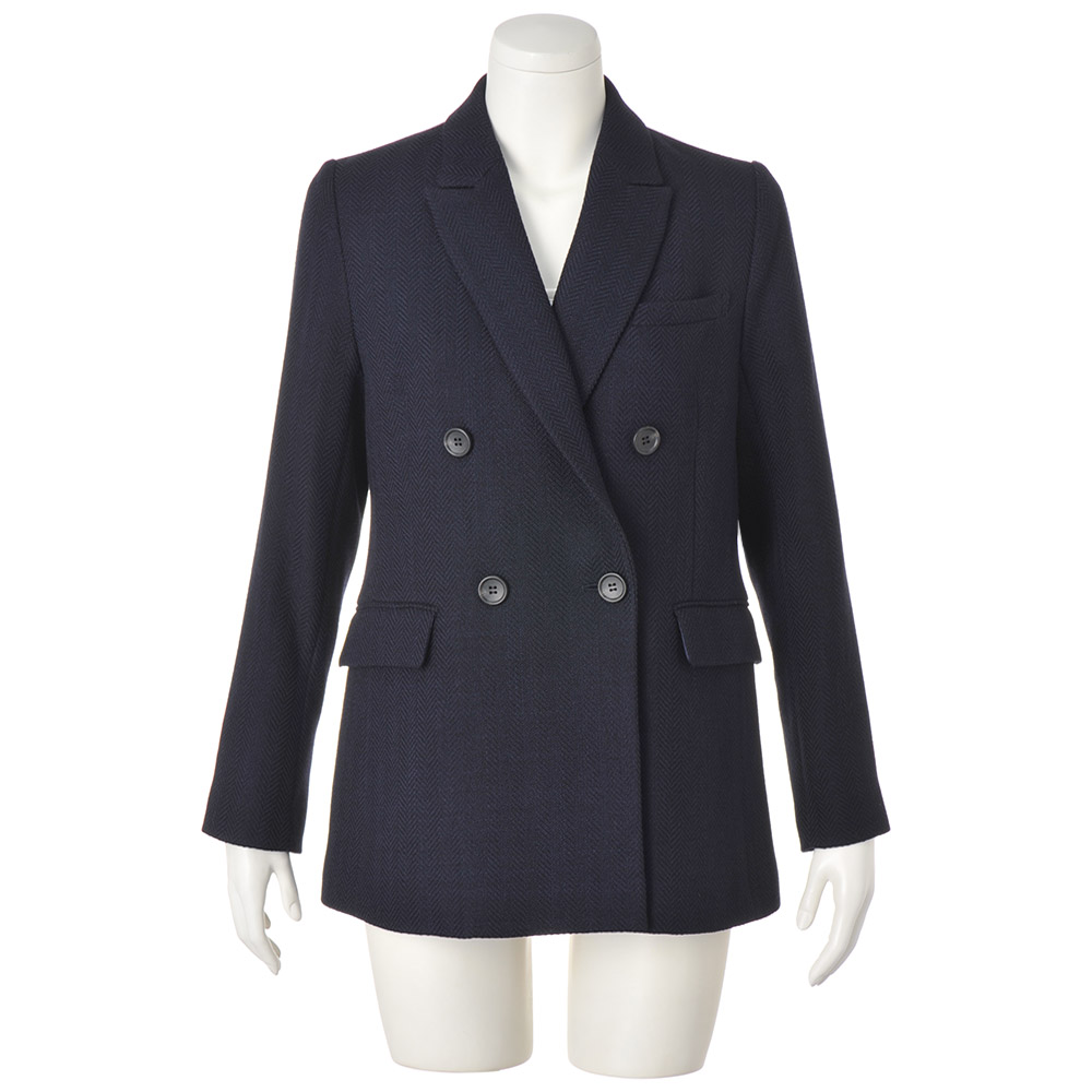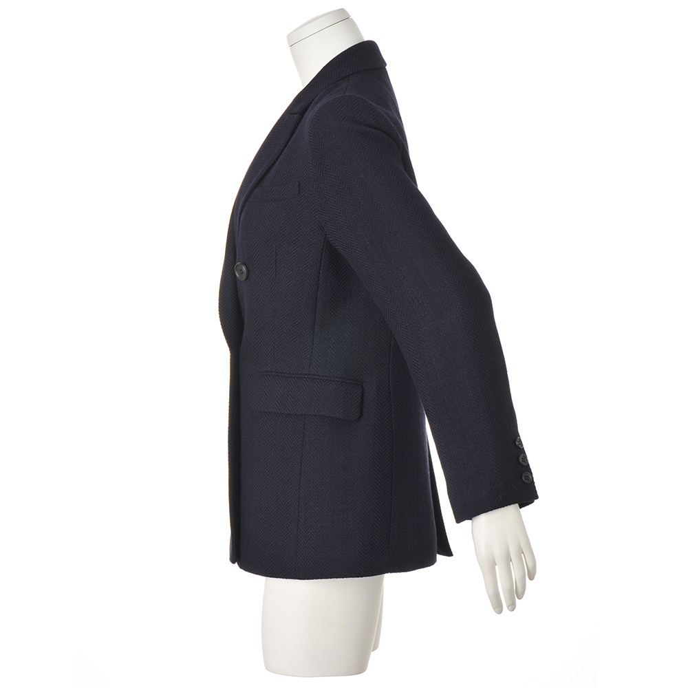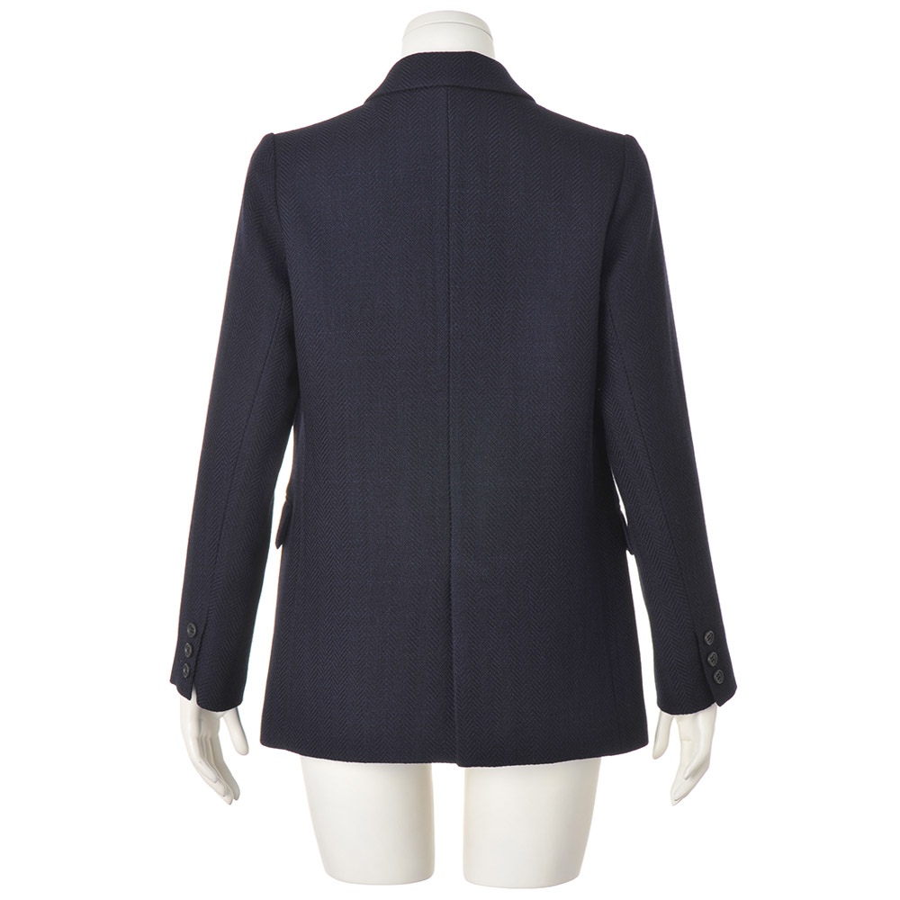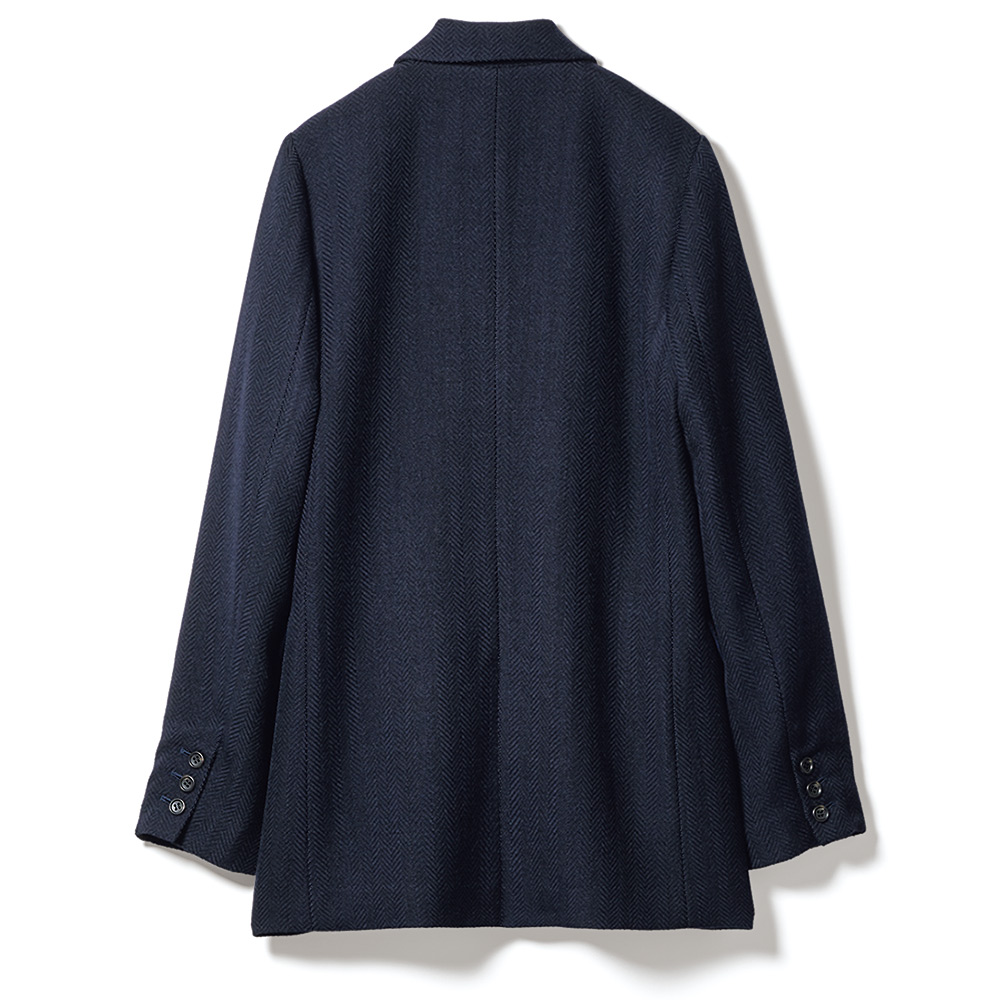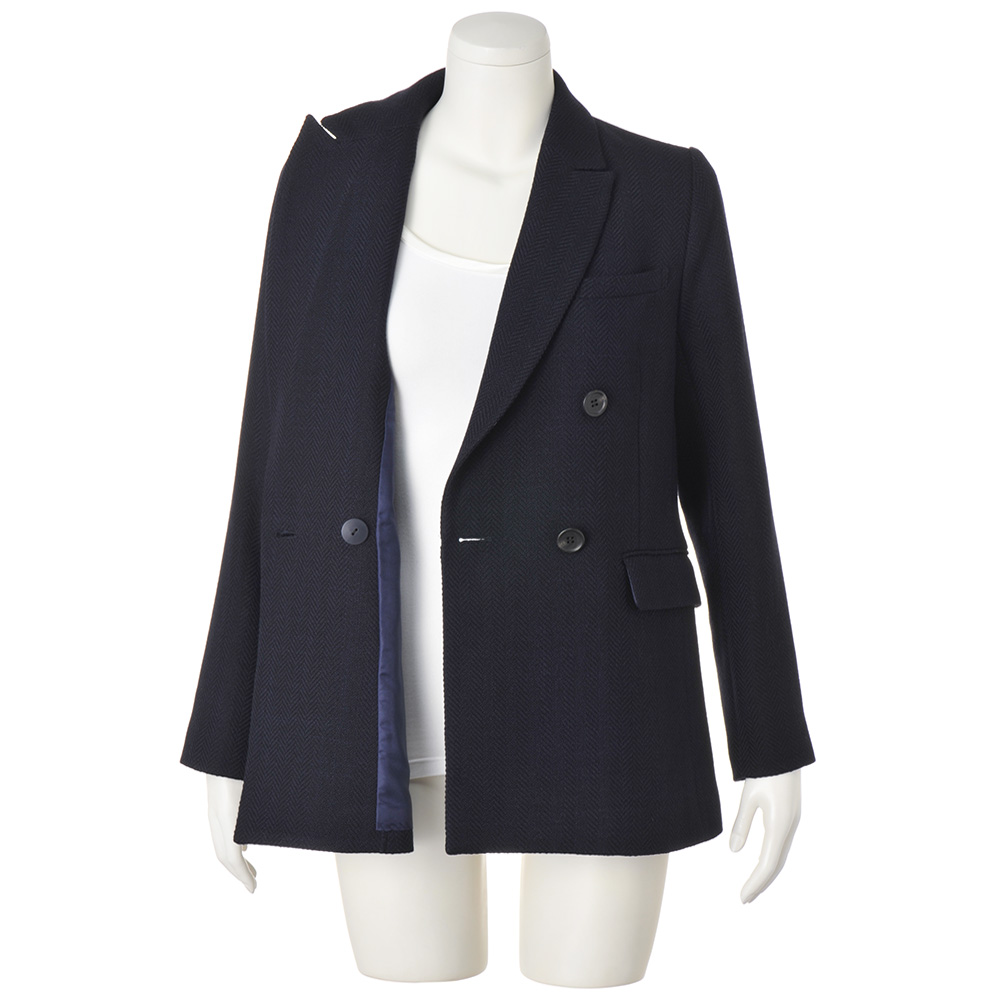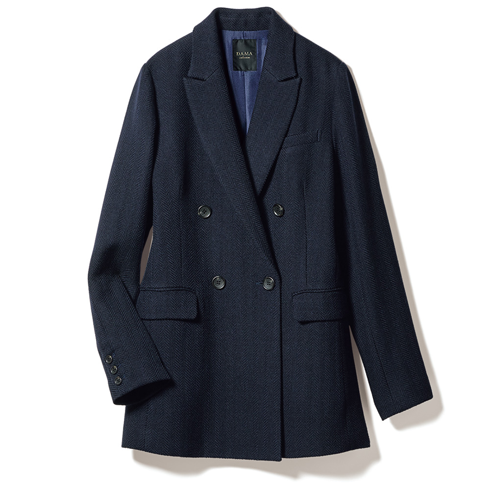 ELEGANCE CAREER 働く私を、軽やかに刷新!仕事だからと真面目すぎてはつまらない。冬も印象的な色や柄を軽やかに取り入れて、働く私をブラッシュアップ!信頼を与える凛々しいジャケットで。旬のネイビージャケットを更新するなら、Pコート感覚で着られる長め丈と程良くボクシーなシルエットで。ヘリンボーンの織り地から醸し出される凹凸感と艶感でひと目で上質とわかる素材は、なめらかな肌触りと仕立て映えに定評のあるイタリア「Bellandi」社製のウールコットン。膨らみ感のある柔らかな風合いが、マニッシュに仕立てられたジャケットに軽やかな着心地を授けます。顔周りにシャープさを添えるピークドラペル、重心を高く見せるボタン位置やフラップポケットなど、細部への拘りにも余念がありません。≫ POINTピークドラペル、ダブルブレスト、長め丈でキリリとかっこ良く。ウエストダーツを入れてボックスシルエットをすっきりと。