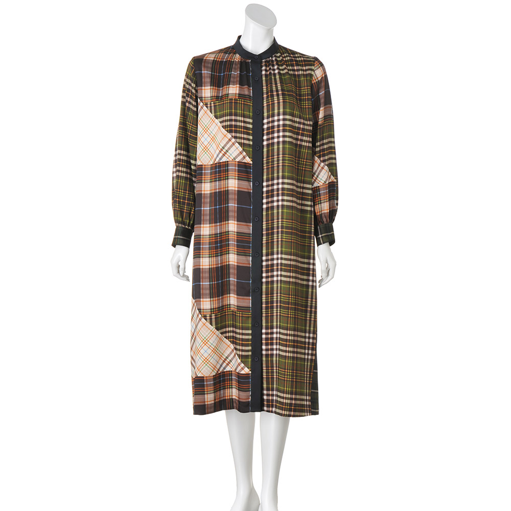 冬の旅に寄り添うスタイル。年末年始の帰省や温泉、ウィンタースポーツなど、冬の予定が気になる頃。印象的な素材感、色・柄の服を選んで、イベントをより輝かせて!エッジの効いたチェック柄でカジュアル上手に。一枚で着たり、インナーを重ねたり、羽織ったり。季節に合わせて着こなしを楽しめ、モードな存在感を放つシャツワンピースがあれば、日常でも旅行でもお洒落に自信が持てるはず。ほのかな光沢感とドレープ性が柄に表情を与えるポリエステルツイルのプリント生地は、イタリア「ERICA」社らしいファッショナブルな新作。数種類のチェック柄がコラージュされたデザインが、柄行きと配色の絶妙なバランスで品良くまとめ上げられています。柄が個性的な分、形はシンプルに徹して着こなしやすく。ネックラインと前立てに配した無地ネイビーがシャープな引き締め役です。≫ POINTアシンメトリーな配置、グリーン系にきれい色を効かせた洗練配色は、さすが「ERICA」社。