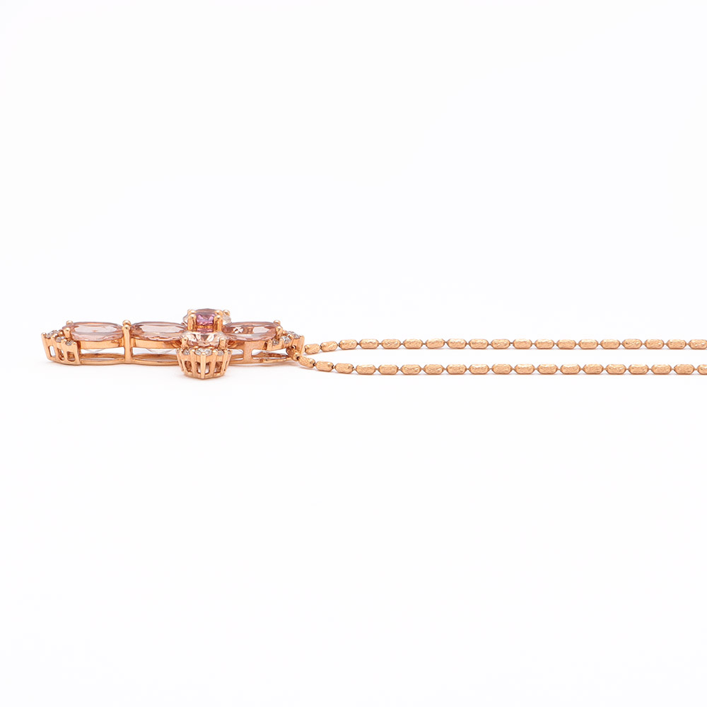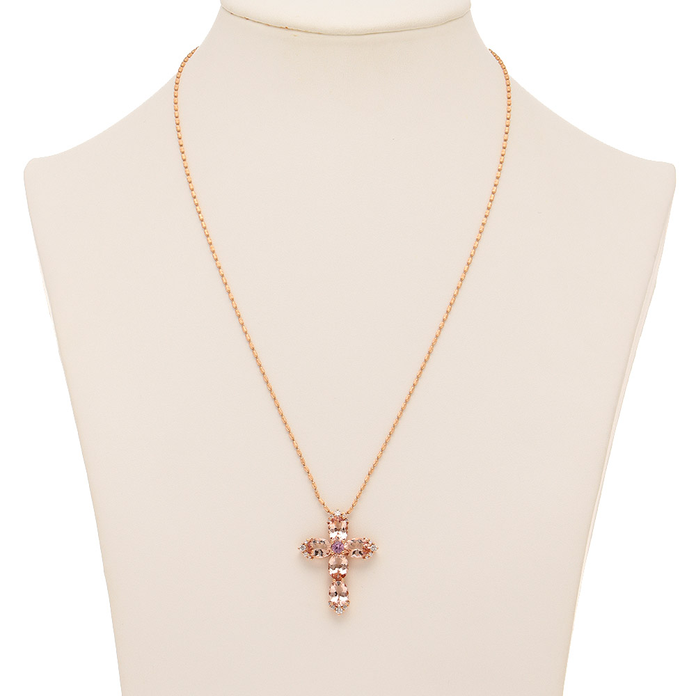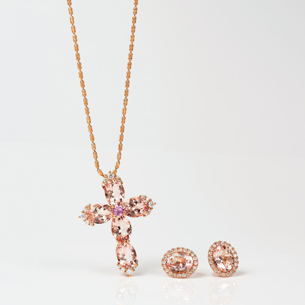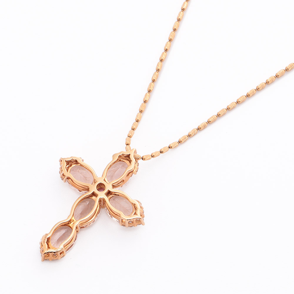 私らしさを色石に託して色のパワーと地球のエナジーを抱くカラーストーンには、気持ちに効く「気」が宿っています。「なりたい自分」を色石に映して、お洒落を楽しんでみませんか?「愛の石」とも言われ、桜色に輝くモルガナイト。 ピンクサファイアをポイントにたっぷりのモルガナイトで形作った贅沢なクロス。