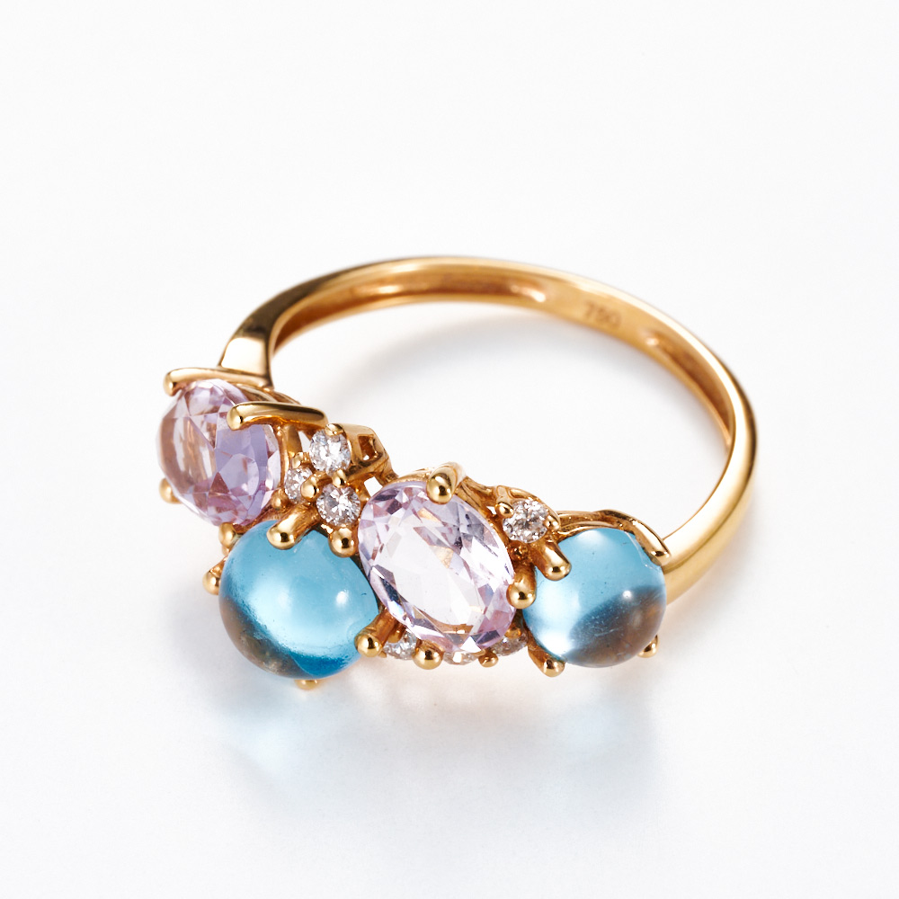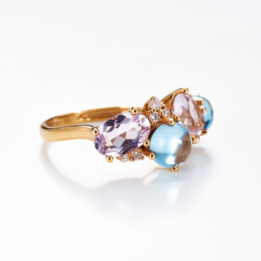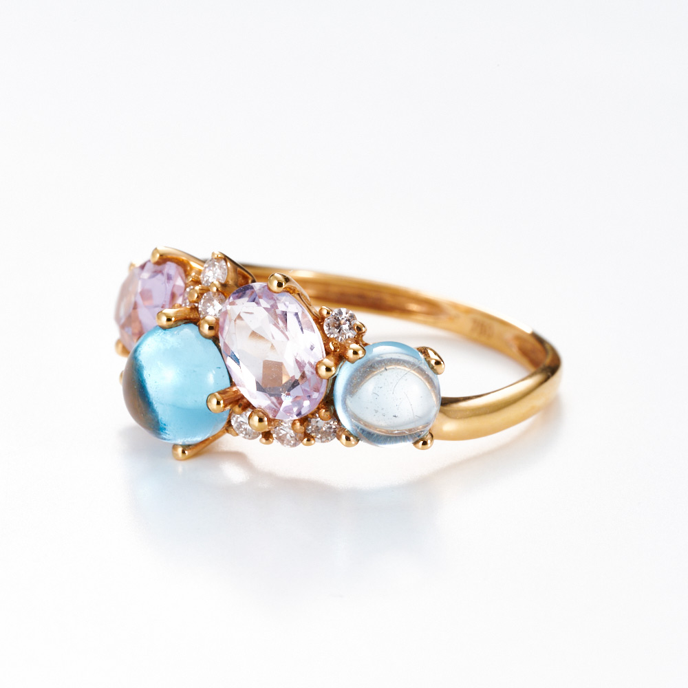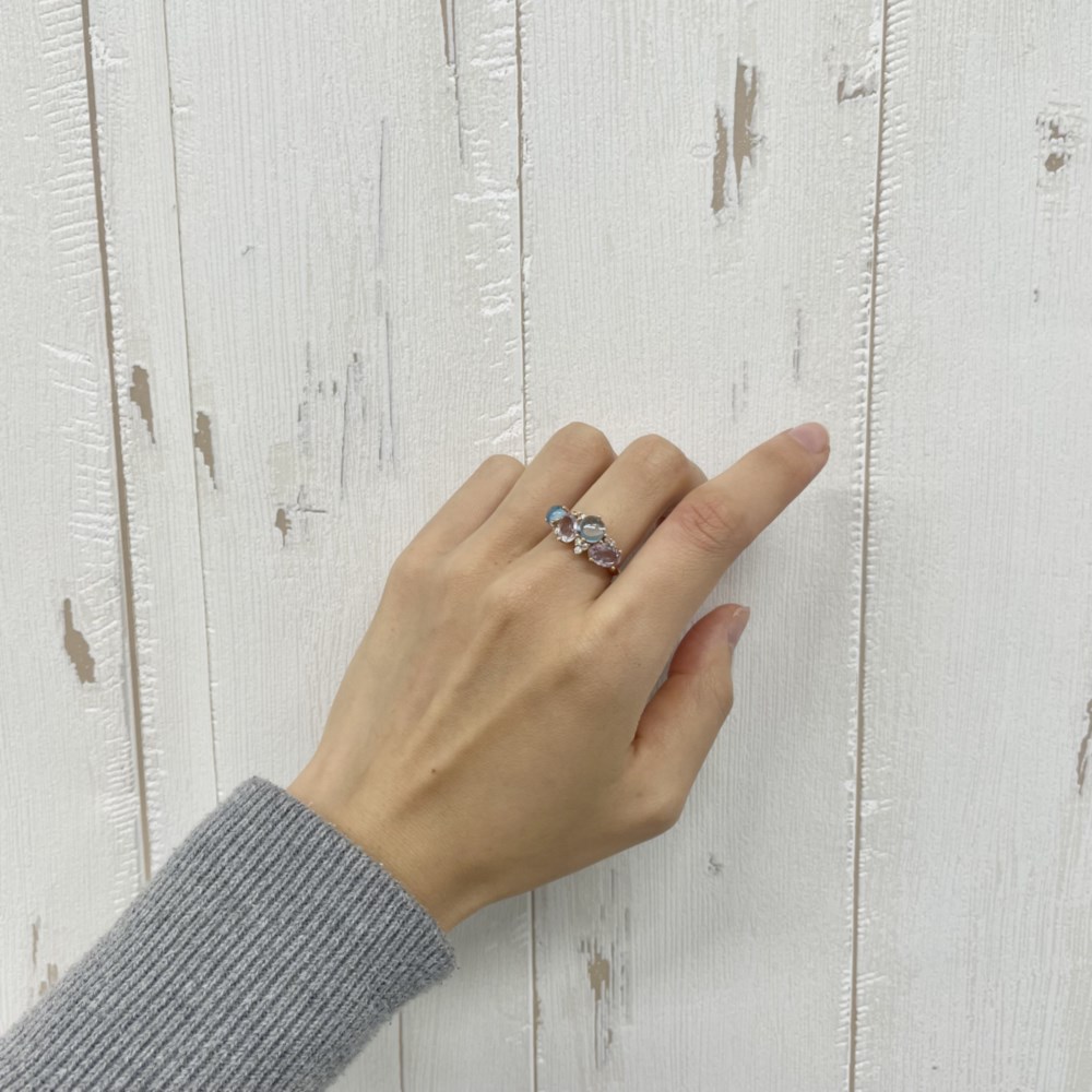 ピンクカラーと正反対のブルーカラーを組み合わせた洗練されたデザインリング。カボションカットのブルートパーズとカットされたピンクアメジストの表情が個性的で存在感あふれるジュリーです。