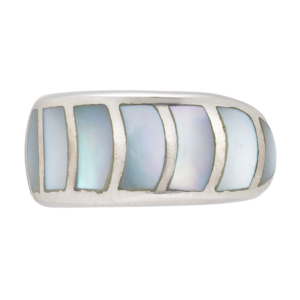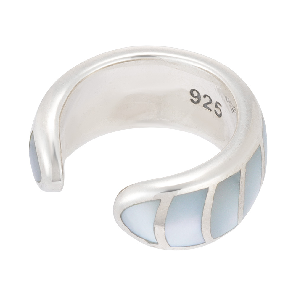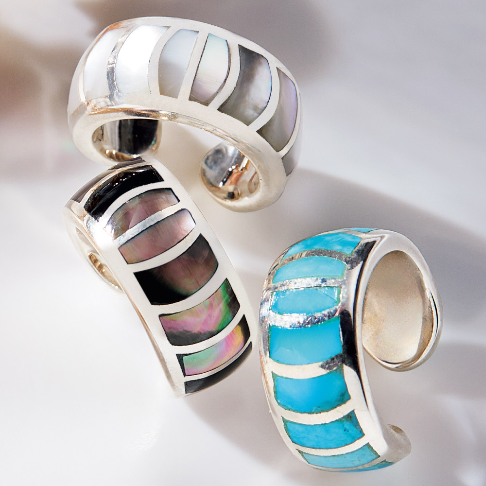 贅沢な遊び心に魅了される拘りのシルバージュエリートレンドに敏感な「アンティエーレ」のシルバージュエリー。着け心地のよい甲丸フォルムのイヤーカフ。シェルやターコイズを象嵌風にセット。色と質感のコントラストが、アクセント効果を発揮します。
