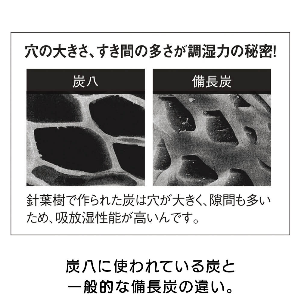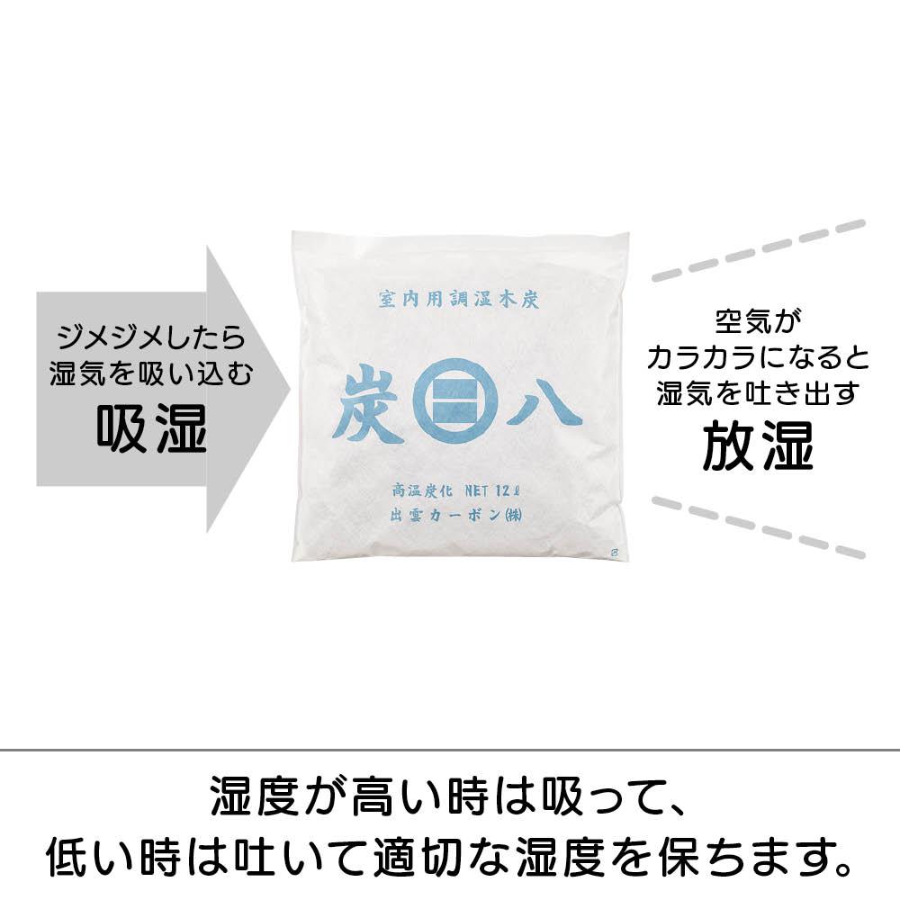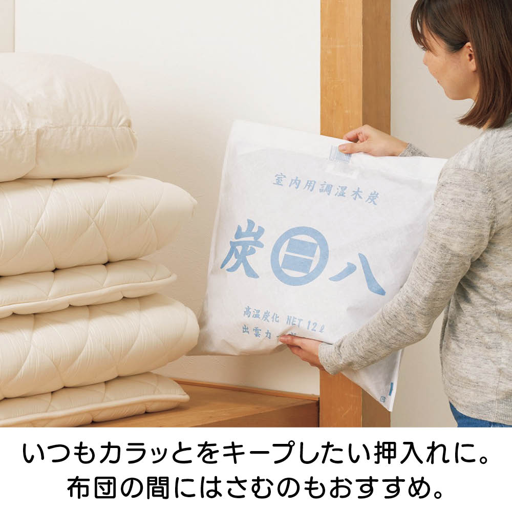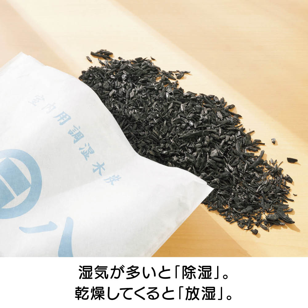 湿気の高い出雲で生まれた調湿木炭。備長炭より優れた調湿力がうれしい!もともとは建材用として床下や天井に使われていた、プロ仕様の実力です。押入れやベッド下など、湿気が気になる場所に置くだけの手軽さが魅力です。SNSで人気の暮らしコーディネーター・瀧本真奈美さんも絶賛・愛用中! 「干したり交換したりする必要がなく、置くだけなのがラク! クローゼットで長期間保管している服のニオイが気にならなくなりました。0.4リットルサイズはカビやすい玄関のシューズボックスに入れています。」