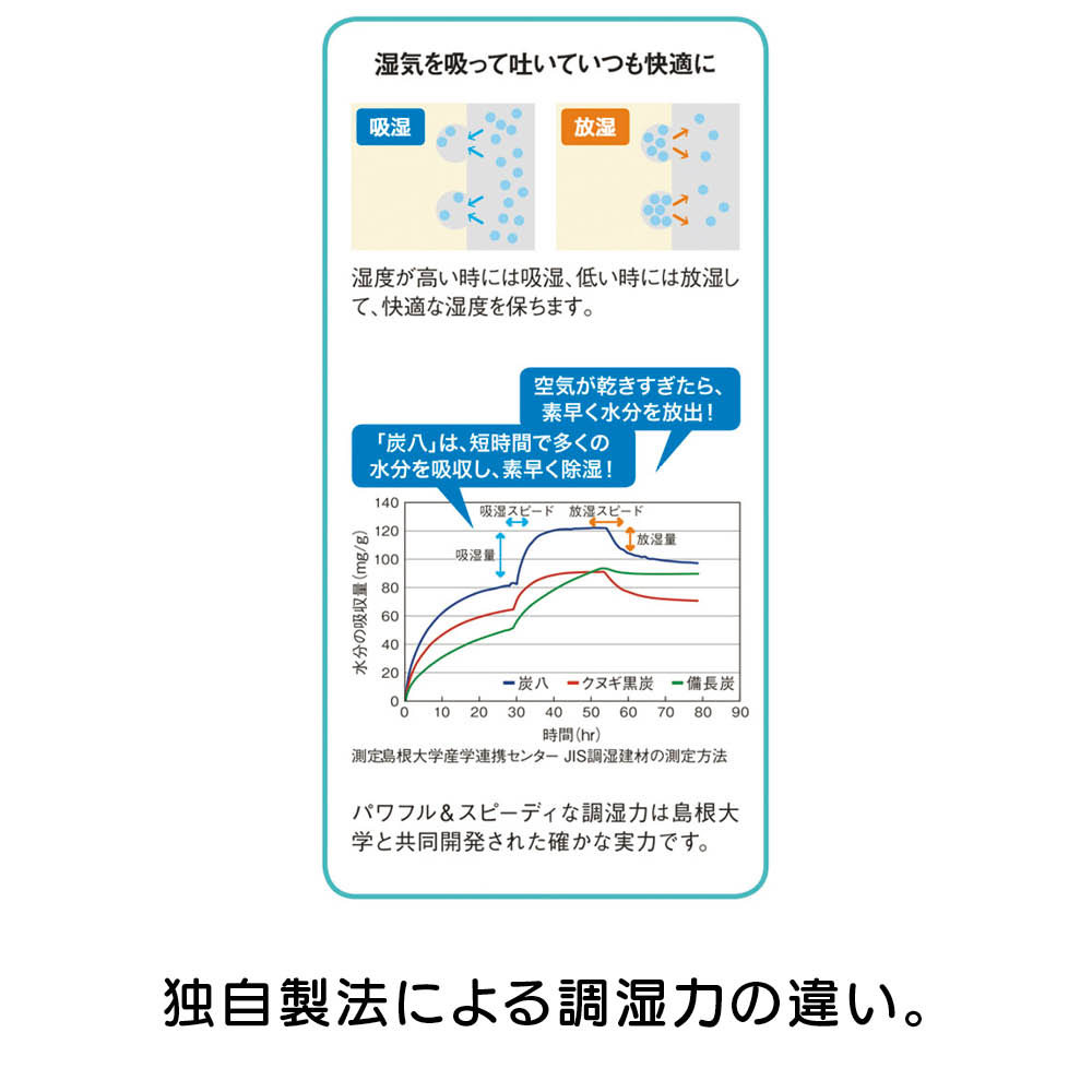 空気の湿度に応じて水分を吸収⇔放出を繰り返す「調湿」ができるので、除湿剤より高機能です。