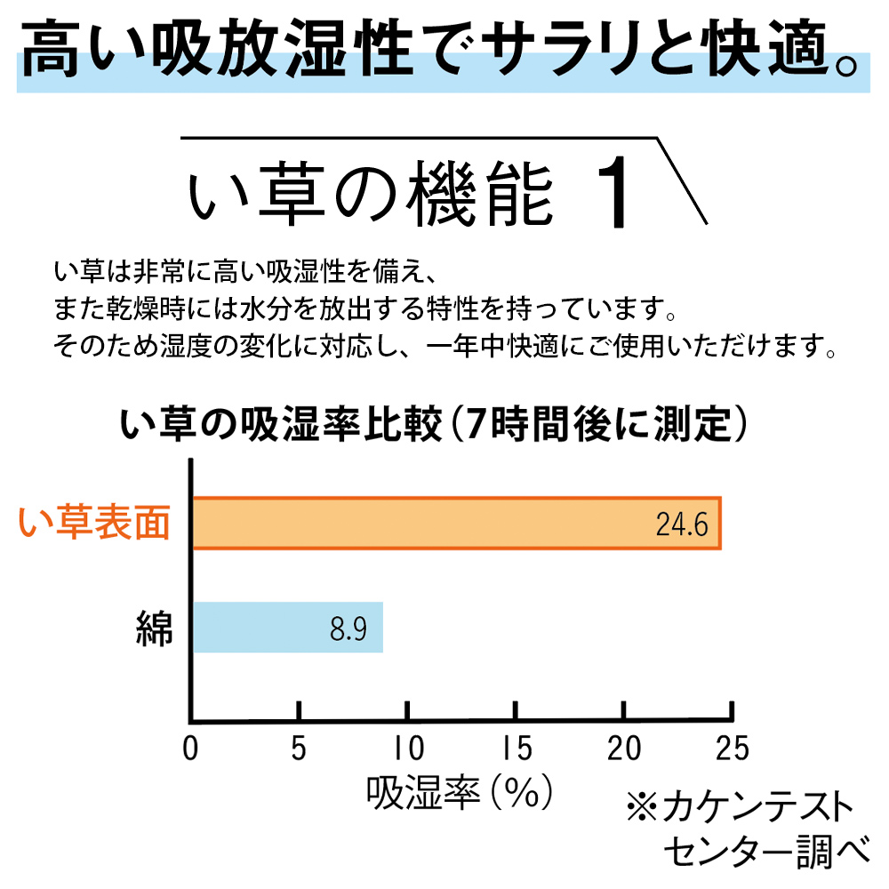 手間ひまかけて織り上げられる美しい色合いの市松模様のい草ラグをお好みのカラーで。天然の青森ひば加工を施し、夏にうれしい抗菌・防臭の機能も備えました。上質な九州産い草の優れた機能で、日本の暑い夏を安心・快適に【い草の機能1】ジメジメを防いでくれます。い草は非常に高い吸収性を備え、また乾燥時には水分を室内に放出する特性を持っています。湿度の変化に対応し、優れた湿度調整機能を発揮するので、一年中快適にご使用いただけます。【い草の機能2】空気環境を整えてくれます。内部の表面積が広くスポンジ状になったい草が呼吸することで、空気中の二酸化炭素やホルムアルデヒドを吸着します。また汗やペット臭などの原因物質も抑え、気持ちいい空気環境をつくってくれます。